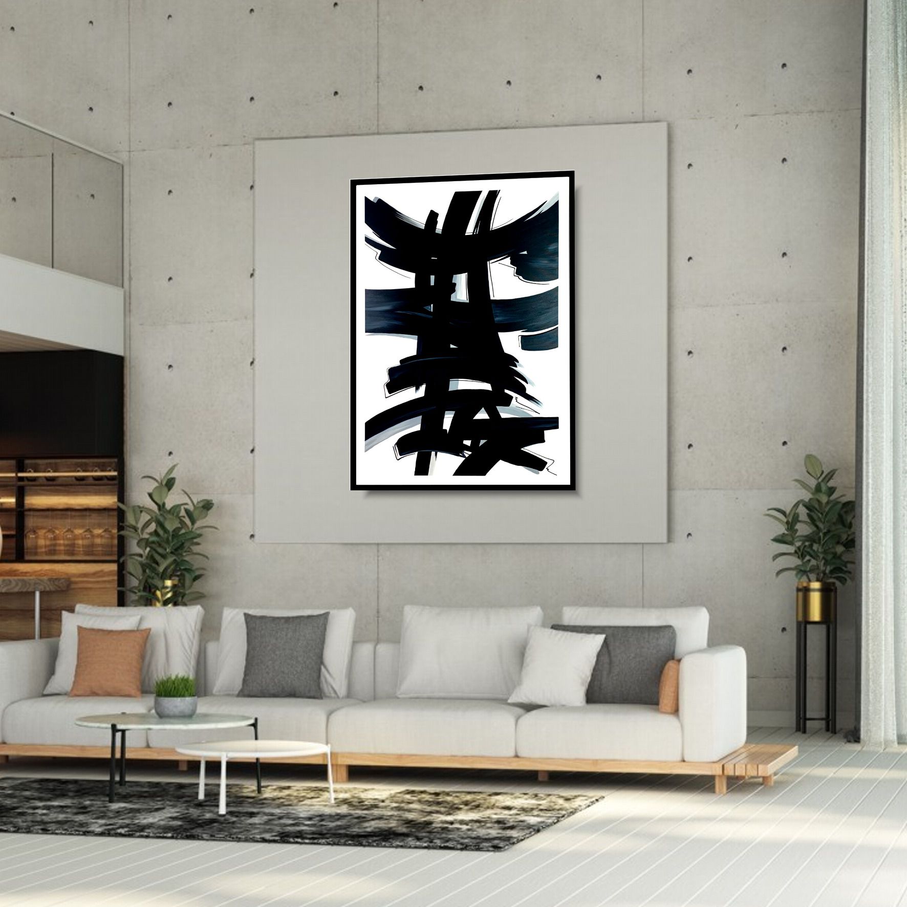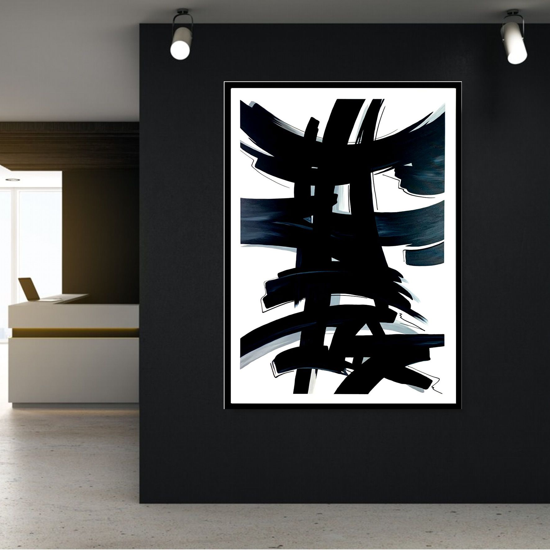 Czarno biały obraz w ramie abstrakcja „Japoński znak” w minimalistycznej czarno-białej kolorystyce i w czarnej matowej ramie. Idealnie pasuje do modnego wnętrza takiego jak salon, sypialnia, przedpokój czy biuro. Obrazy abstrakcyjne to nasza specjalność dlatego tworzymy w dzieła w doskonałym guście i zgodnie z najnowszymi trendami. Każdy obraz to ciekawa dekoracja lub niebanalny pomysł na prezent. Posiadamy wiele modnych wzorów obrazów oraz klasycznych sprawdzonych motywów. Gdyby jednak zamarzyło się Państwu coś zupełnie odmiennego – malujemy obrazy na zamówienie, portret na zamówienie, obrazy kwiaty, obrazy abstrakcje obrazy postacie. Możemy stworzyć także niepowtarzalną abstrakcję w dowolnym wymiarze, kolorystyce i z oryginalnym wzorem. Możemy scalić w jeden obraz kilka wzorów lub podzielić obraz jednoczęściowy na kilka mniejszych części. Masz jakiś pomysł? Zapraszamy do kontaktu!
