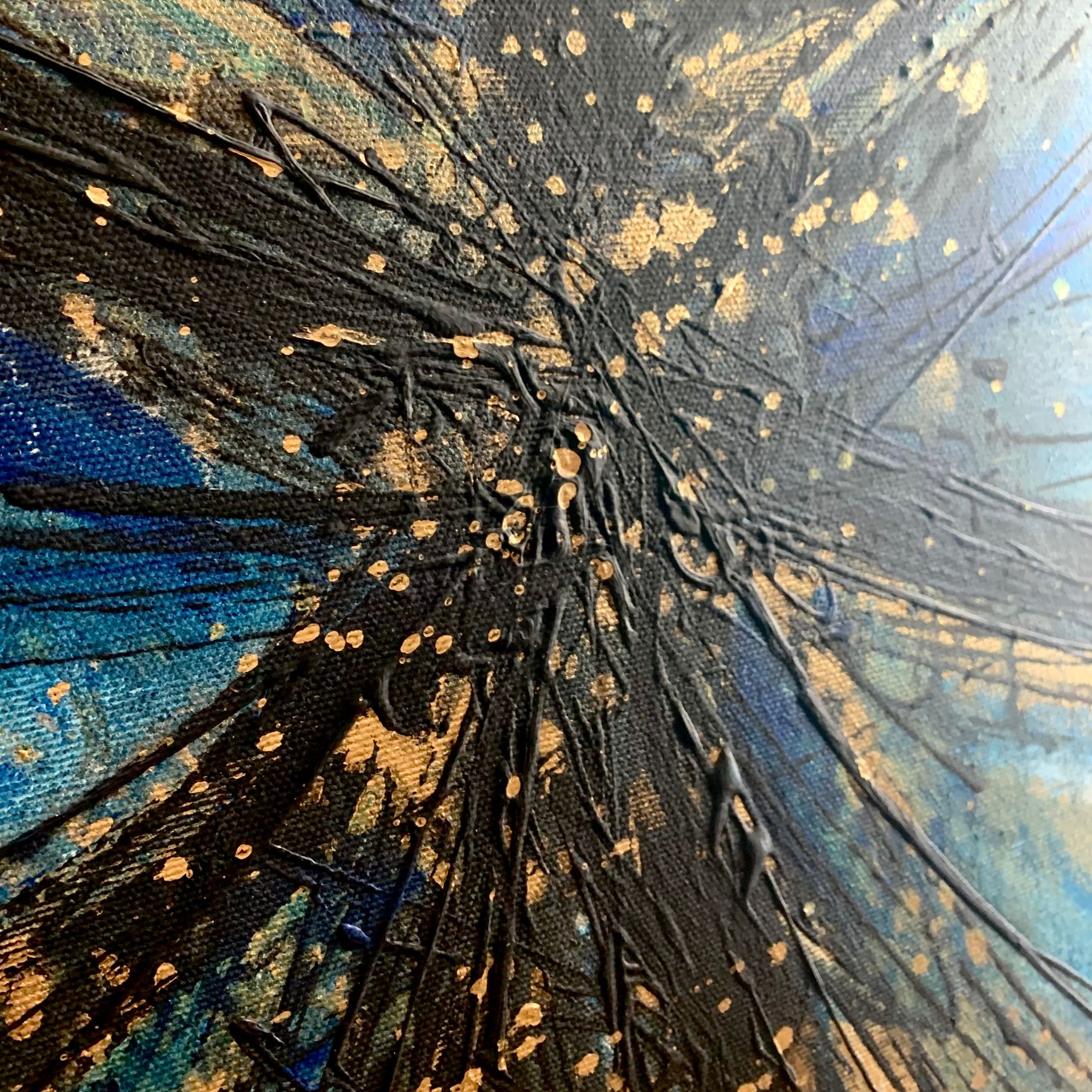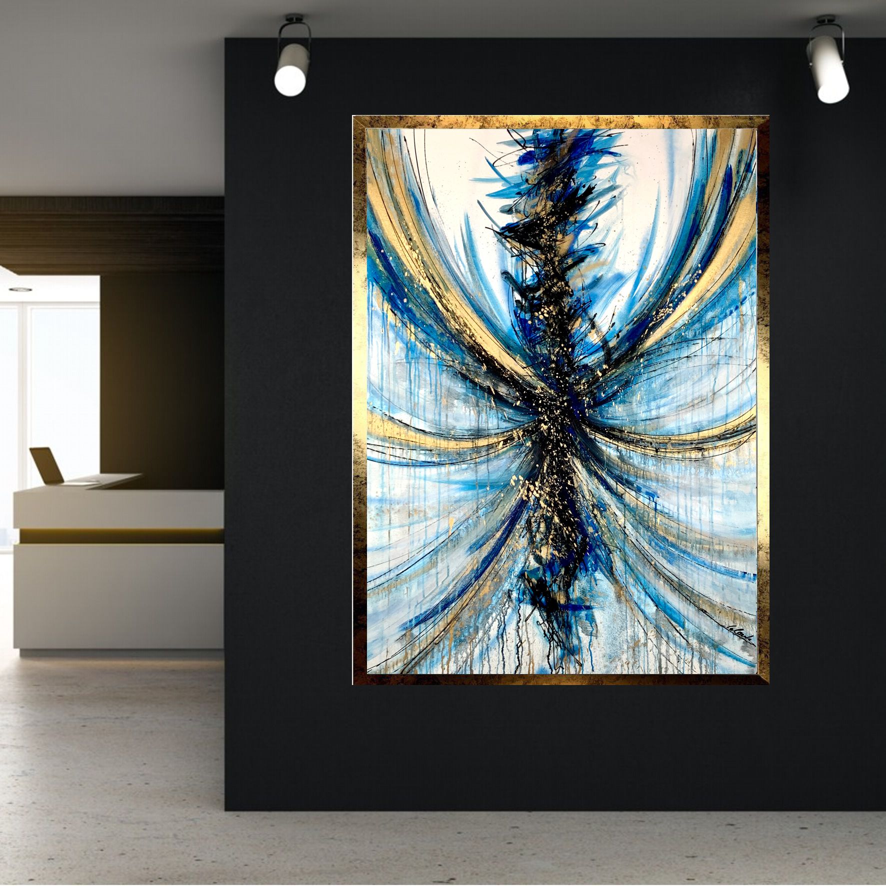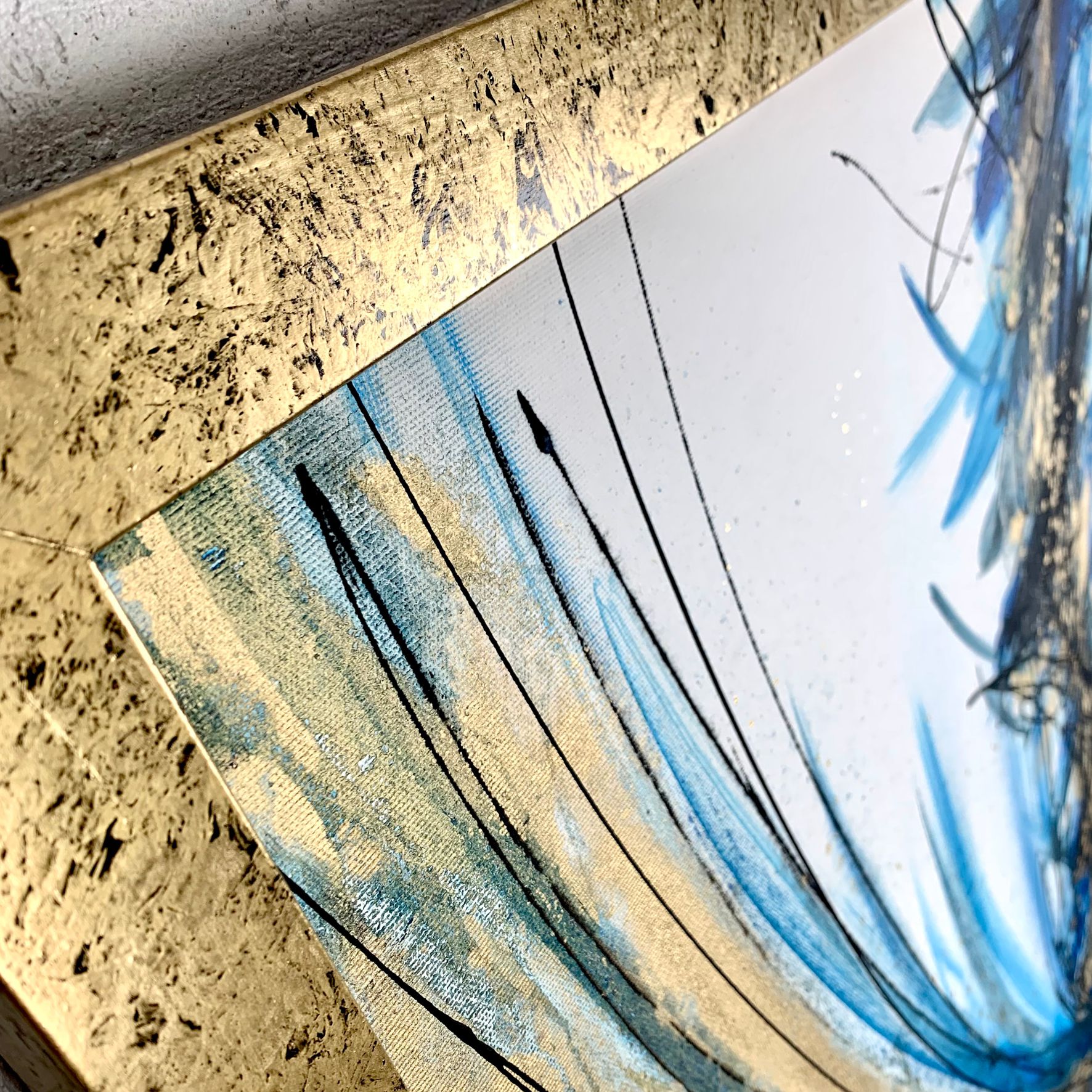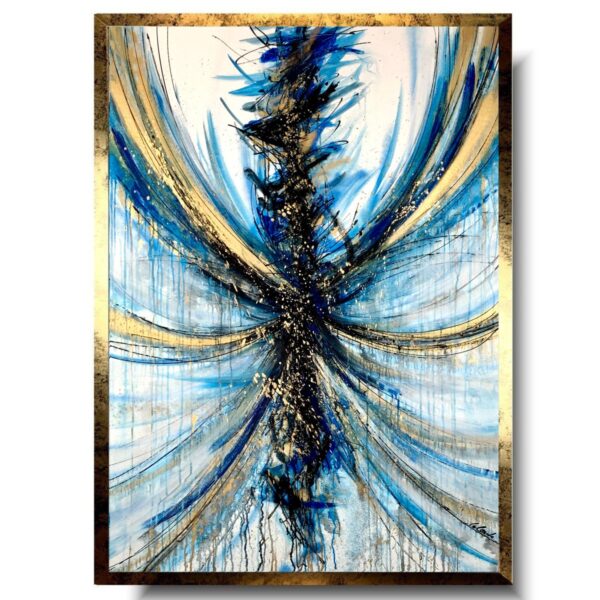 Obraz ręcznie malowany na płótnie „Granatowa fantazja” 2014A. Tajemnicza abstrakcja w odcieniach granatowo-złotych, otoczona elegancką, złotą ramą. Ten niepowtarzalny obraz stanowi połączenie intensywnych kolorów i artystycznego wyrażenia. Abstrakcyjne formy wyróżniają się na tle głębokiego granatu, tworząc dynamiczny i hipnotyzujący efekt wizualny. Przecierana złota rama dodaje szlachetności i wspaniałego wykończenia, podkreślając unikalność tej kompozycji. To prawdziwe dzieło sztuki, które wprowadza w zachwyt i wzbudza ciekawość. Zamknij oczy i pozwól sobie oddać się fascynacji tą wyjątkową abstrakcją granatowo-złotą, która doskonale dopełni każde wnętrze, dodając mu wyjątkowego charakteru i elegancji.
