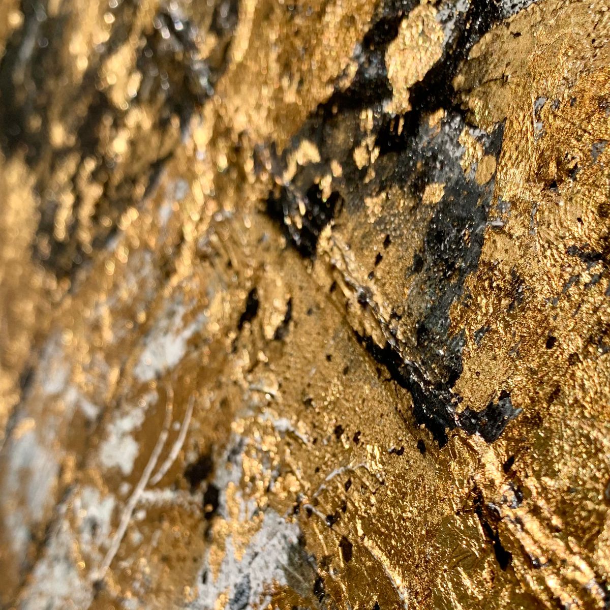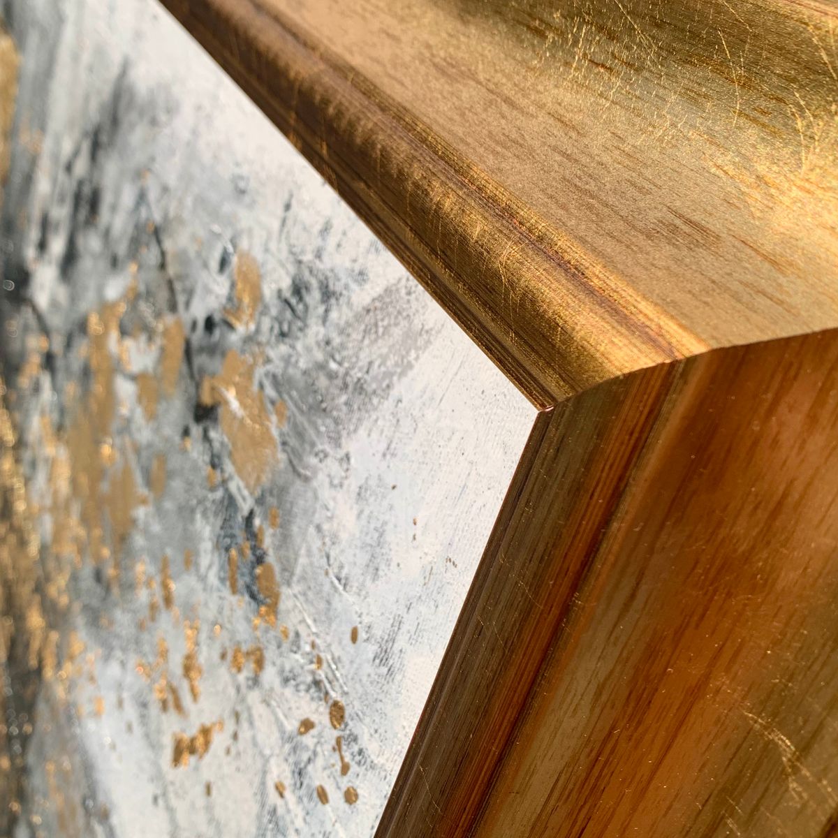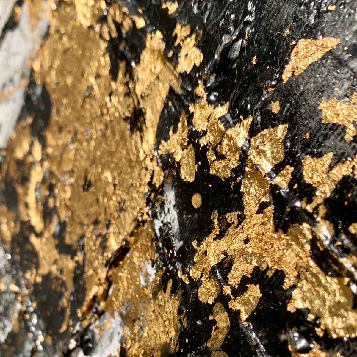 Kolorystyka obrazu: biały, czarny, szary, złoty + płatki złota + gruba złota rama (szerokość listwy 7cm)