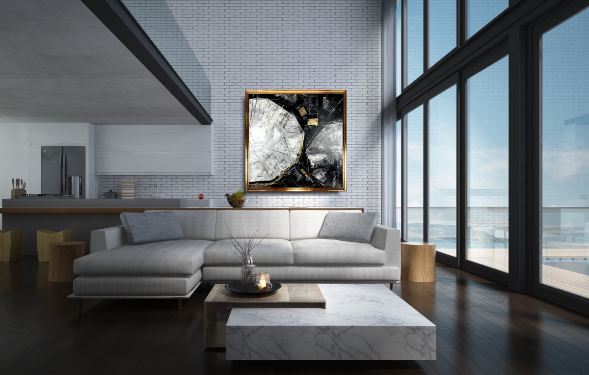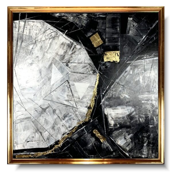 Duży obraz w złotej ramie „Trójkąty i kwadraty” abstrakcja 2104A to ogromny kwadratowy obraz naszego autorstwa w modnej, eleganckiej kolorystyce i złotej ramie. Kolory użytej farby akrylowej dodają elegancji, a wszystko wzbogacają płatki złota. Piękna złota gruba rama sprawi, że obraz będzie prezentował się perfekcyjnie w każdym wnętrzu – nowoczesnym i klasycznym. Obraz idealnie ozdobi duży nowoczesny salon czy modne biuro. Połączenie szarości i złota jest duetem ponadczasowym dlatego gwarantujemy, że nie wyjdzie z mody.  Wykonujemy obrazy marynistyczne, obrazy kwiaty, obrazy aniołów, obrazy dzielone – dyptyk, tryptyk, fortyk, obrazy jednoczęściowe w dużym formacie. Możemy namalować każdy obraz z naszej oferty w zmienionych wymiarach lub kolorystyce. Możemy namalować obraz dzielony na jednej części lub obraz jednoczęściowy podzielić na kolka części.