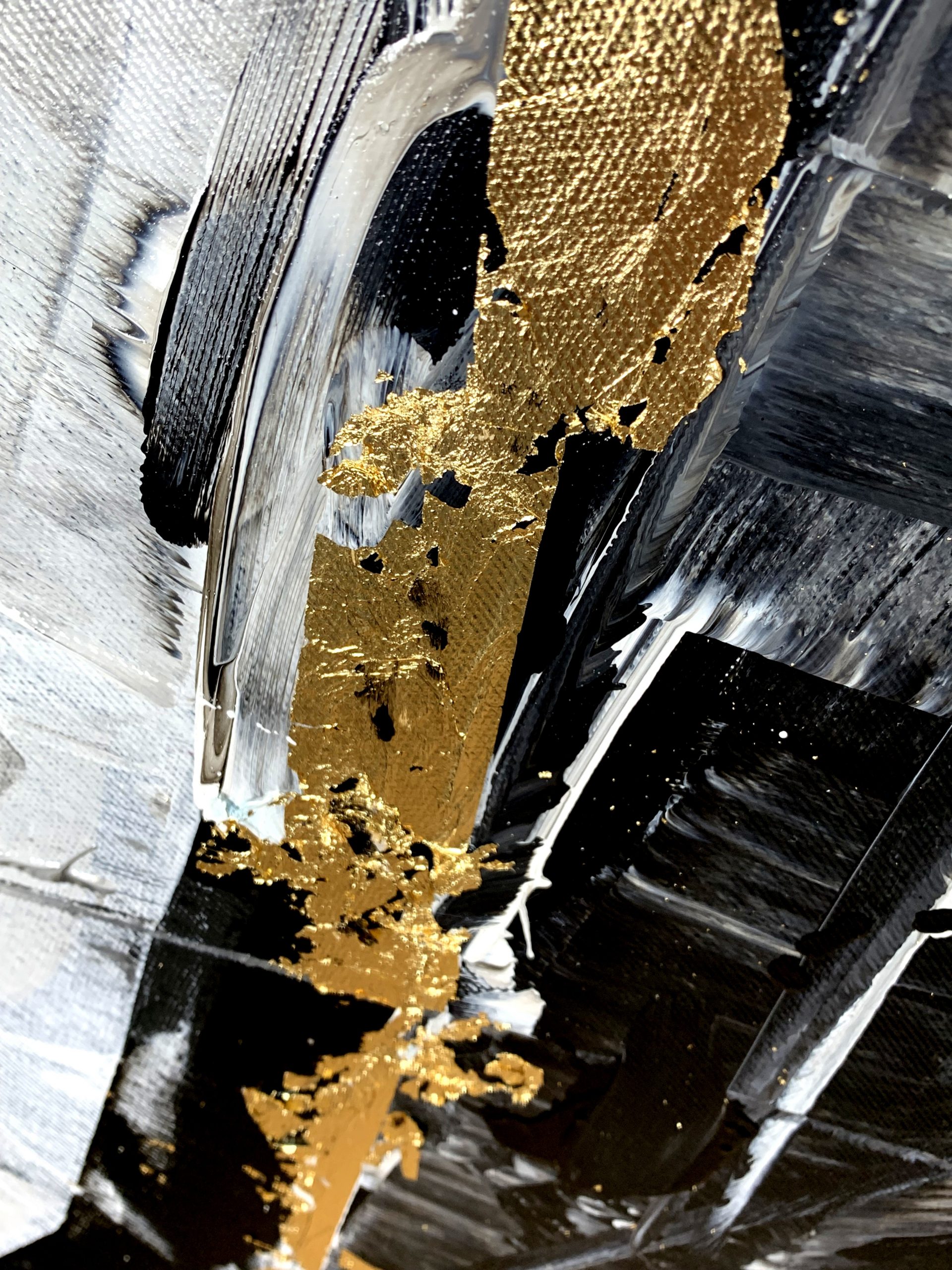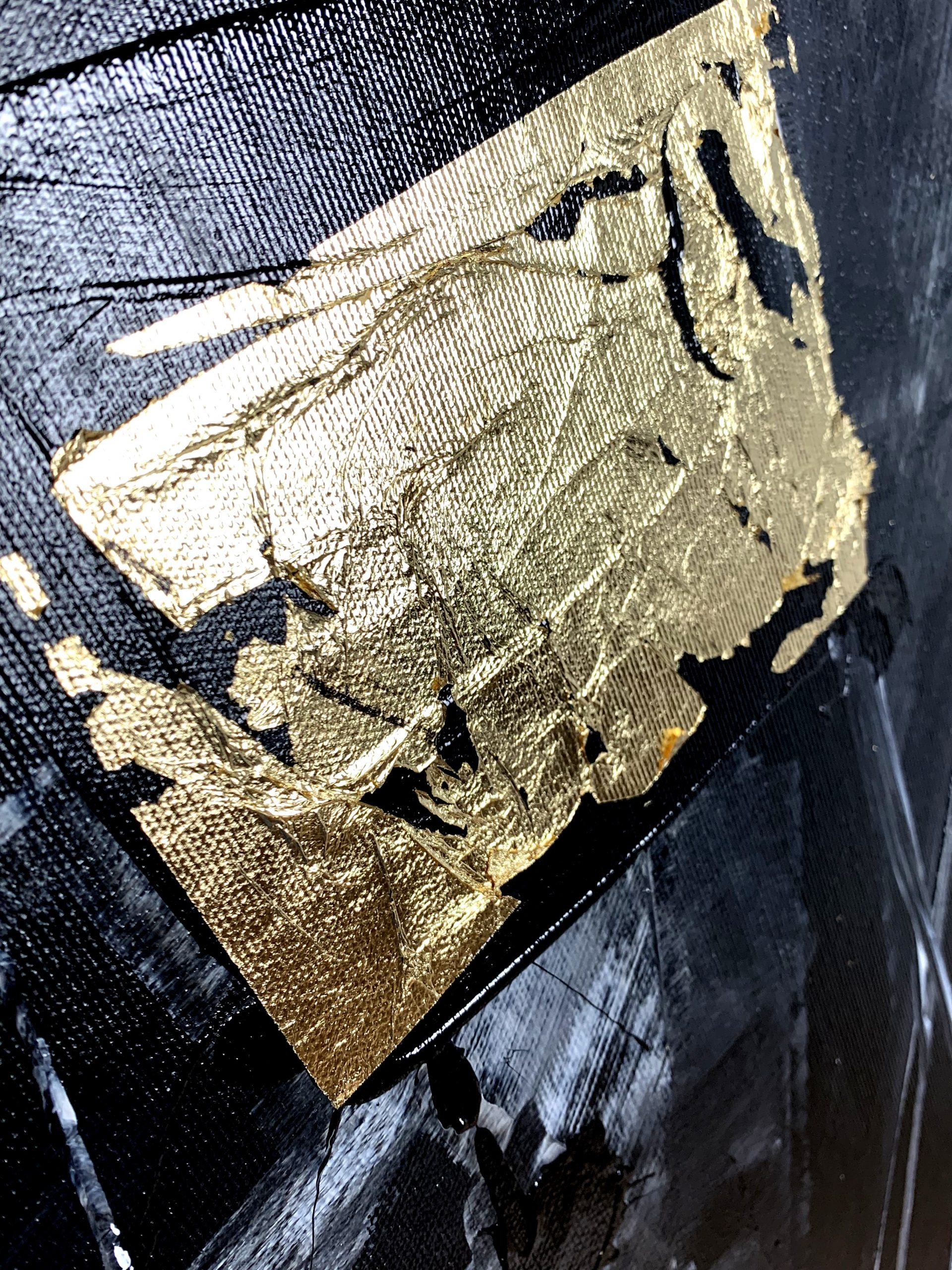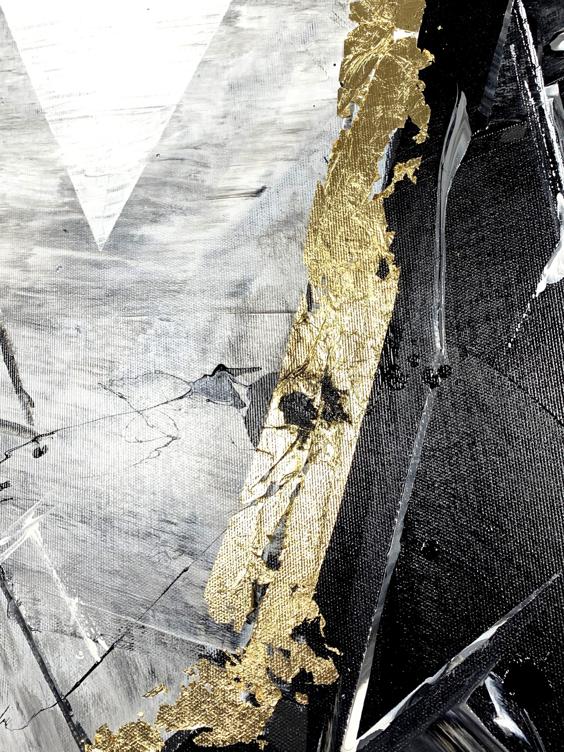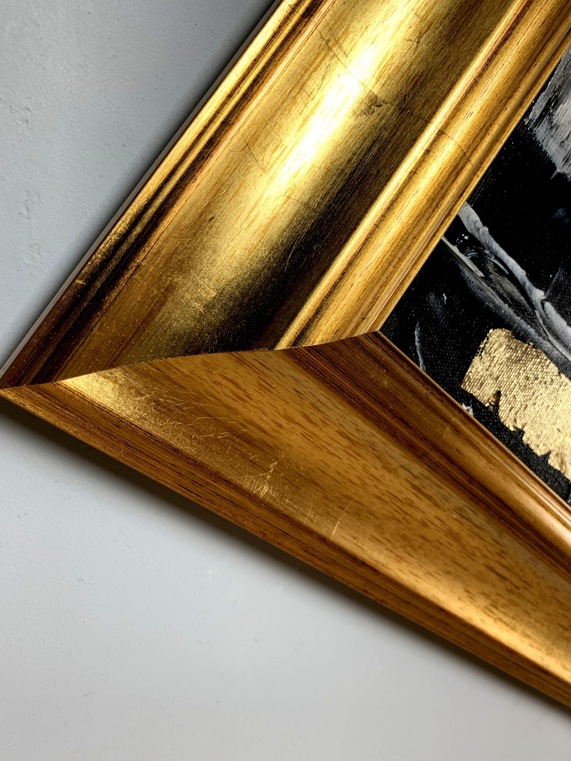 Kolorystyka obrazu: szary, biały, czarny + płatki złota + rama (szerokość listwy 7cm)