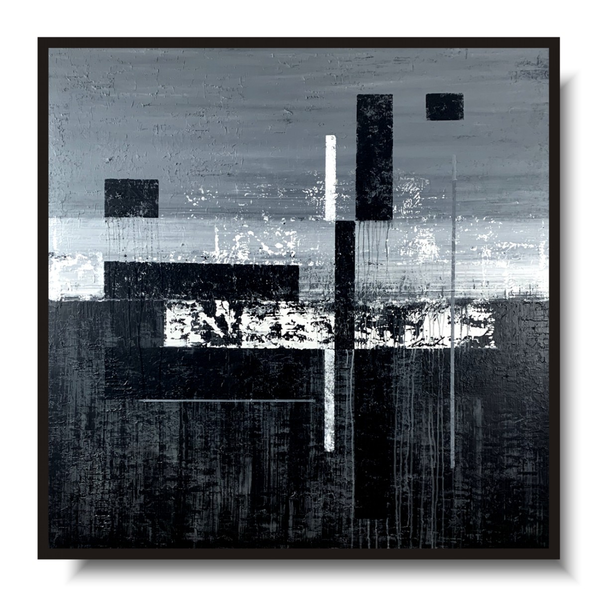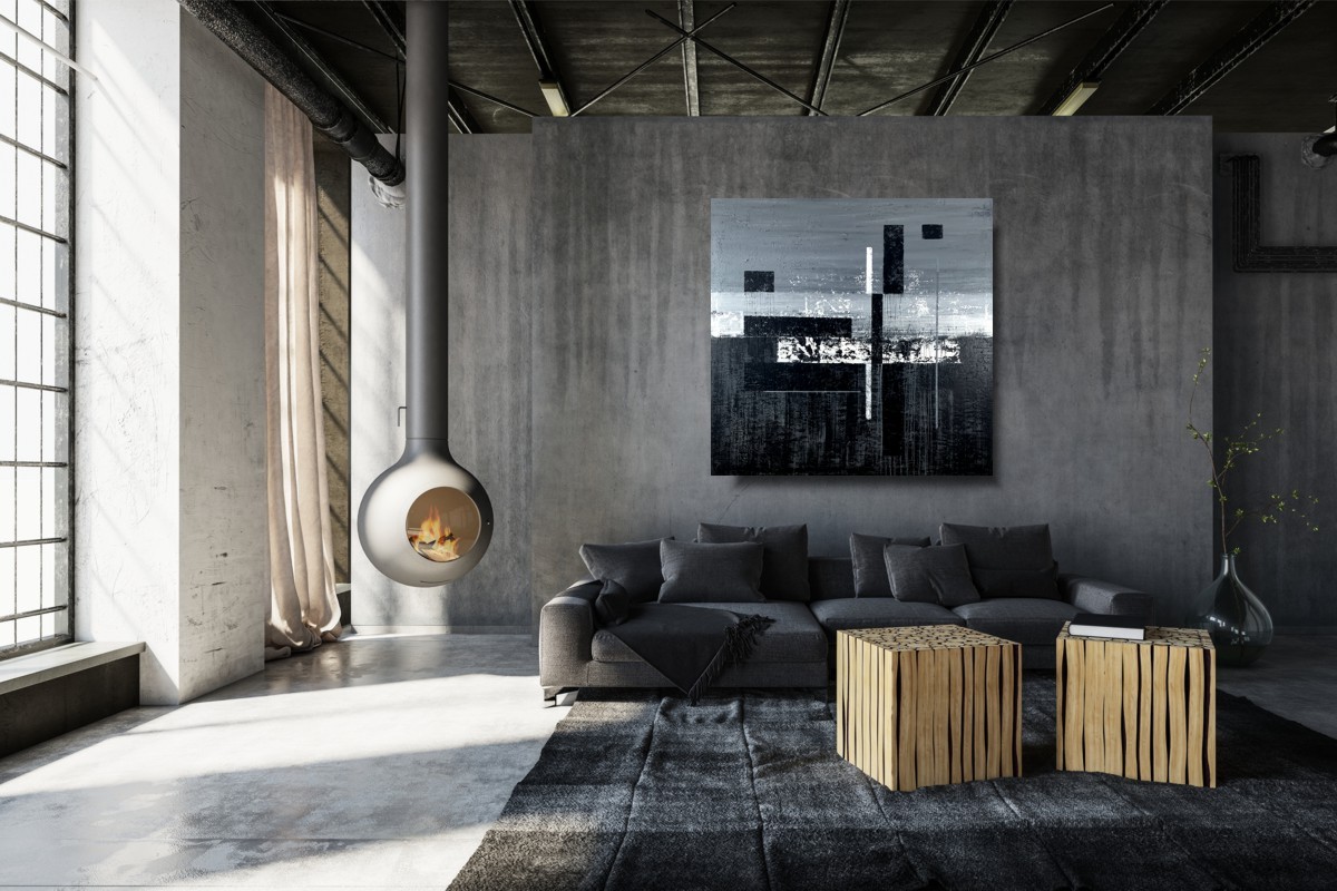 Duży obraz czarno biały autorska kolekcja 2096A to czysta synteza formy. Artysta wprowadzając w płaszczyznę obrazu pionowe i poziome podziały tworzy pewnego rodzaju rytmy. Chłodna szarość i czerń staje się tłem dla równoległych pasów, dających złudzenie niedokończonego labiryntu.
