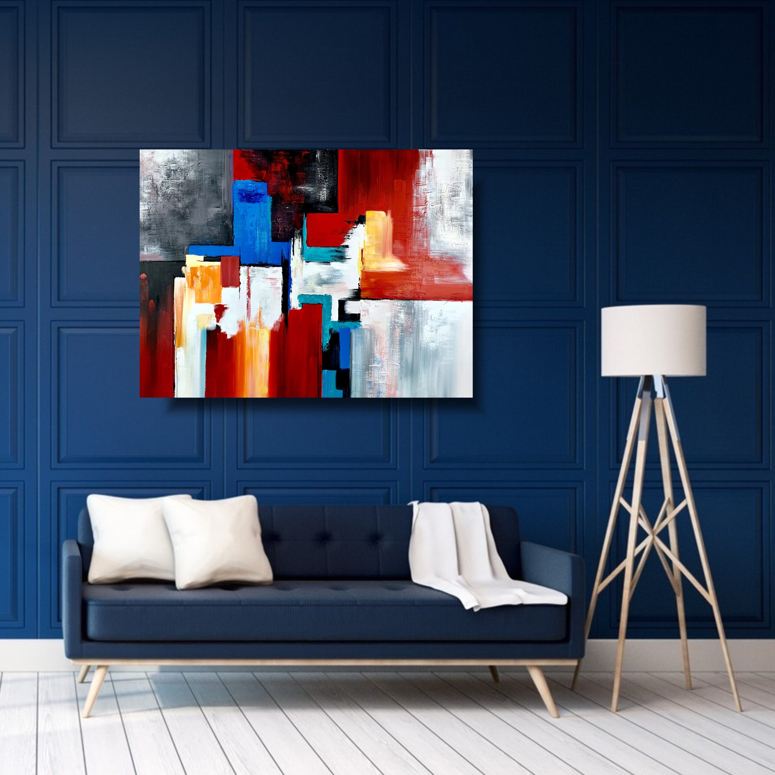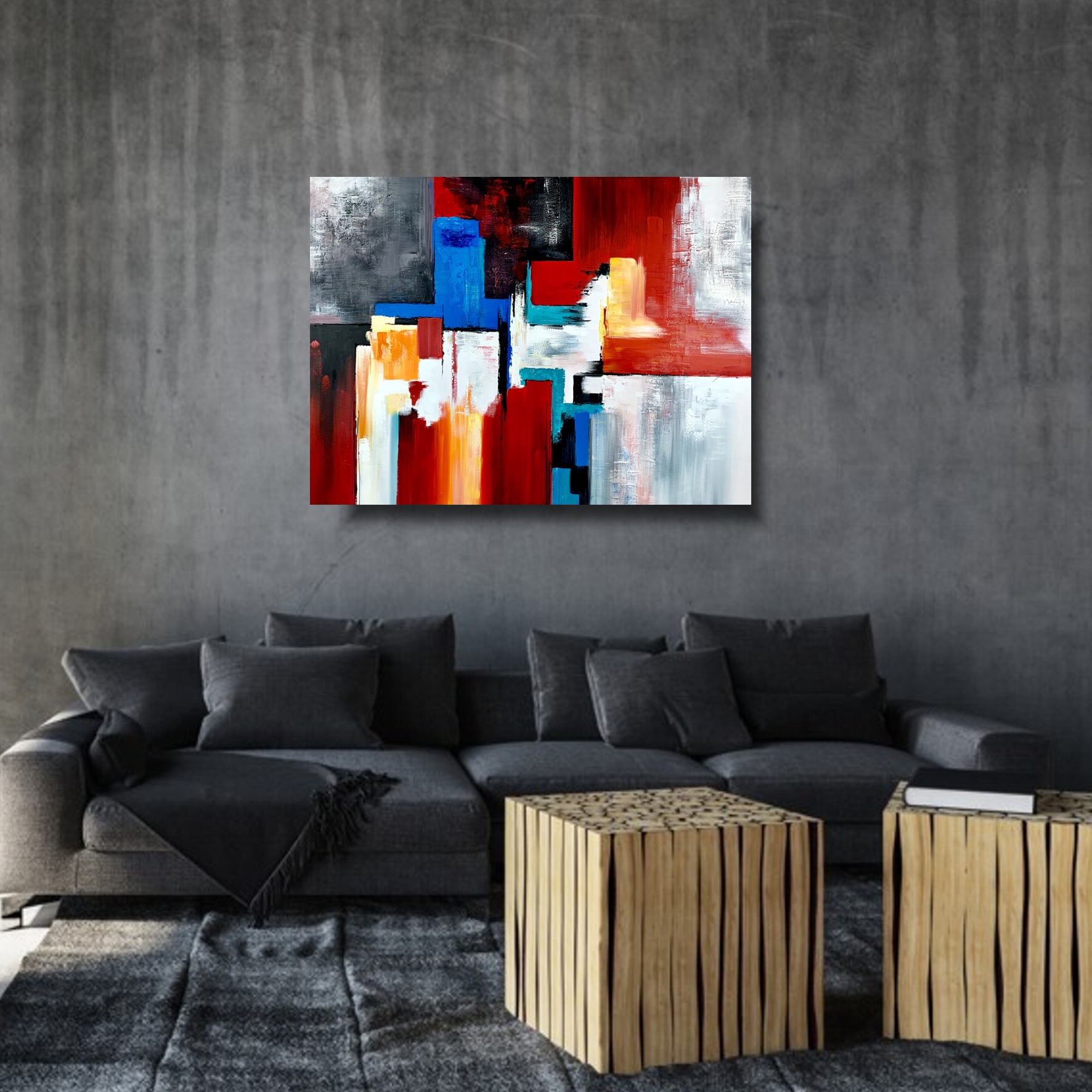 Obraz szalona abstrakcja w kontrastowej kolorystyce i dużym formacie. Idealnie pasuje do modnego wnętrza – salonu, sypialni, przedpokoju czy biura. Gdyby jednak zamarzyło się Państwu coś zupełnie odmiennego – malujemy obrazy na zamówienie.