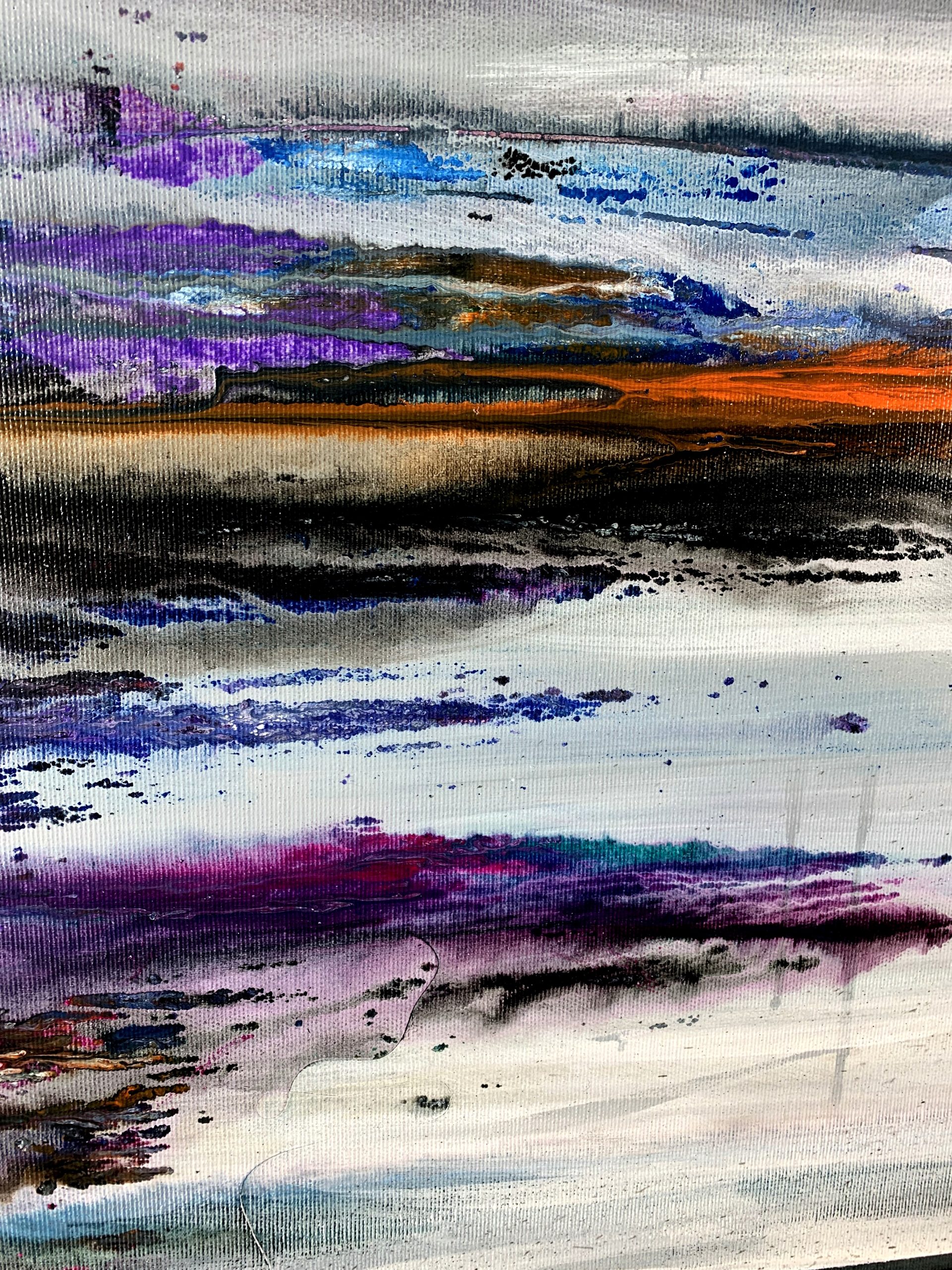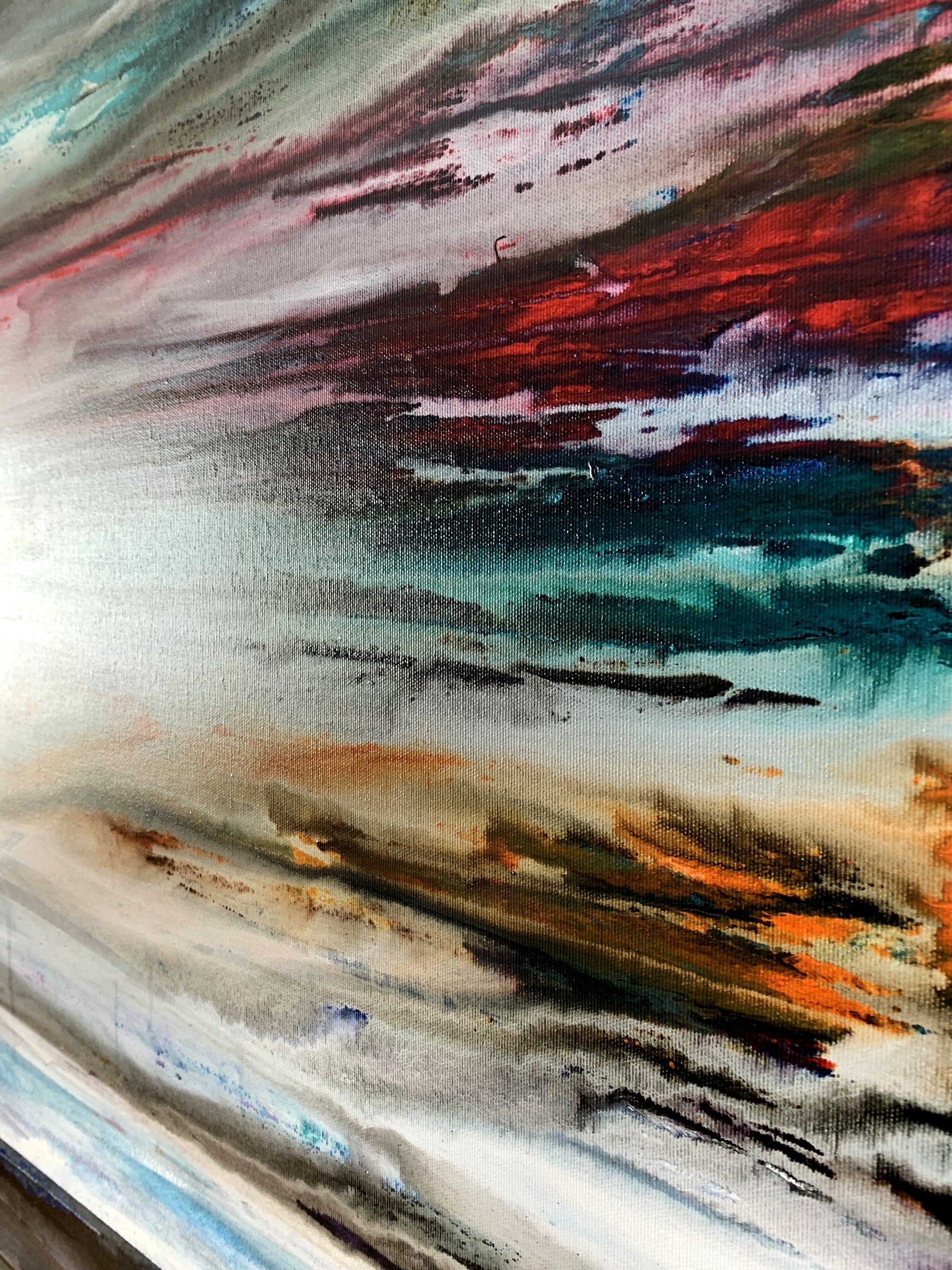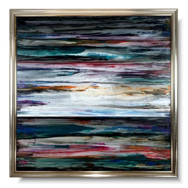 Mieszanka realizmu i zadumy nad niedopowiedzianym – czyli głębokie przeżycie artystyczne – to daje nam kolejny obraz „Wspomnienie wakacji” abstrakcja w srebrnej ramie 2106A. Namalowany dynamicznymi pociągnięciami pędzla pejzaż zachodzącego słońca jest synonimem uchwyconej w biegu chwili która, jak fotografie zjawisk atmosferycznych, zachowuje w kadrze ulotne momenty.