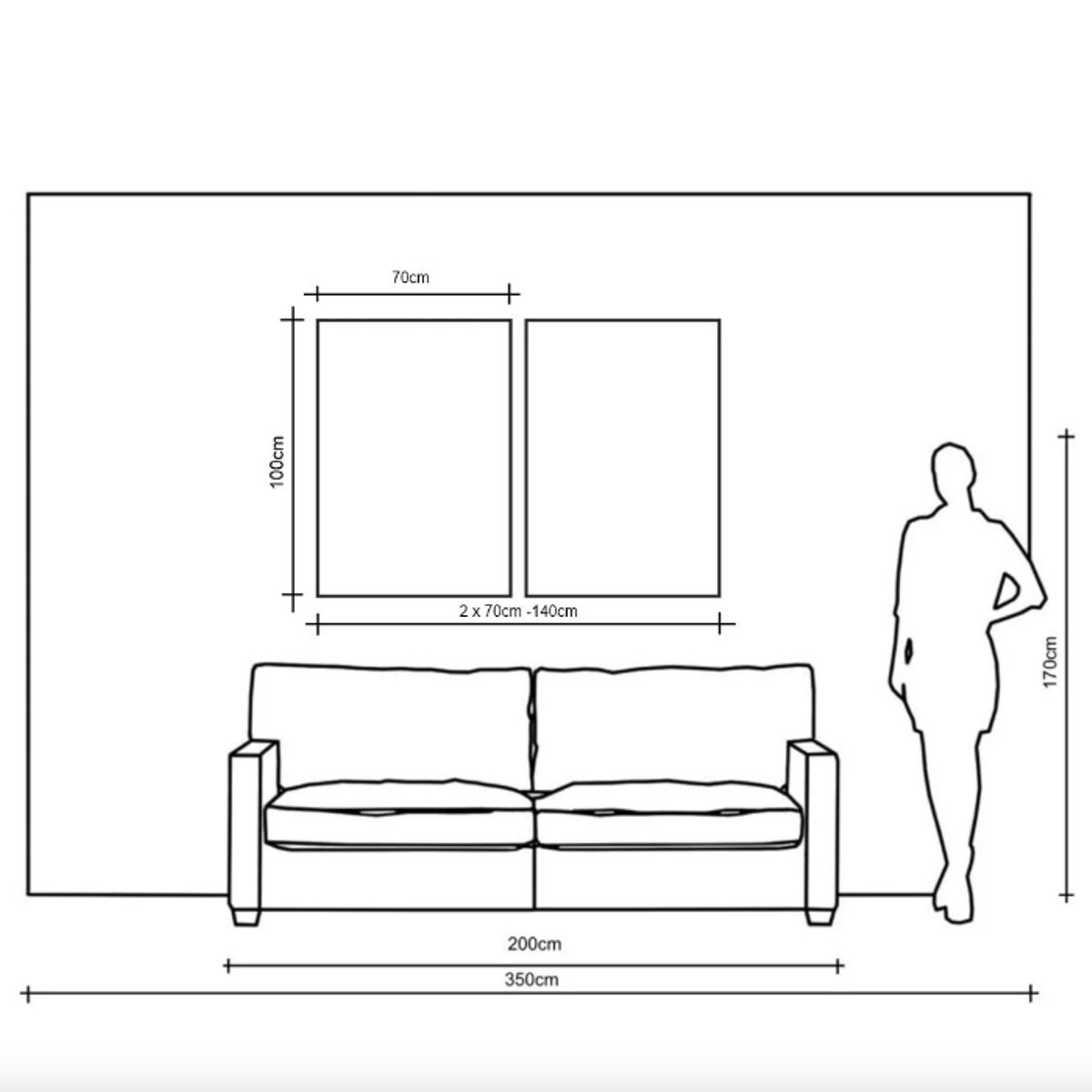 Pojedynczy obraz ma wymiar 100 × 70 cm, a zawieszone razem tworzą kompozycję o łącznym formacie ok. 140 × 100 cm, z możliwością szerszego rozstawienia.