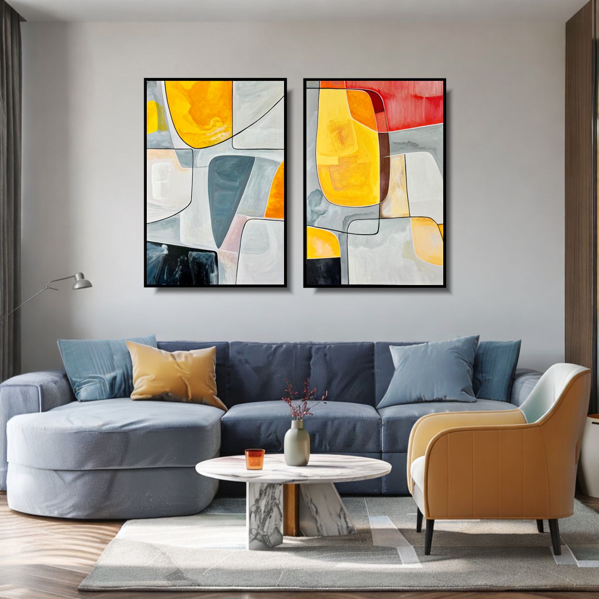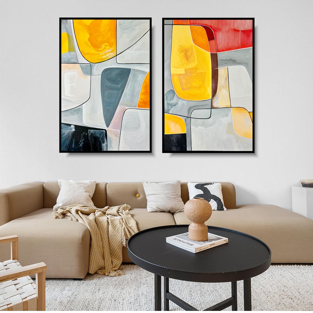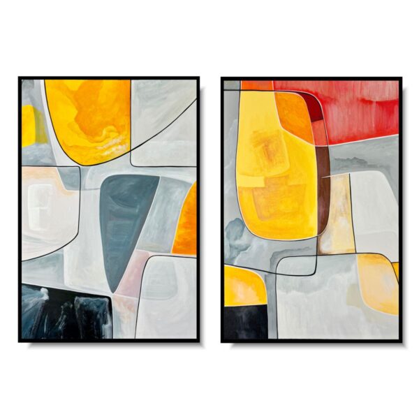 Ten nowoczesny dyptyk abstrakcyjny opiera się na relacji między dwiema niezależnymi, a jednocześnie komplementarnymi kompozycjami. Każdy obraz może funkcjonować samodzielnie, jednak dopiero zestawione razem tworzą pełną, zbalansowaną narrację wizualną. To propozycja dla wnętrz, w których liczy się rytm, przestrzeń i świadomy detal. Kolor, linia i rama Miękkie przejścia barw, kontrastujące z wyraźnymi liniami, budują głębię i dynamikę kompozycji. Czarna ramka passe-partout porządkuje formę i sprawia, że dyptyk prezentuje się niezwykle elegancko zarówno w nowoczesnych, jak i minimalistycznych aranżacjach.