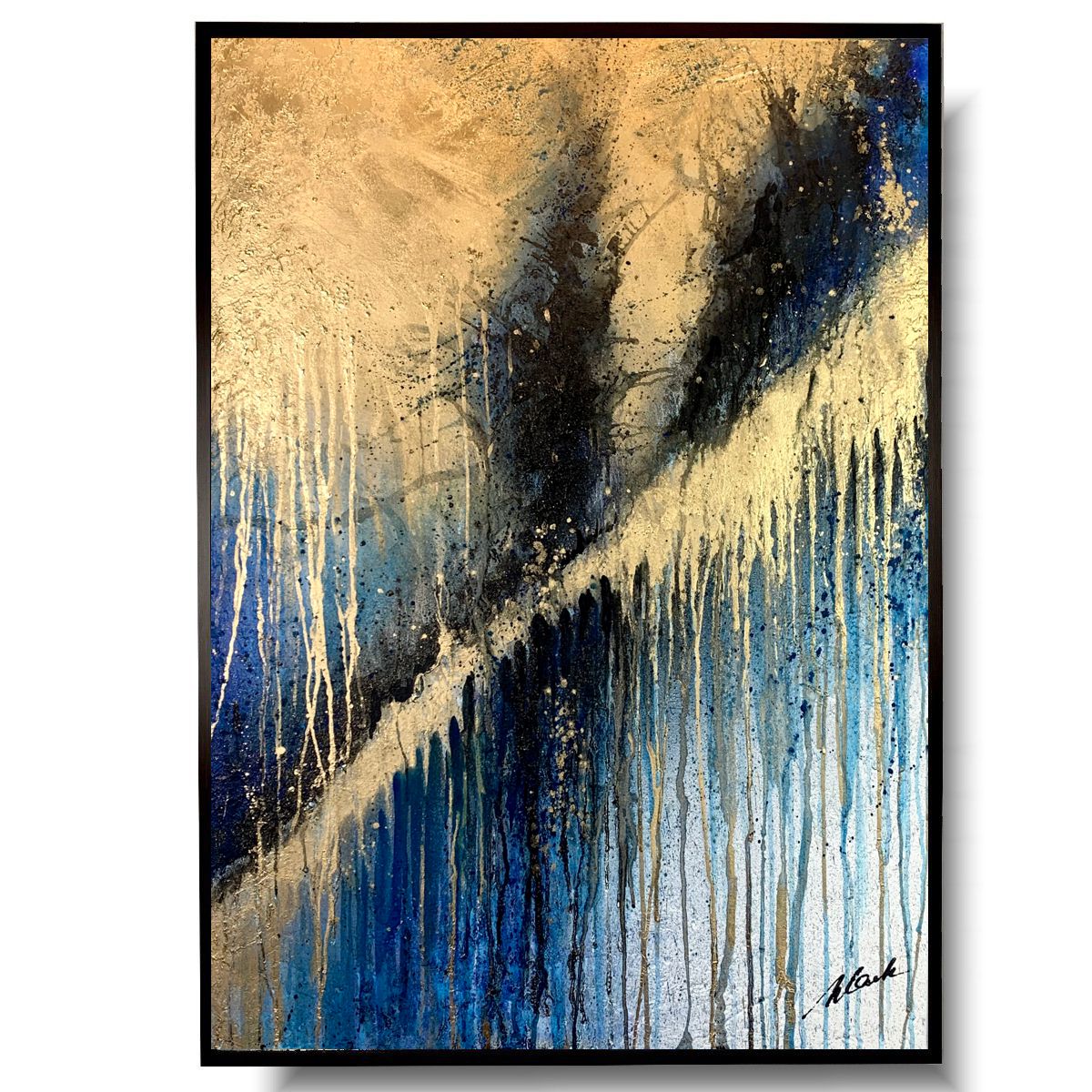 Kolorystyka obrazu: złoty, granatowy, niebieski, szary, biały, czarny, złoty brokat + czarna matowa rama (listwa szerokości 1,5cm)