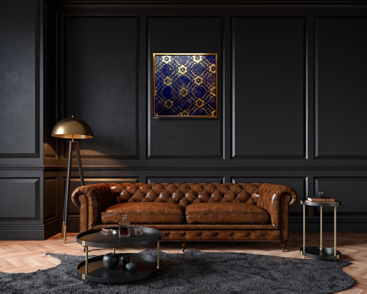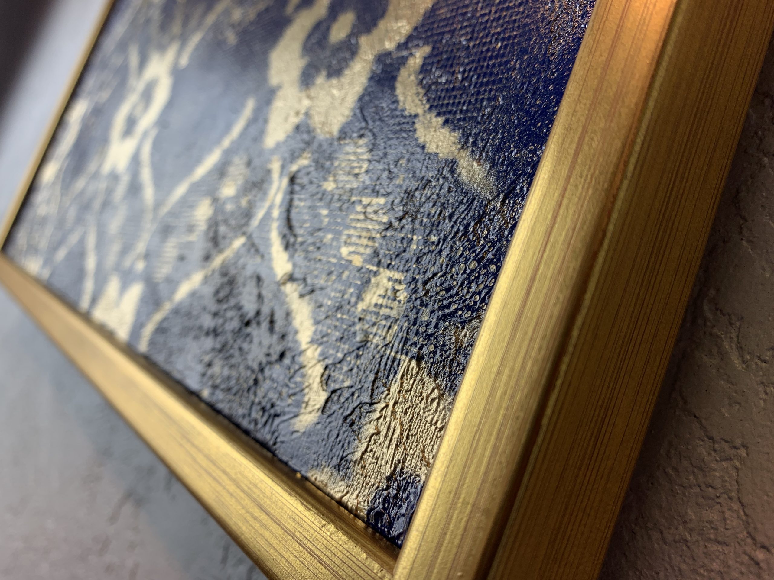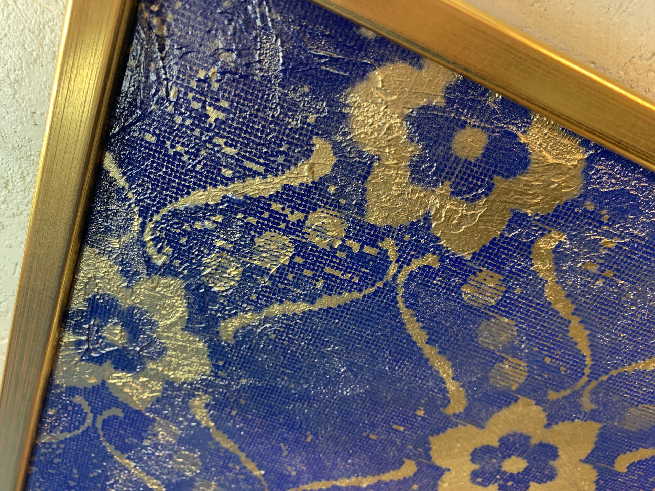 Obrazek do salonu „Granat love kwiaty” w ramie 2201A w to mały delikatny obraz w dwóch kontrastujących kolorach złota i granatu. Wzorzysta abstrakcja ręcznie malowana w złotej prostej ramie. Abstrakcja to nasza specjalność.
