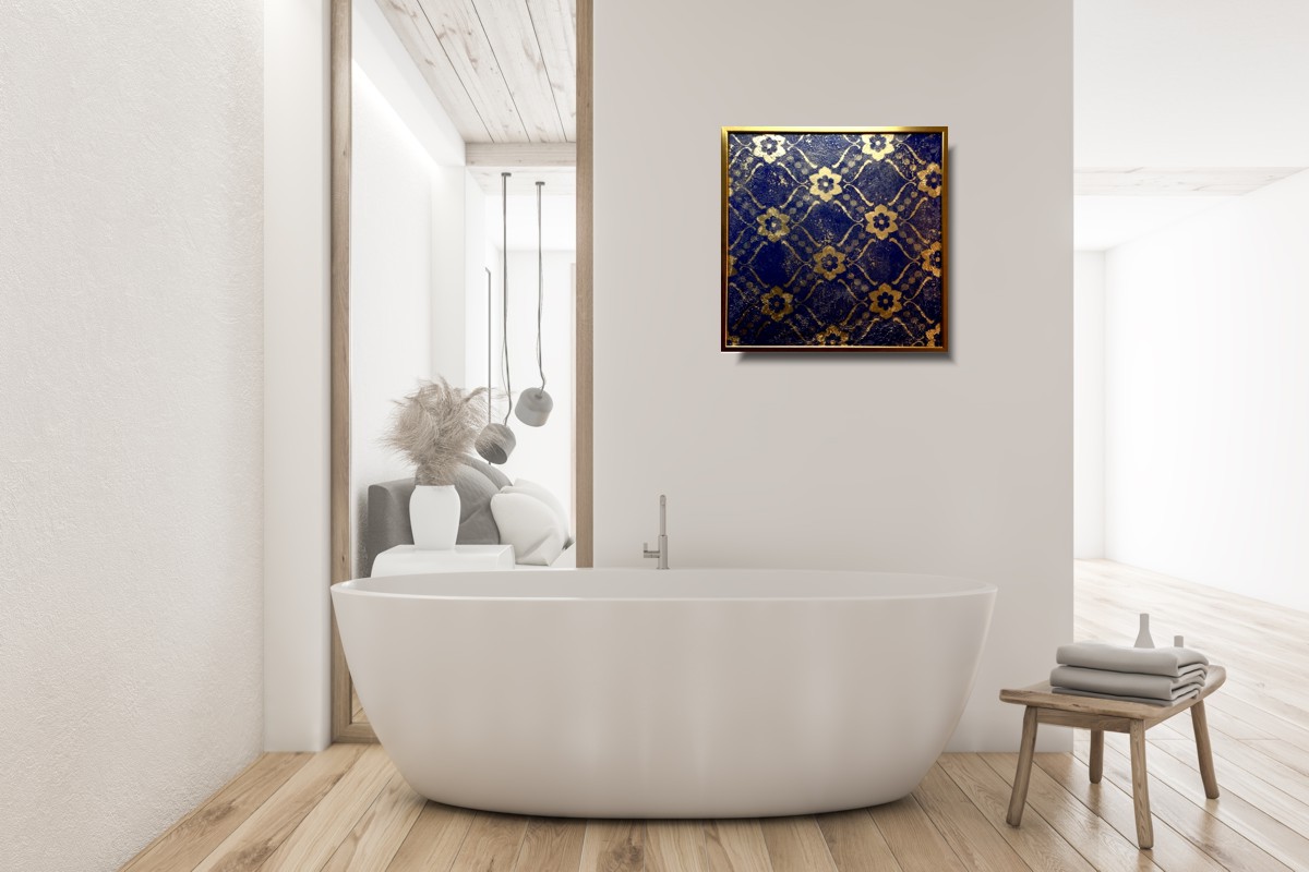 Kolorystyka obrazu: granatowy, złoty + złota rama (szerokość listwy 1,5cm)