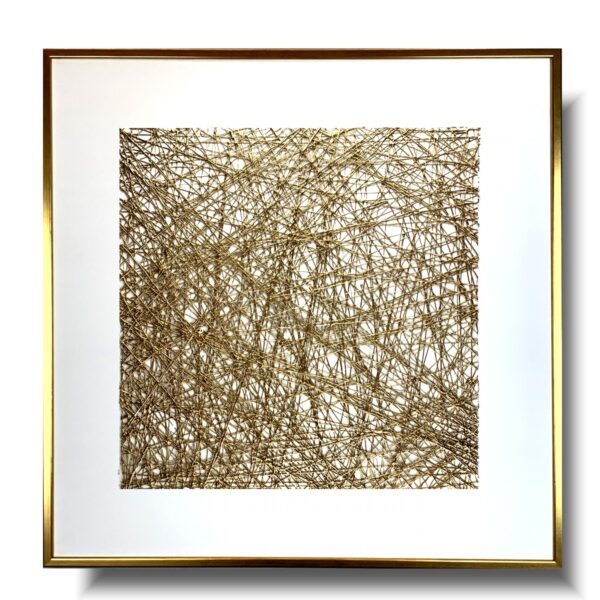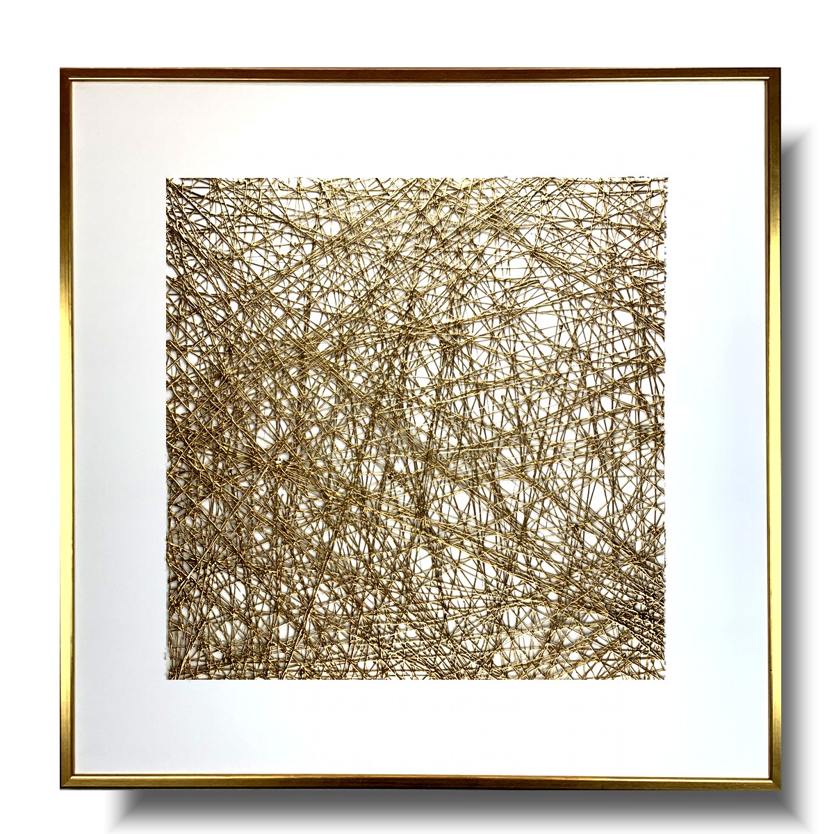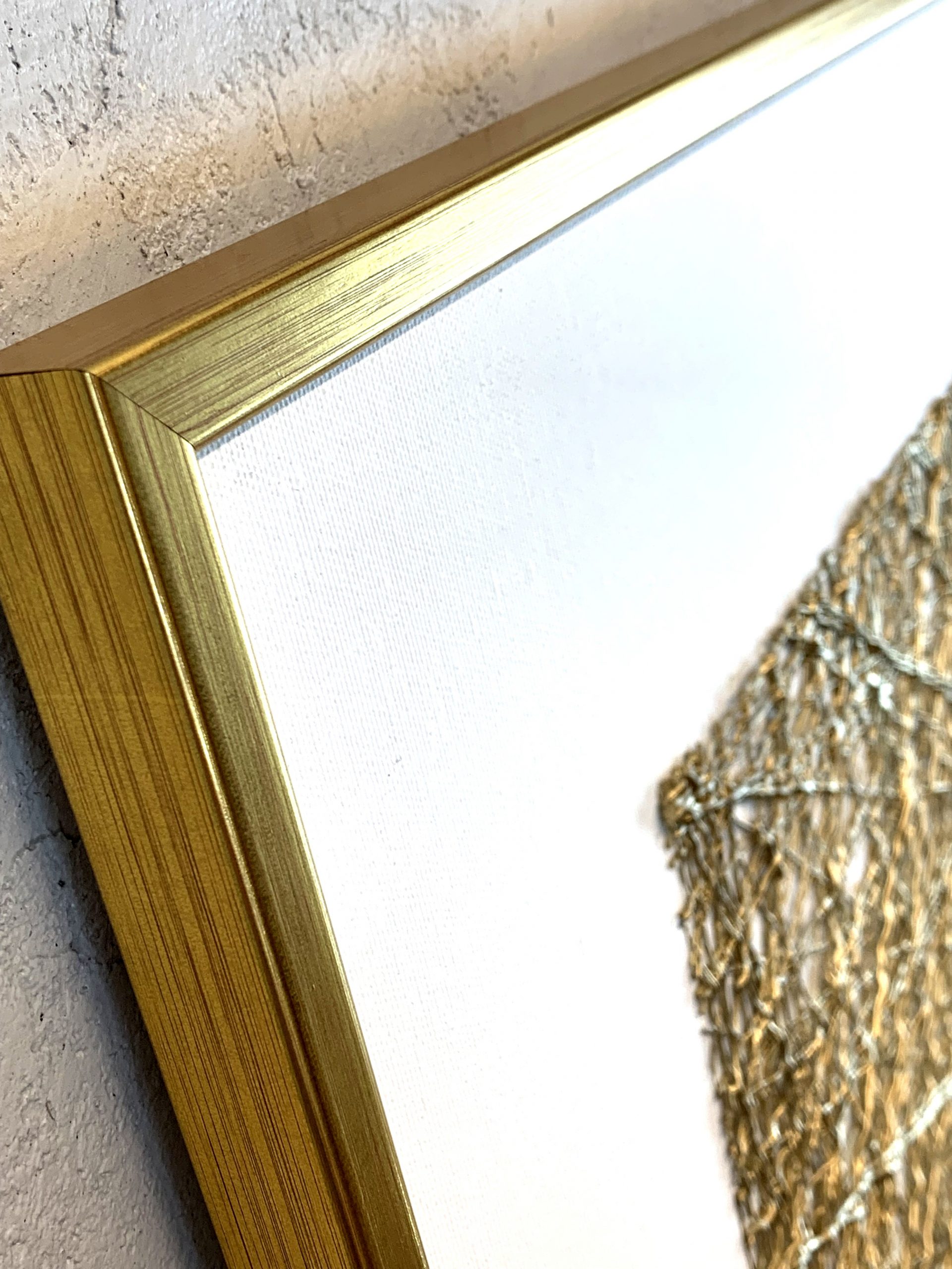 Abstrakcja do salonu „Złota sieć” obraz w ramie złotej 2191A to elegancki minimalistyczny obraz ze strukturą 3D w kolorze złotym i złotą ramą. Obraz wykonywany ręcznie. Abstrakcja to nasza specjalność.