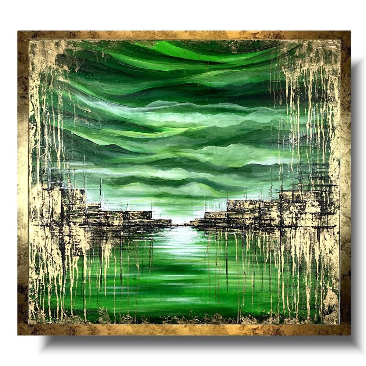 Modny zielony obraz w ramie „Wiosenne nabrzeże” to dzieło z serii autorskich obrazów NABRZEŻA, które przedstawia nabrzeże portowe tym razem ujęte w odcieniach zieleni i złota. Delikatne, rozpływające się niebo, ukazuje obszar lądowy oraz związaną z nimi infrastrukturę portową. Całość została zamknięta w złoconą ramę, indywidualnie stworzoną do tego obrazu.