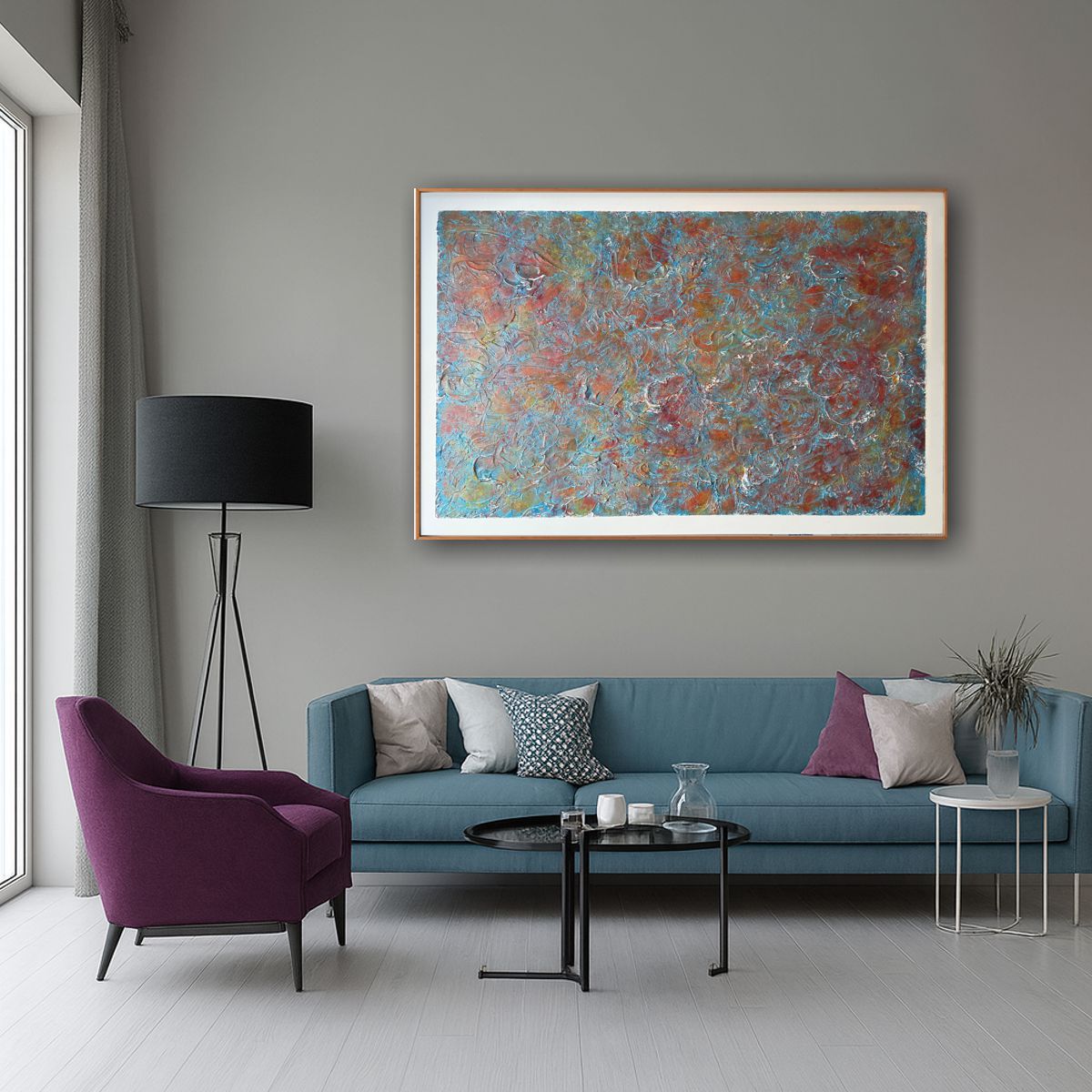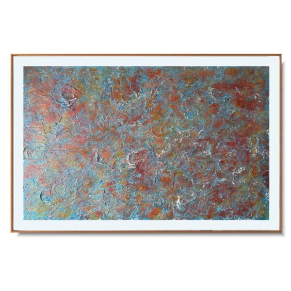 Ten abstrakcyjny obraz „Morska jesień” zachwyca bogactwem faktur oraz subtelną grą kolorów – od chłodnych odcieni turkusu i błękitu po ciepłe akcenty czerwieni, rudości i żółtego. Dynamiczna, wielowarstwowa struktura tworzy wrażenie ruchu i głębi, dzięki czemu kompozycja zmienia swój charakter w zależności od światła i perspektywy. Rama w komplecie.