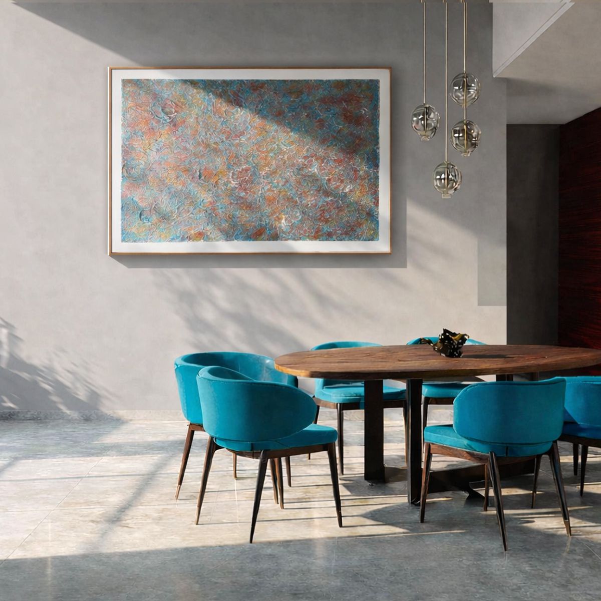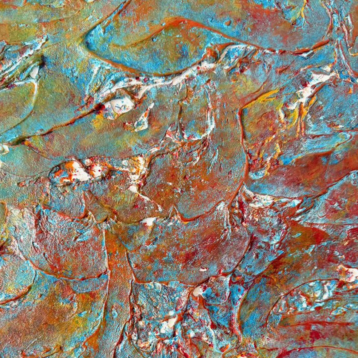 Nowoczesny obraz abstrakcyjny z wyraźną strukturą i wielowarstwową fakturą, utrzymany w odcieniach turkusu, błękitu, czerwieni i rudości.