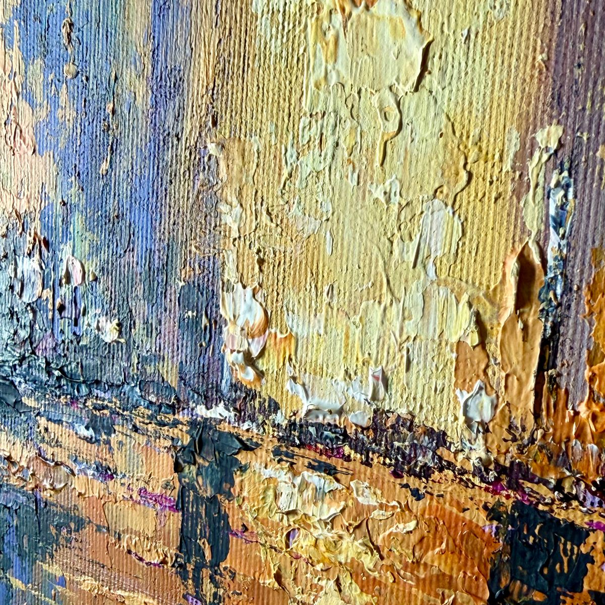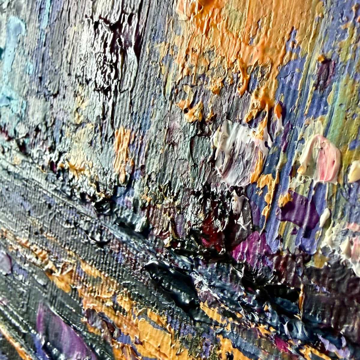 Intensywne fiolety, turkusy i błękity zostały przełamane ciepłym, niemal świetlistym centrum. Widoczna struktura farby akrylowej sprawia, że obraz zmienia się w zależności od światła i perspektywy, nadając wnętrzu dynamikę i nowoczesny charakter.