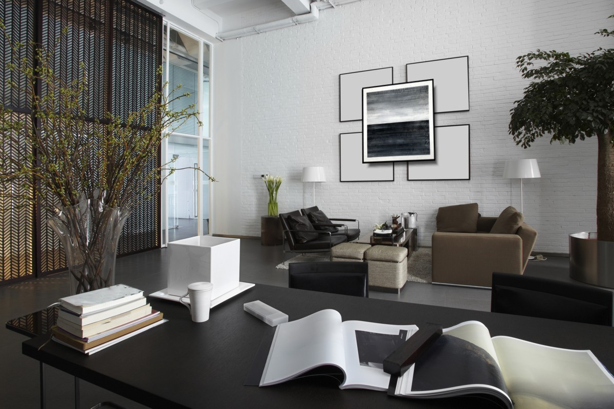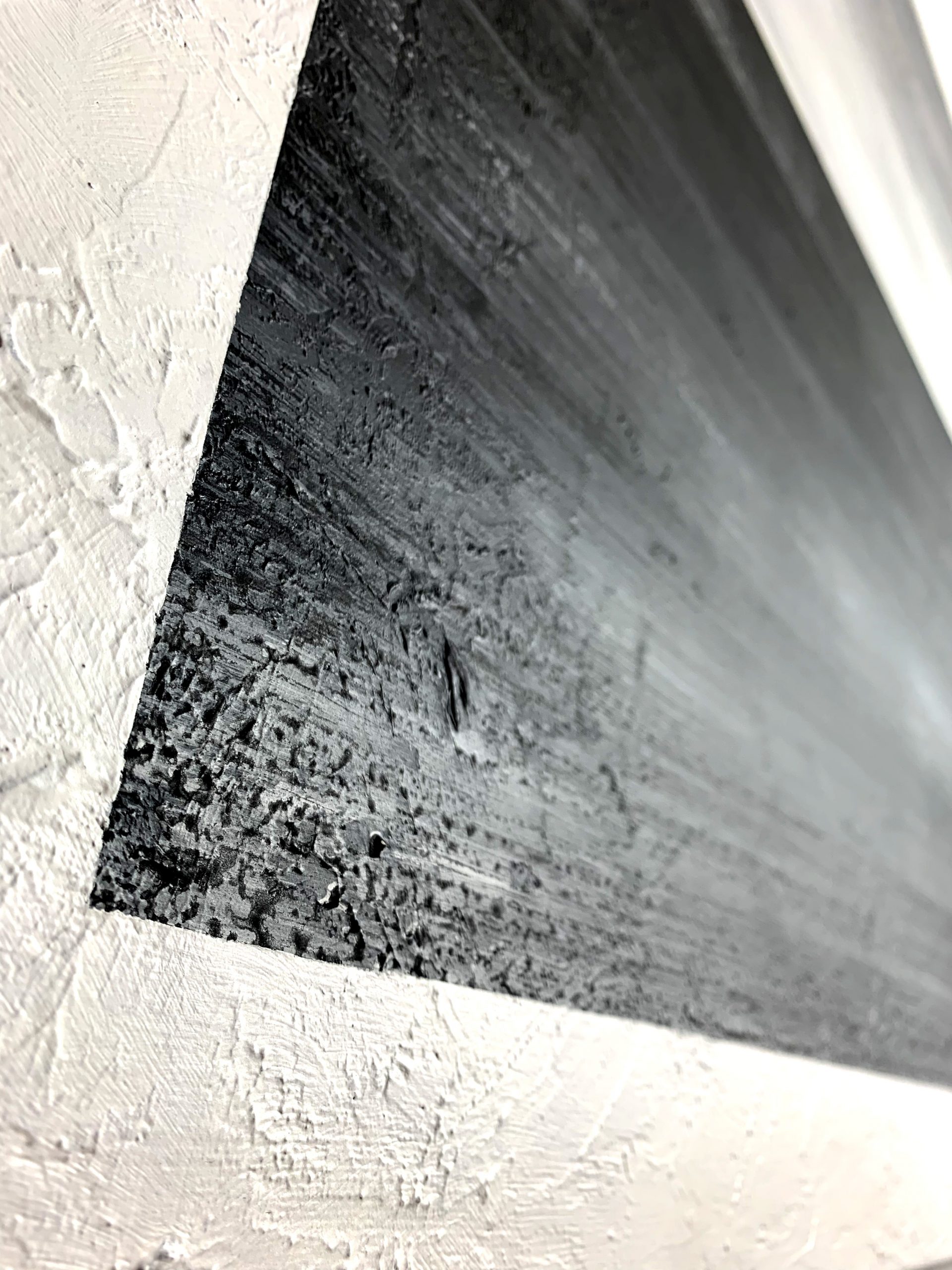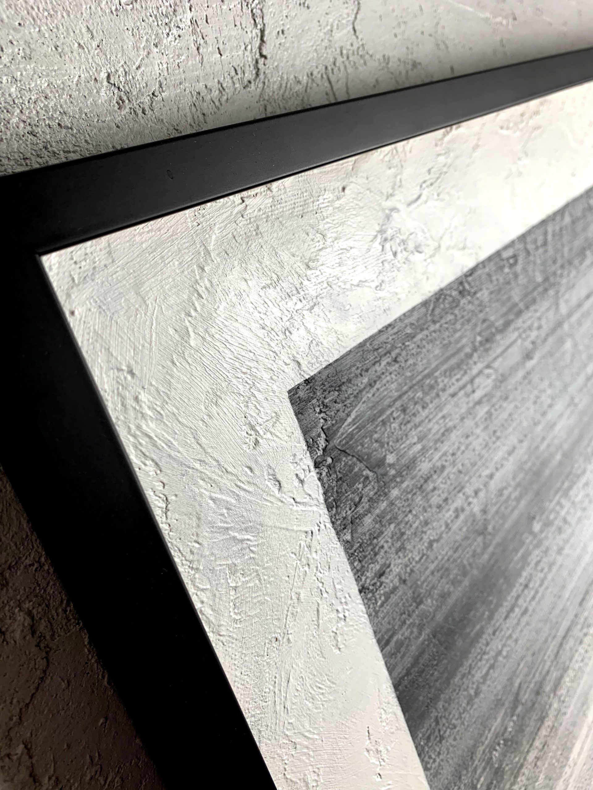 Obraz abstrakcyjny „Na horyzoncie” 2207A to minimalistyczny widok w odcieniach szarości z białym passpartout. Na zbliżeniu widoczna jest wyraźna faktura farby. Modny obraz ręcznie malowany sprzedawany jest w prostej czarnej ramie.