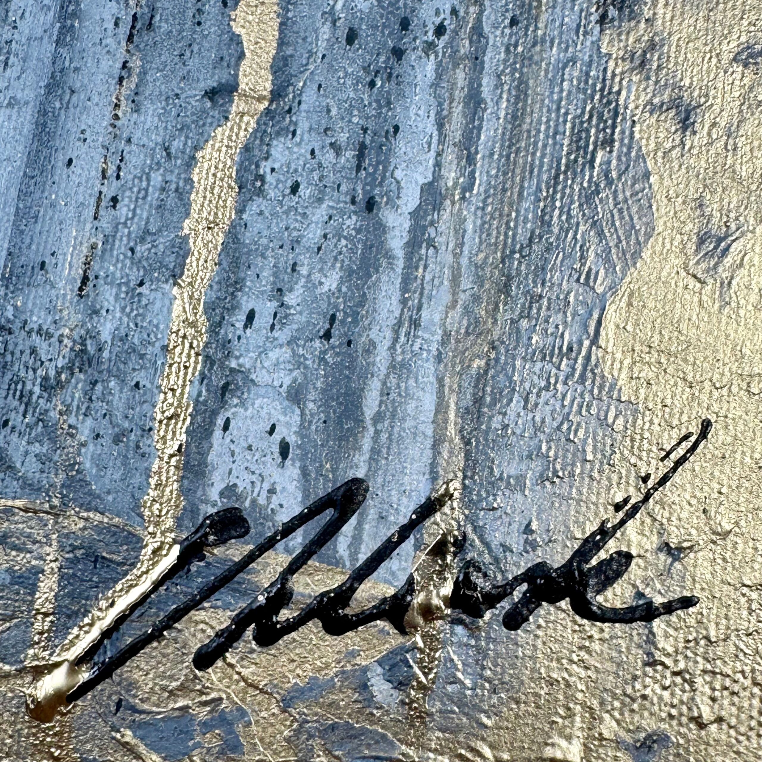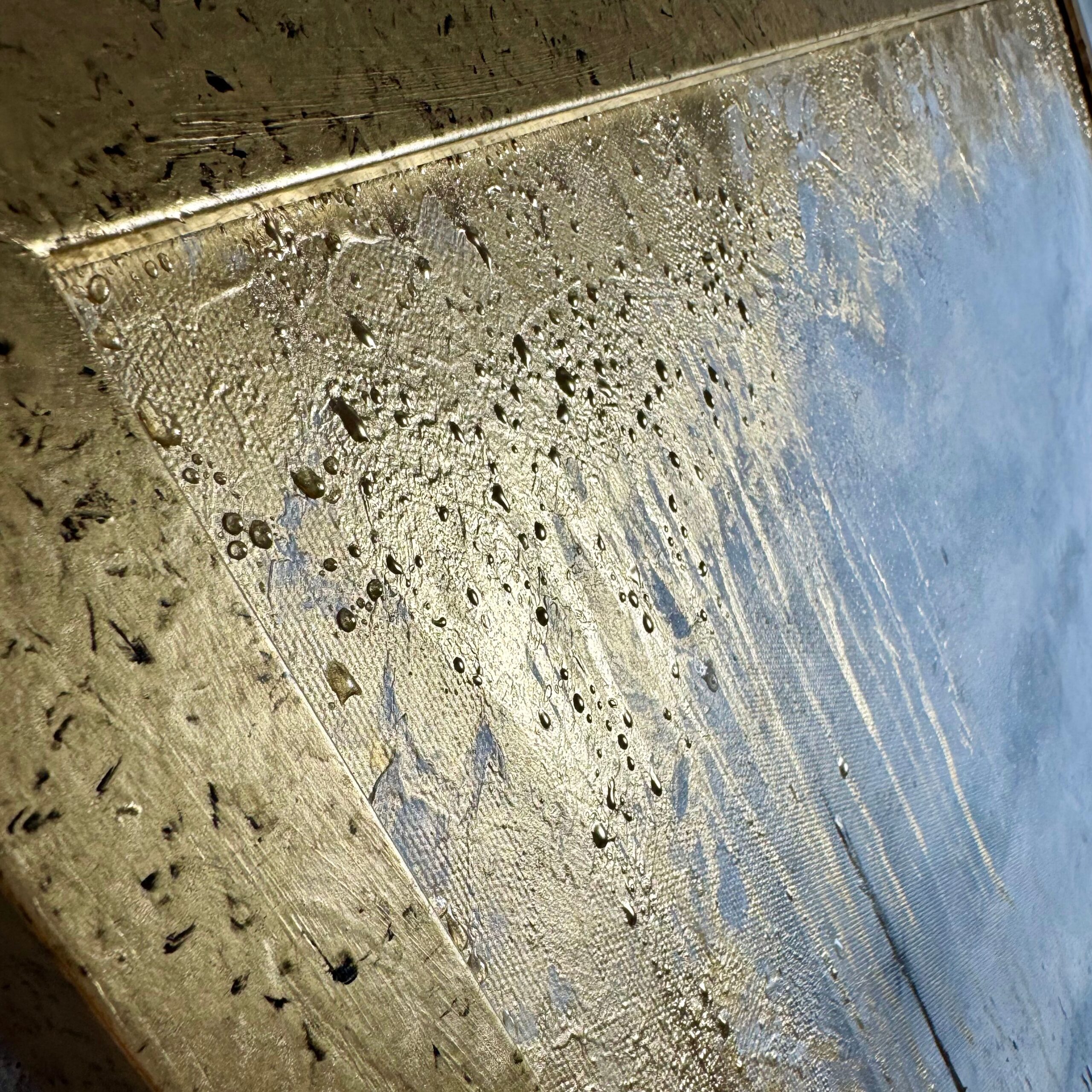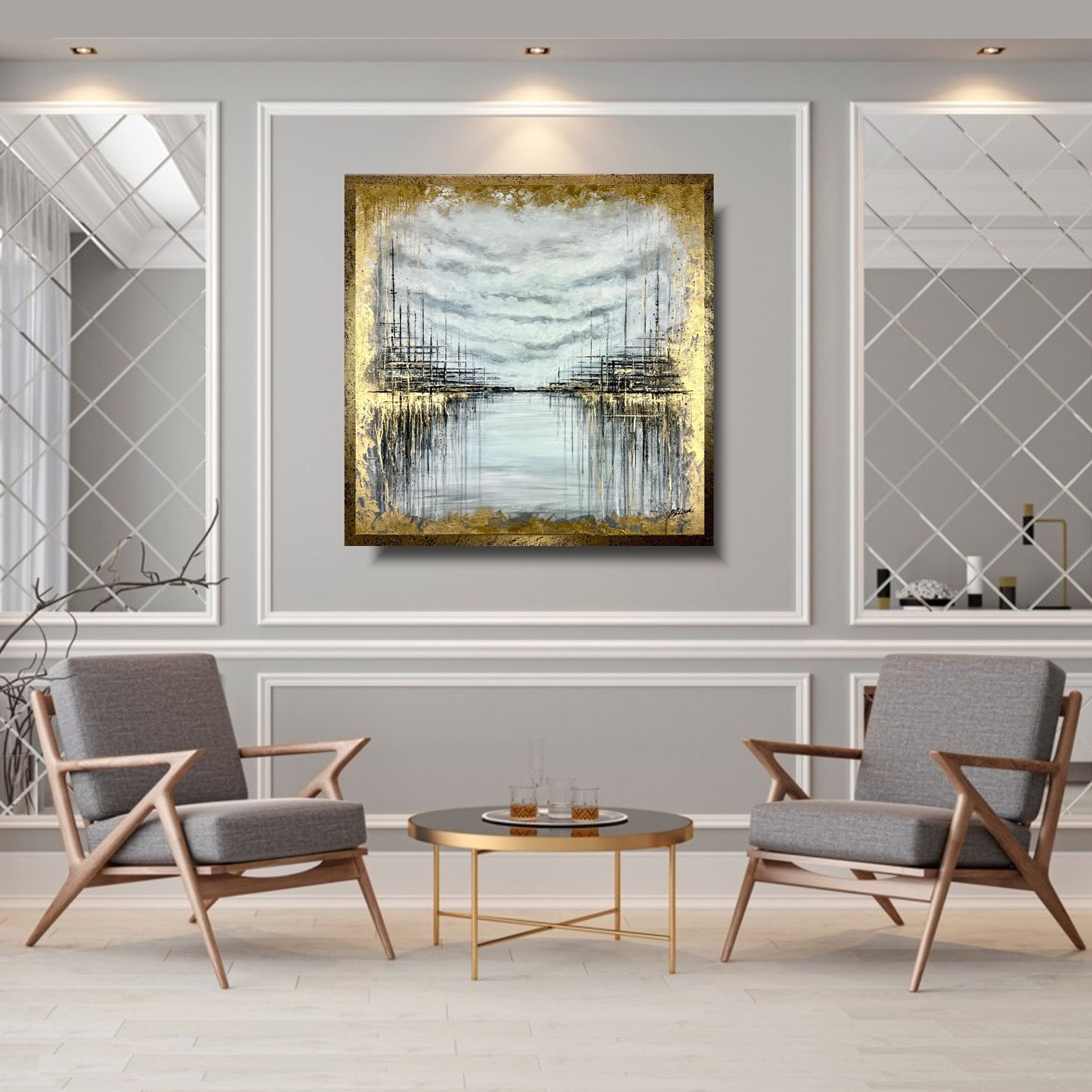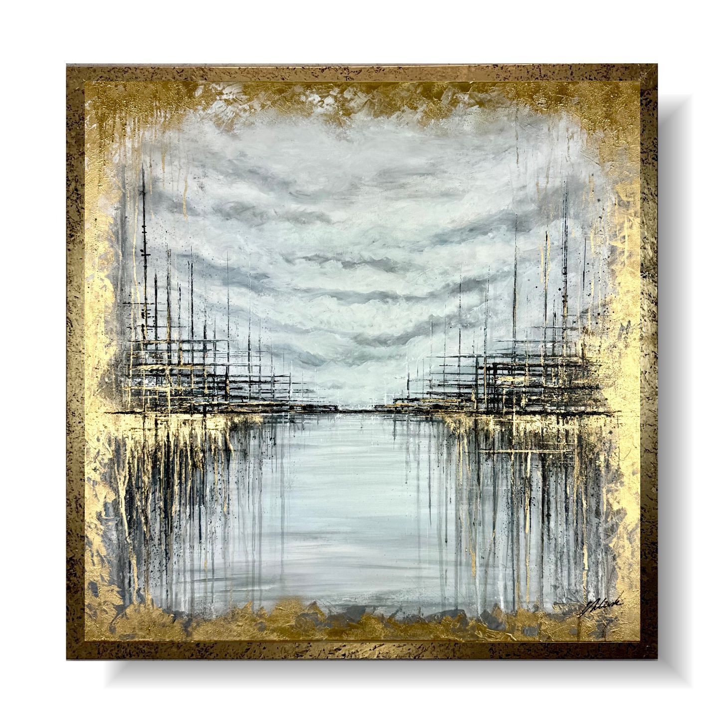 Obraz abstrakcyjny do salonu „Tajemnicza wyspa” 1998A1 przedstawiający nabrzeże portowe widziane z pokładu statku. Delikatne złote muśnięcia jak przez mgłę ukazują daleki wyczekany port.