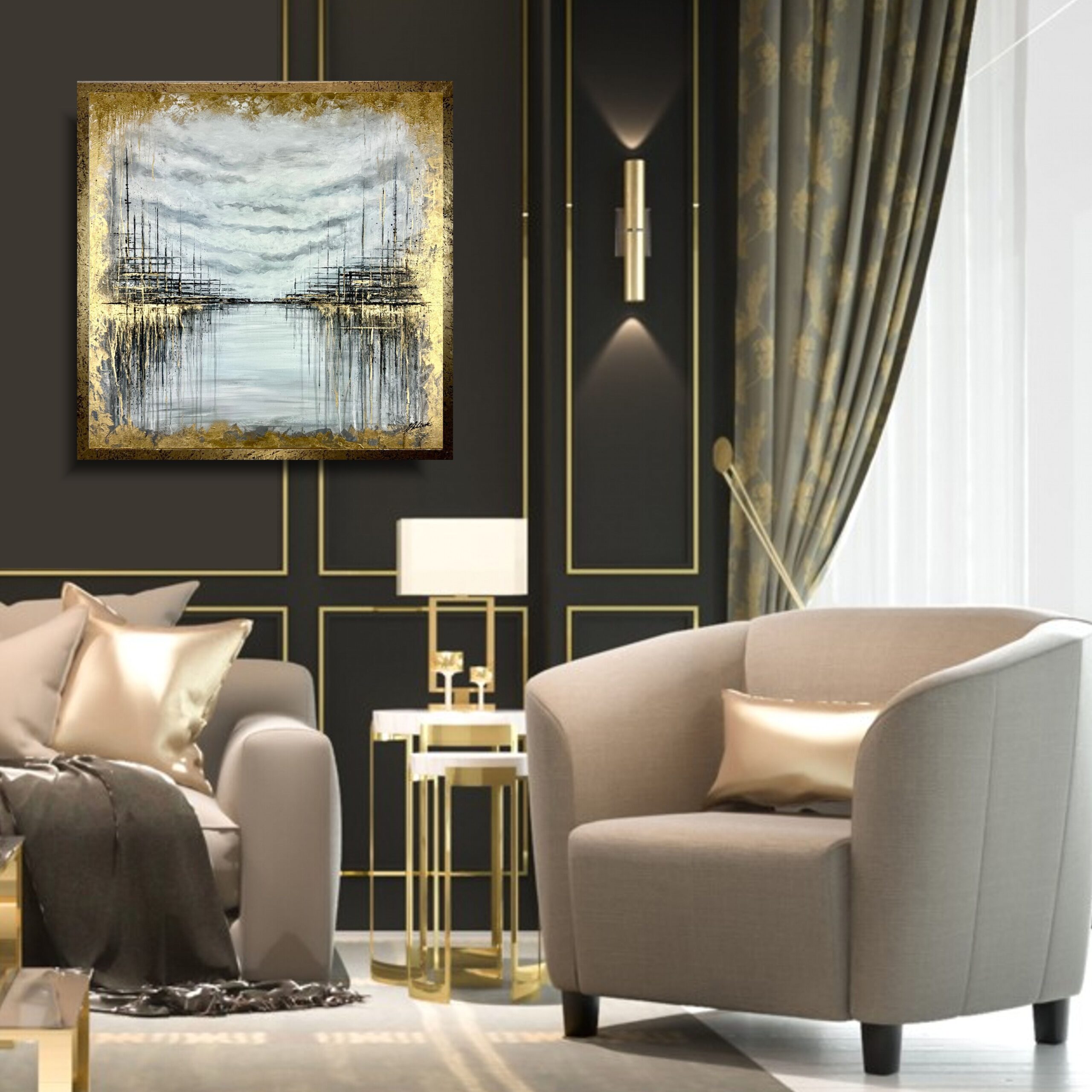 Obraz abstrakcyjny złote miasto składa się z 1 części + rama w komplecie (listwa szerokości 4cm i grubości 2,5cm).