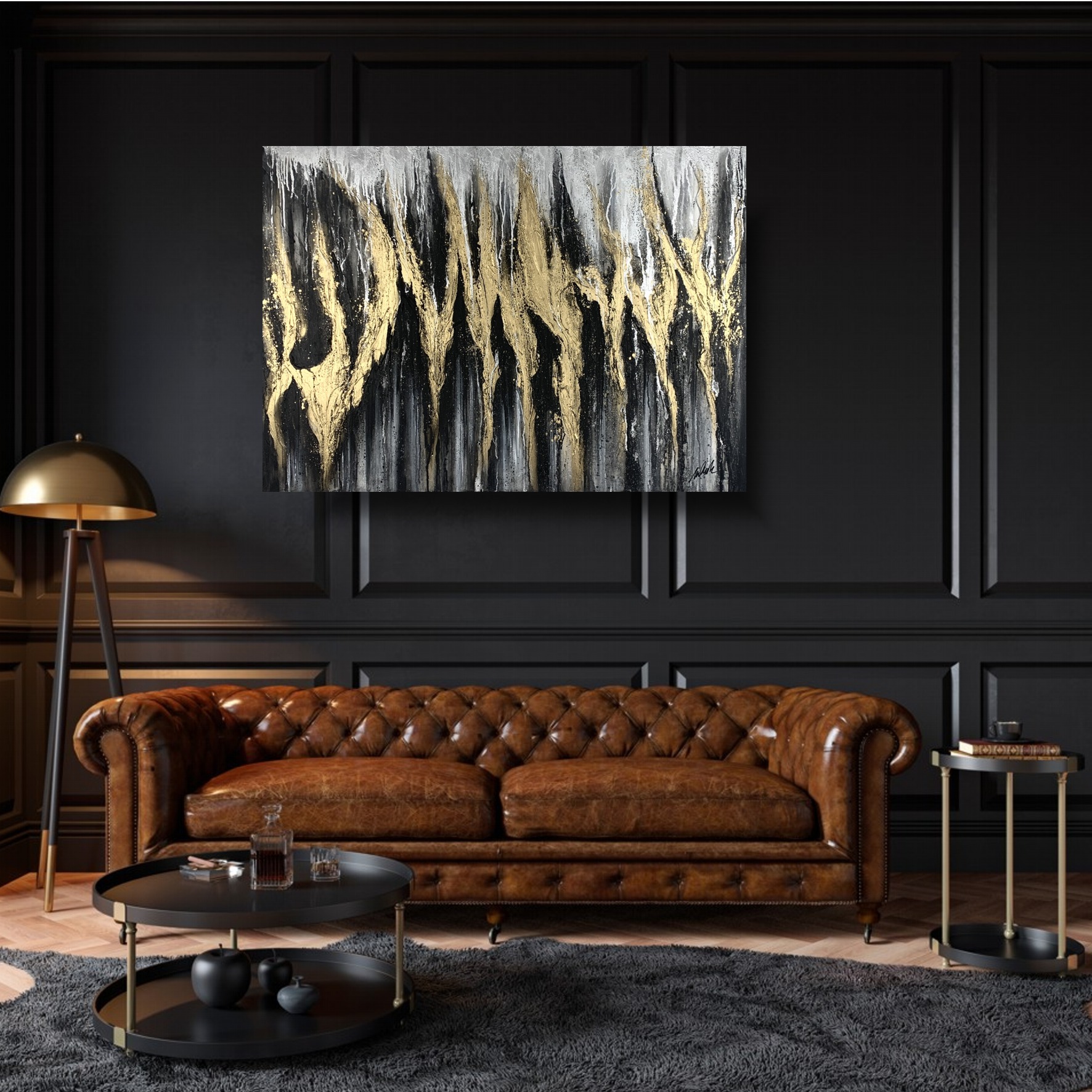 Obraz abstrakcyjny złota korona naszego autorstwa w bogatej kolorystyce złota i srebra. Kolory użytej farby akrylowej i ich połączenie dodają splendoru. Obraz ten idealnie ozdobi nowoczesny pokój czy modne biuro. Obrazy w dużym formacie są idealne do dużych zimnych, nowoczesnych pomieszczeń dlatego tak chętnie je tworzymy. Wykonujemy obrazy marynistyczne, obrazy kwiaty, obrazy aniołów, obrazy dzielone – dyptyk, tryptyk, fortyk, obrazy jednoczęściowe w dużym formacie. Możemy namalować każdy obraz z naszej oferty w zmienionych wymiarach lub kolorystyce, możemy namalować obraz dzielony na jednej części lub obraz jednoczęściowy podzielić na kolka części. Zapraszamy do kontaktu mailowego sklep@dobrasztuka.pl