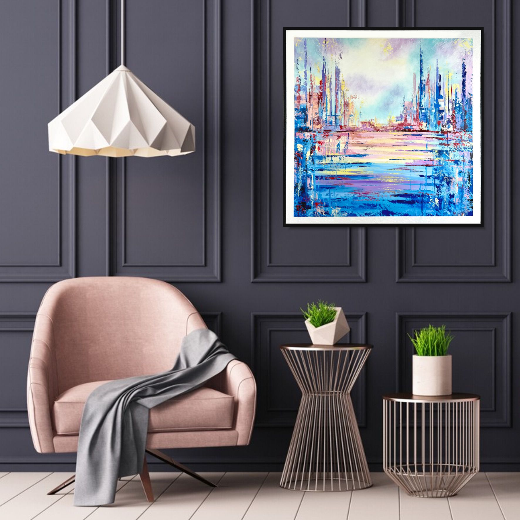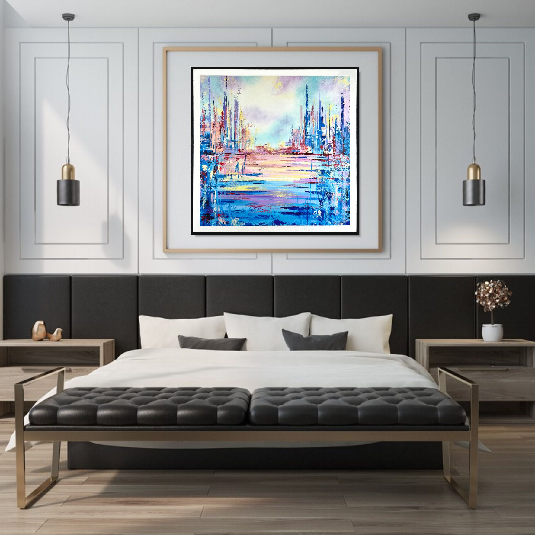 Obraz pastelowy do salonu „Color world” abstrakcja 2208A to widok na architekturę z oddali w odcieniach pasteli z białym i czarnym passpartout. Nowoczesny obraz ręcznie malowany w poprawiającej humor kolorystyce. Abstrakcja spełniająca najwyższe wymagania.