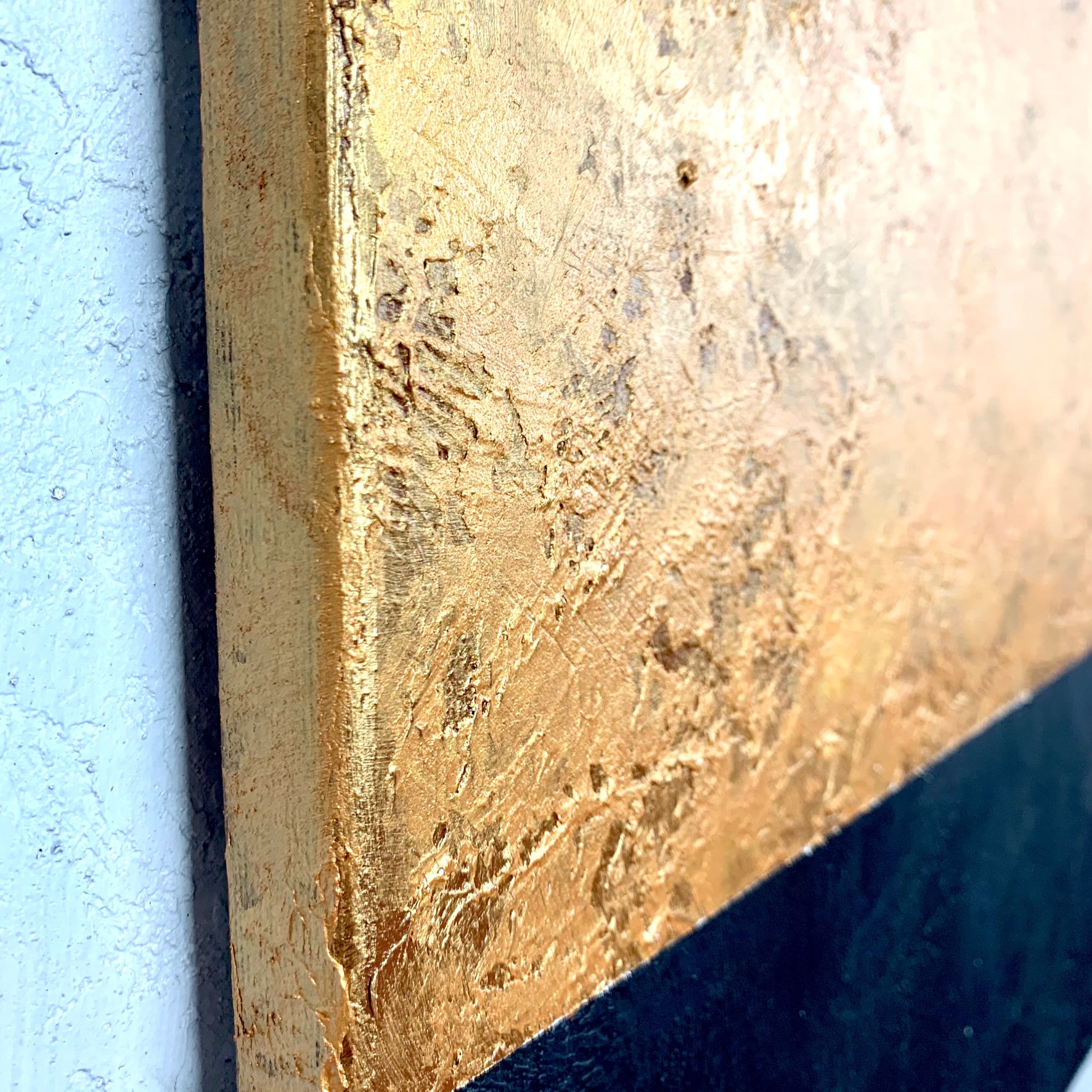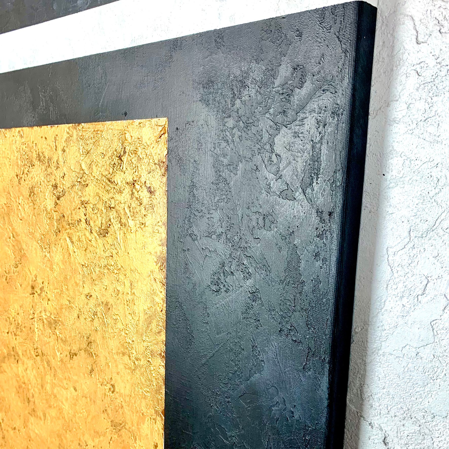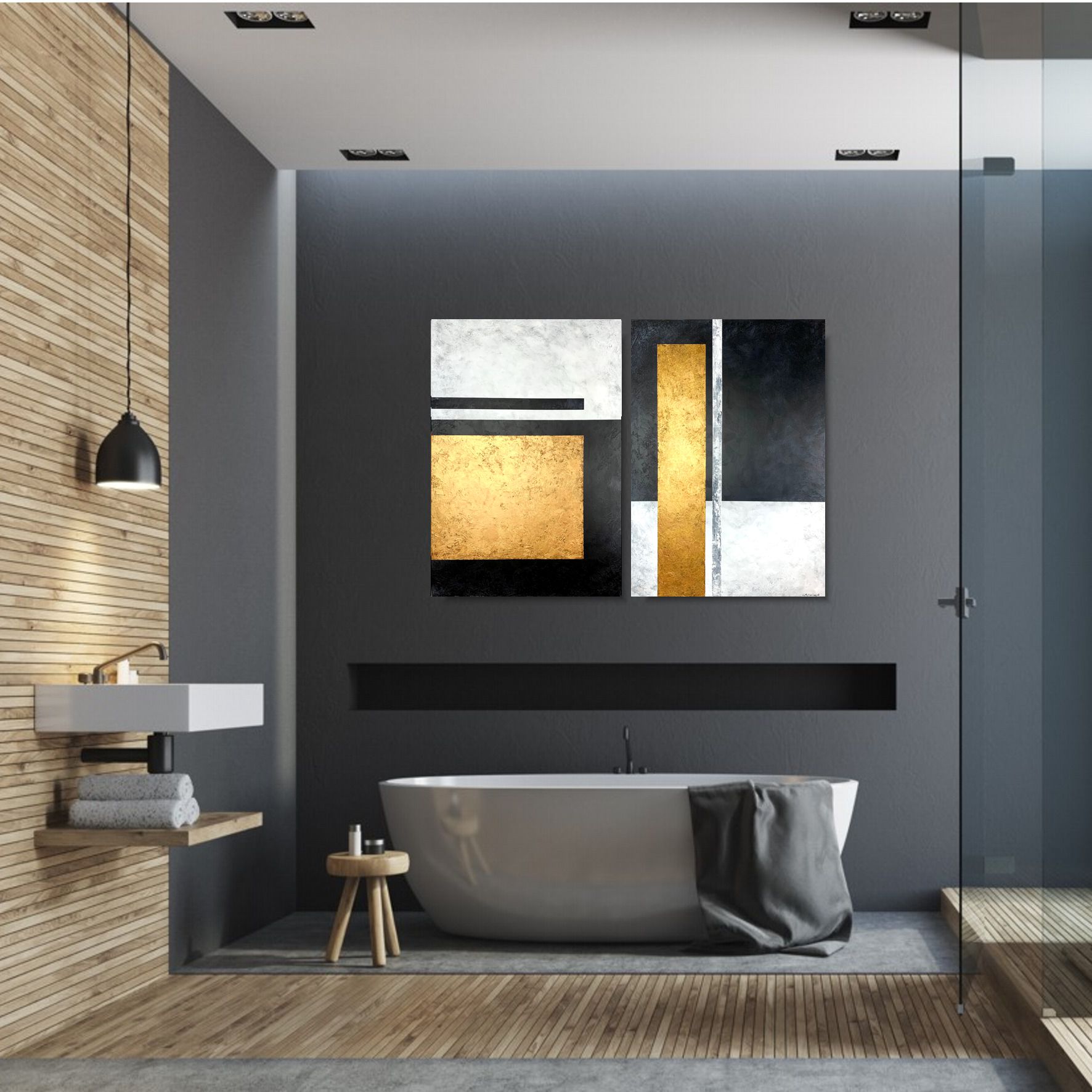 Obraz ręcznie malowany na płótnie „Gold cube” to obraz ręcznie malowany z dominującymi elementami w złotym kolorze. Format obrazu to dwie części w orientacji pionowej – komplet dwuczęściowy – dyptyk. Idealne dopełnienie minimalistycznego salonu