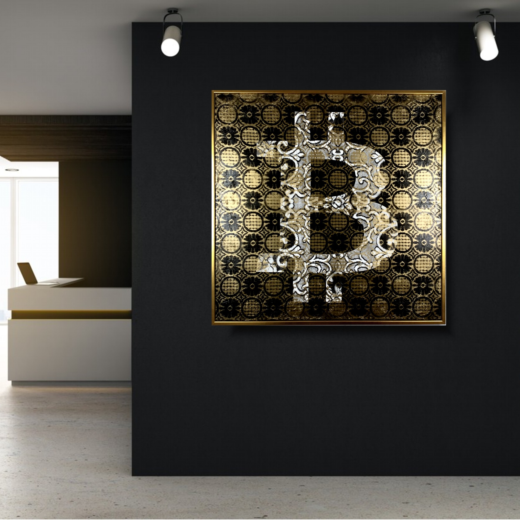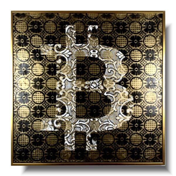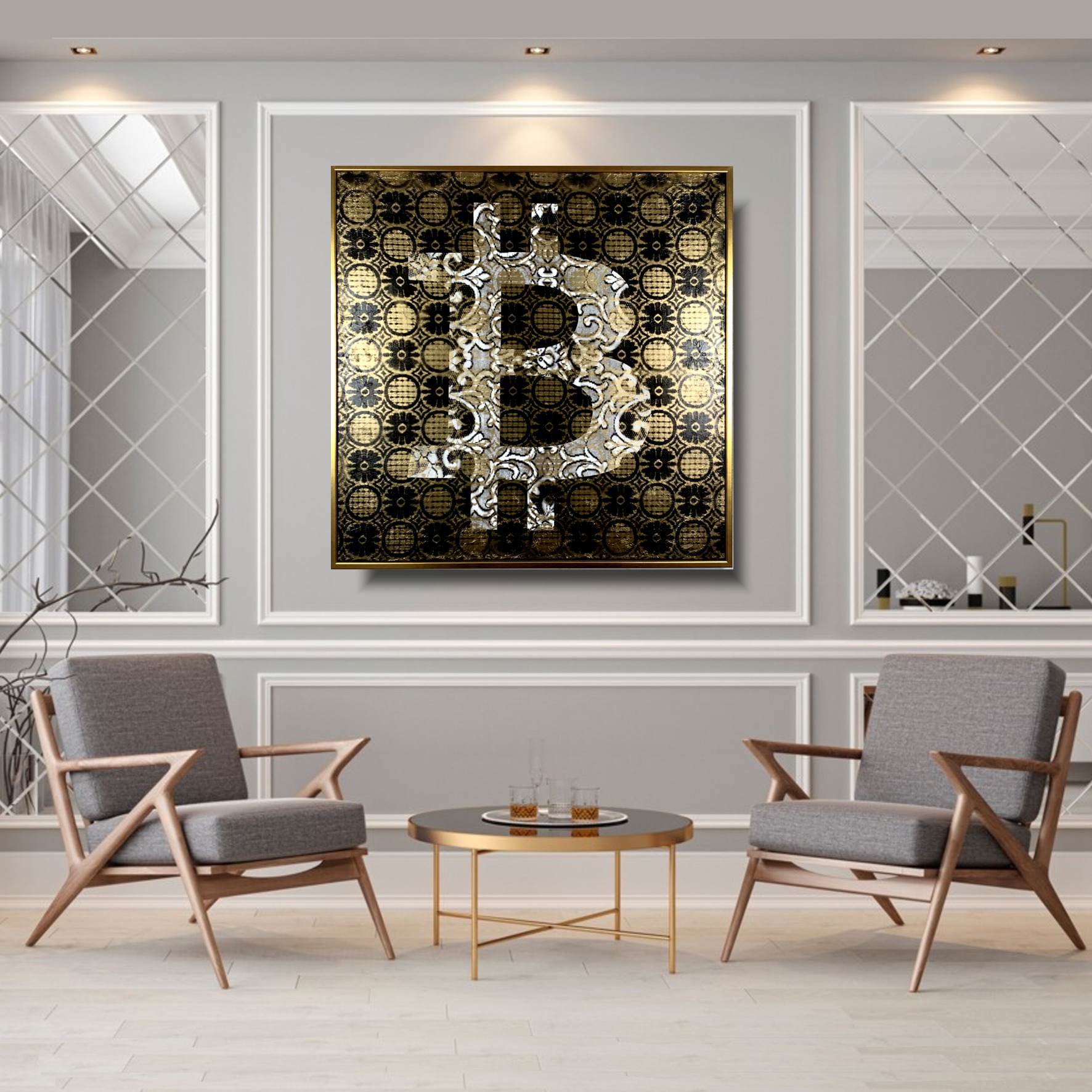 Obraz do salonu „Wzorzysty bitcoin” abstrakcja w ramie 2209A to czarno złota abstrakcja w złotej nowoczesnej ramie. Abstrakcja ręcznie malowana w modnej kolorystyce. Obraz dla miłośników kryptowalut.