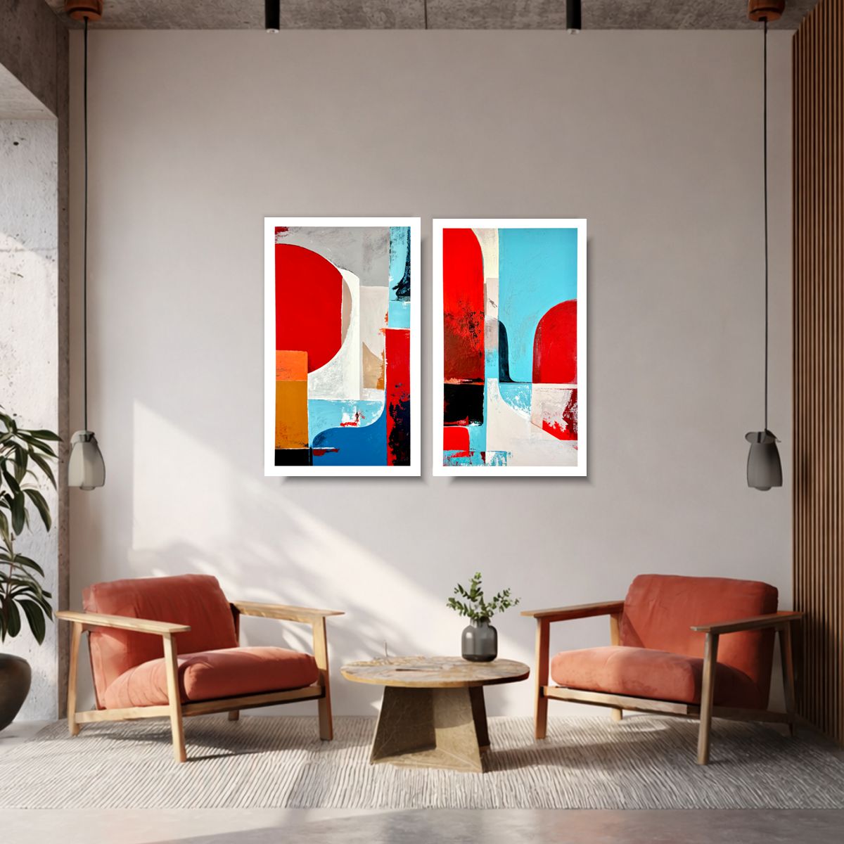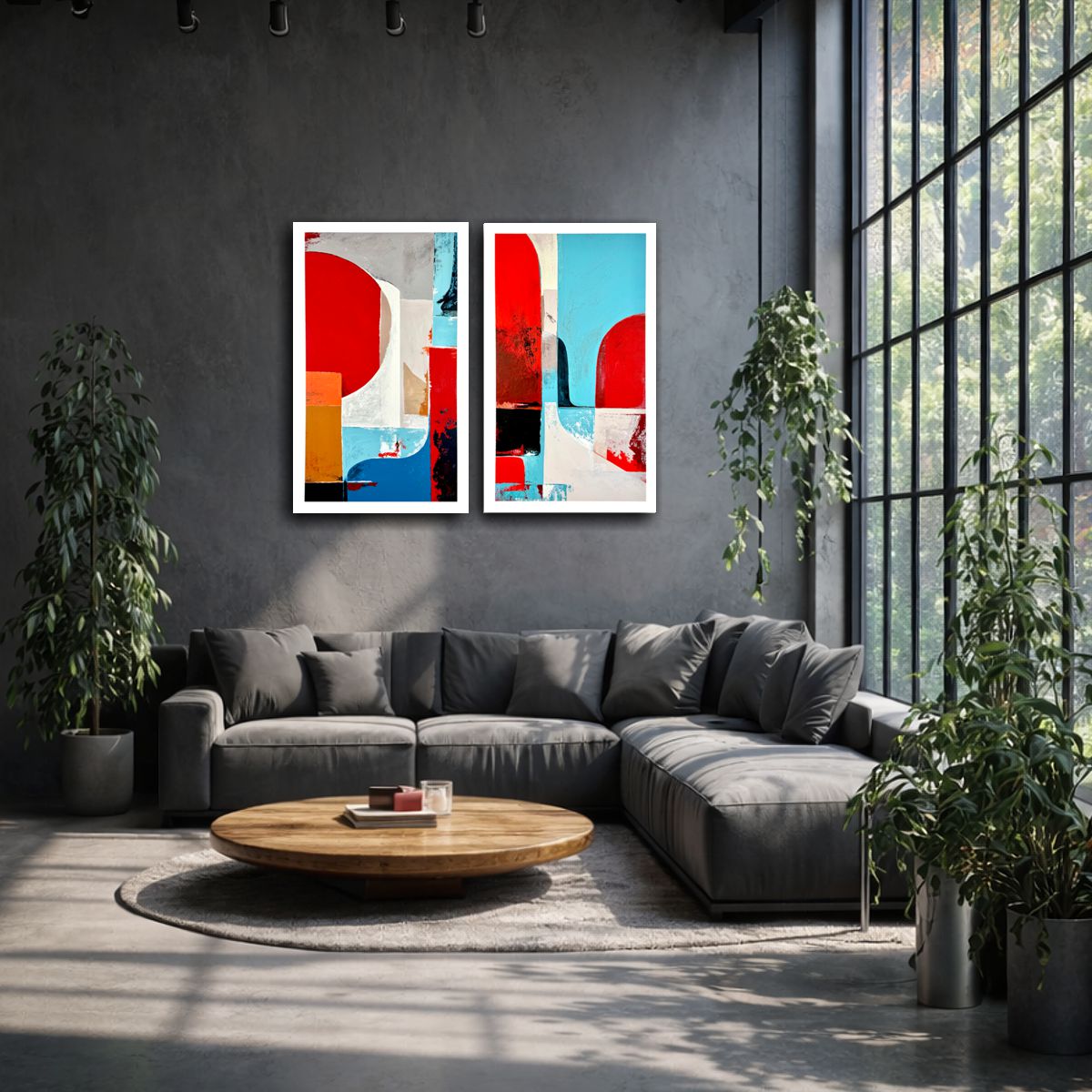Obraz dyptyk abstrakcja to nowoczesna kompozycja geometryczna zbudowana z minimalistycznych form i kontrastów kolorystycznych. Dwie części tworzą spójną całość, która buduje rytm i równowagę we wnętrzu.