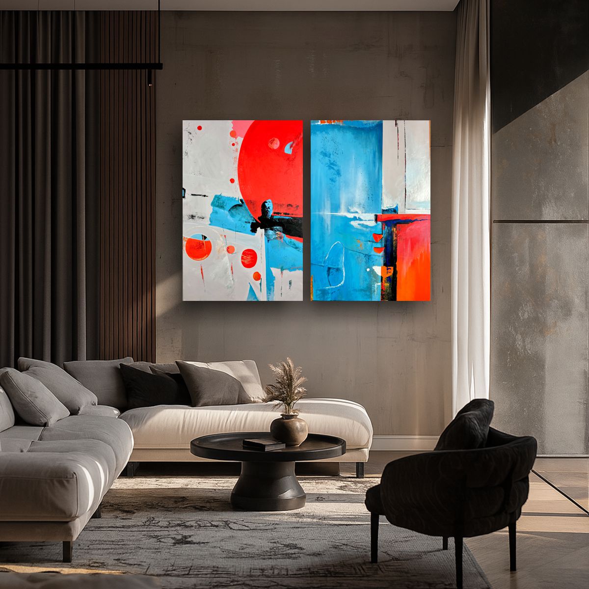 Nowoczesny obraz dyptyk abstrakcja to zestaw dwóch ręcznie malowanych obrazów tworzących spójną kompozycję geometryczną. Kontrast kolorów i duży format sprawiają, że obraz staje się centralną dekoracją wnętrza.