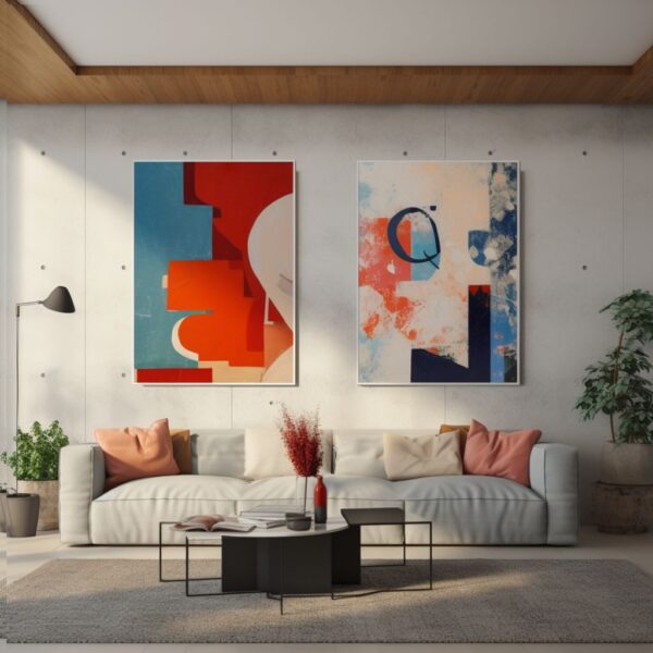 Komplet dwóch obrazów abstrakcyjnych ręcznie malowanych w żywych, energetycznych kolorach, w dużym formacie i z białym passe-partout to doskonała dekoracja nowoczesnych, monochromatycznych wnętrz.