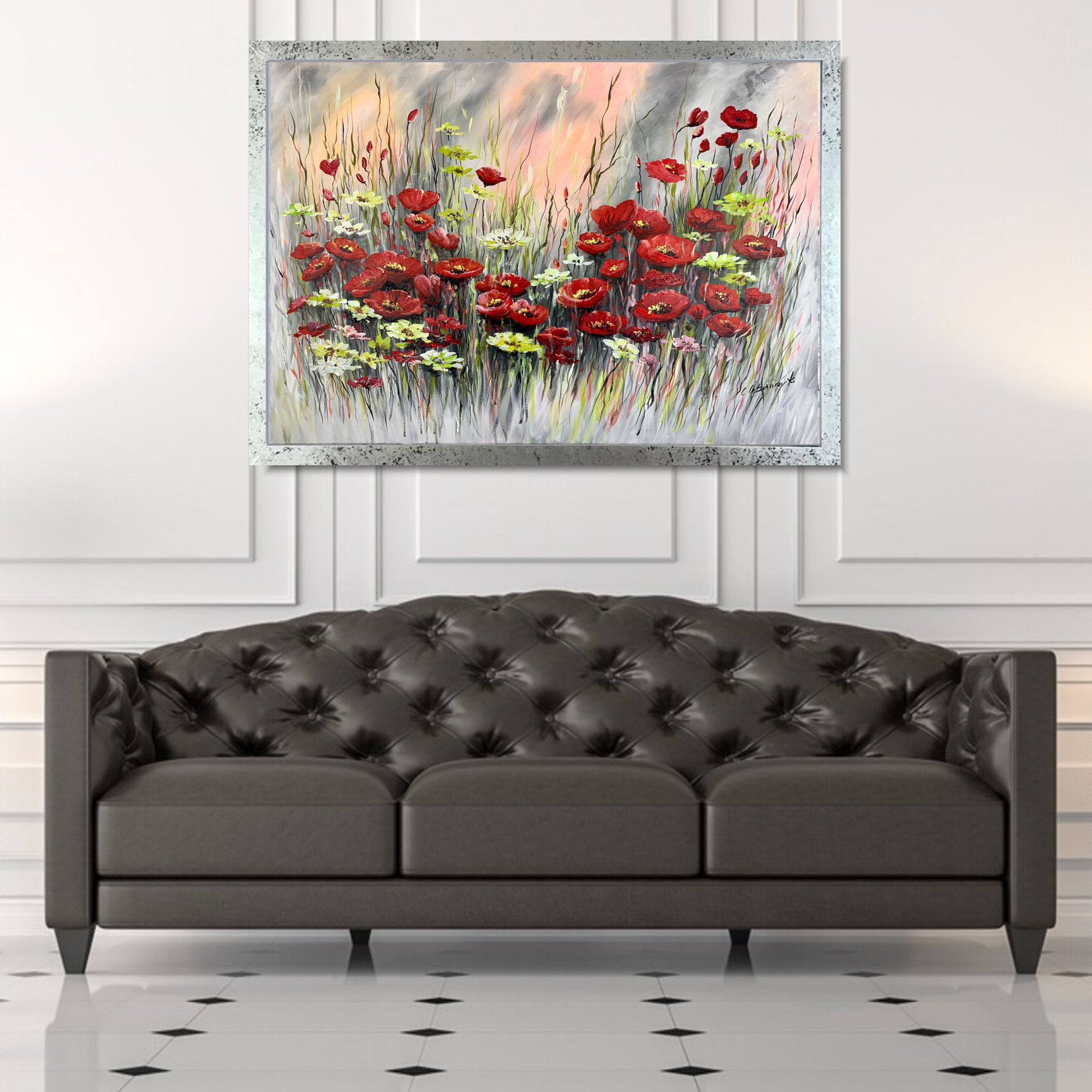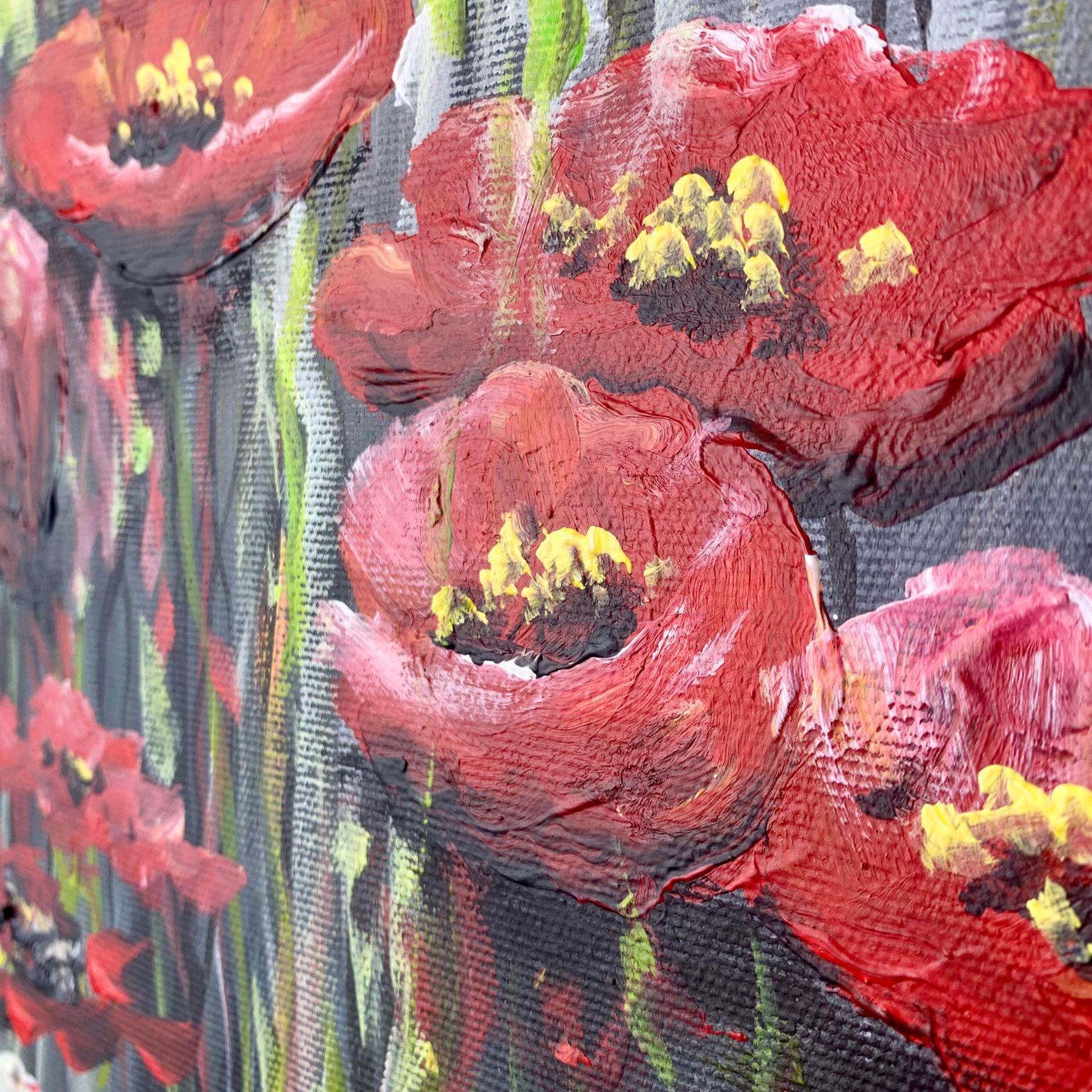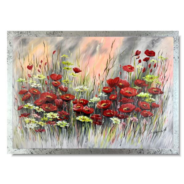 Obraz ręcznie malowany na płótnie „Makowa łąka” 2252A. Ten obraz przenosi nas w bujny ogród, gdzie czerwone maki i zielone kwiaty tworzą piękną i kontrastującą kompozycję. Kompozycja oddaje bogactwo natury i dynamikę jej barw. Czerwone maki wyróżniają się swoją intensywnością, a ich płatki zdają się pulsować życiem, przyciągając wzrok i emanując pasją. Pośród maków dostrzegamy zielone kwiaty. Ich delikatne odcienie tworzą kontrast do intensywności maki, jednocześnie tworząc harmonijną całość. To jakby spokojny oddech natury wśród emocji czerwonych kwiatów.