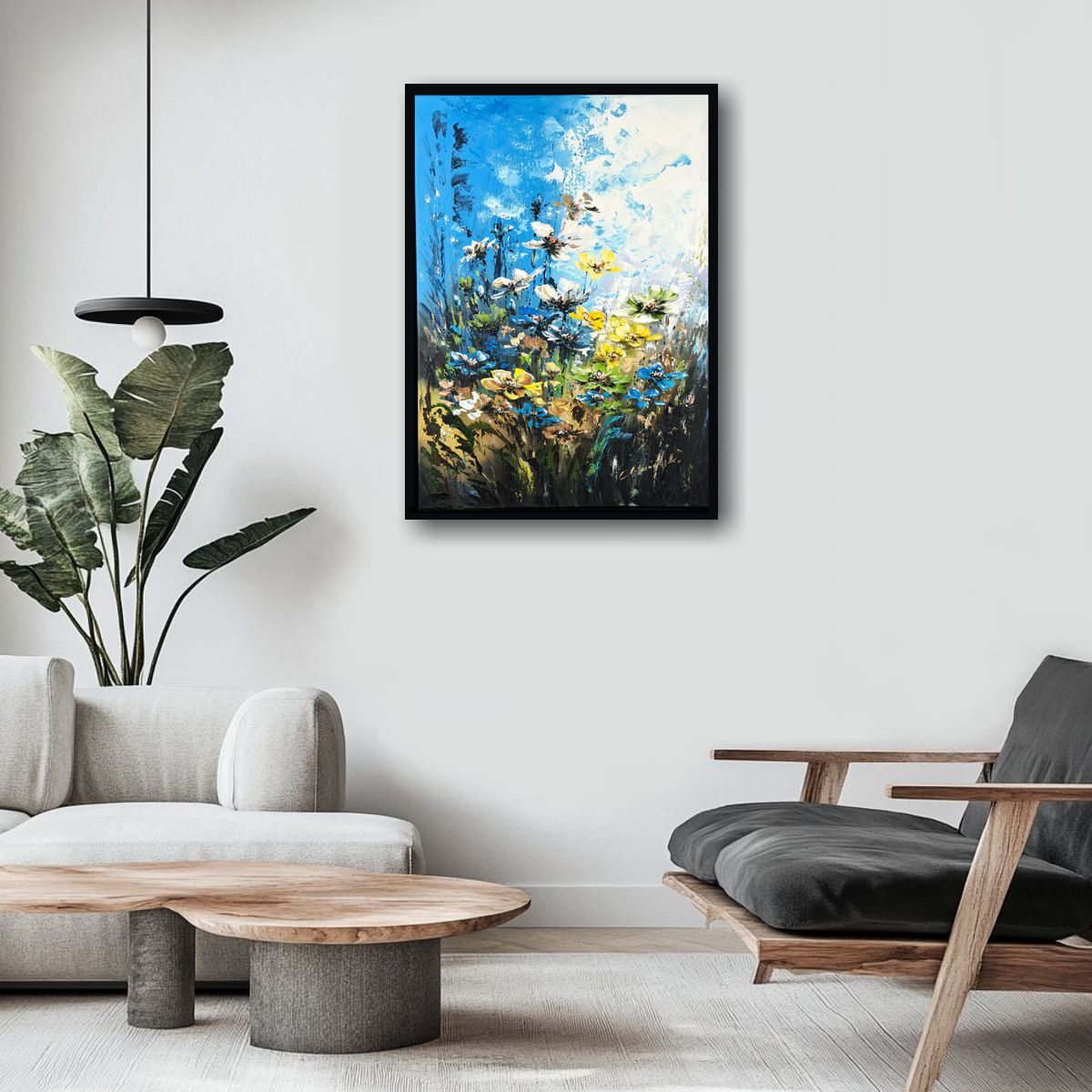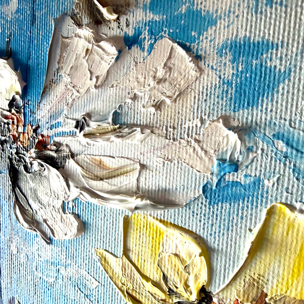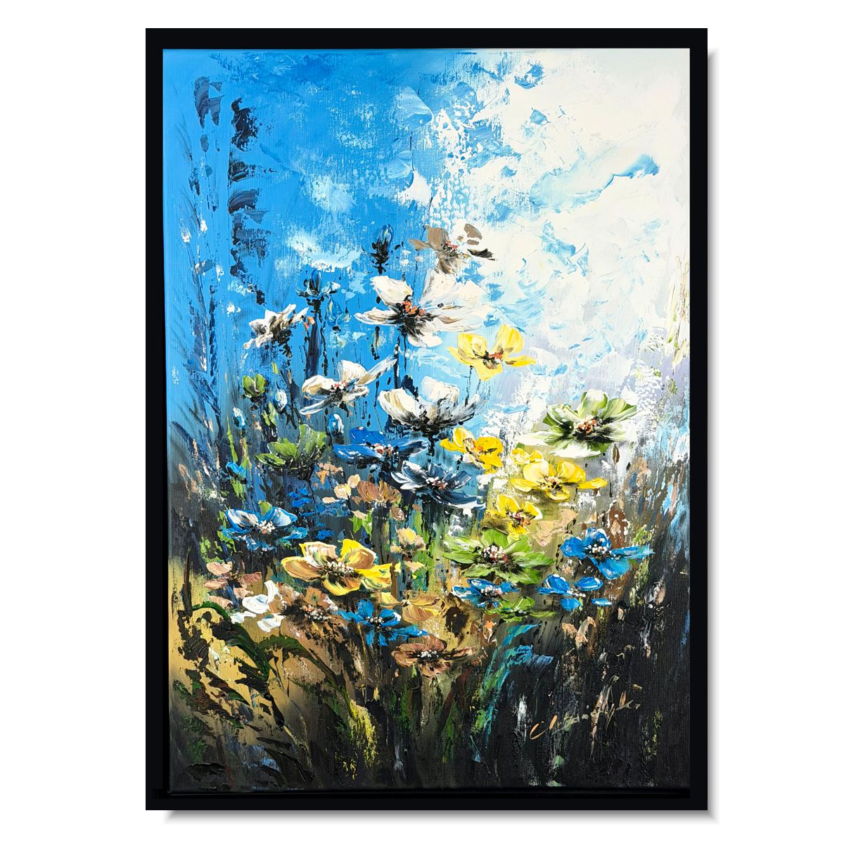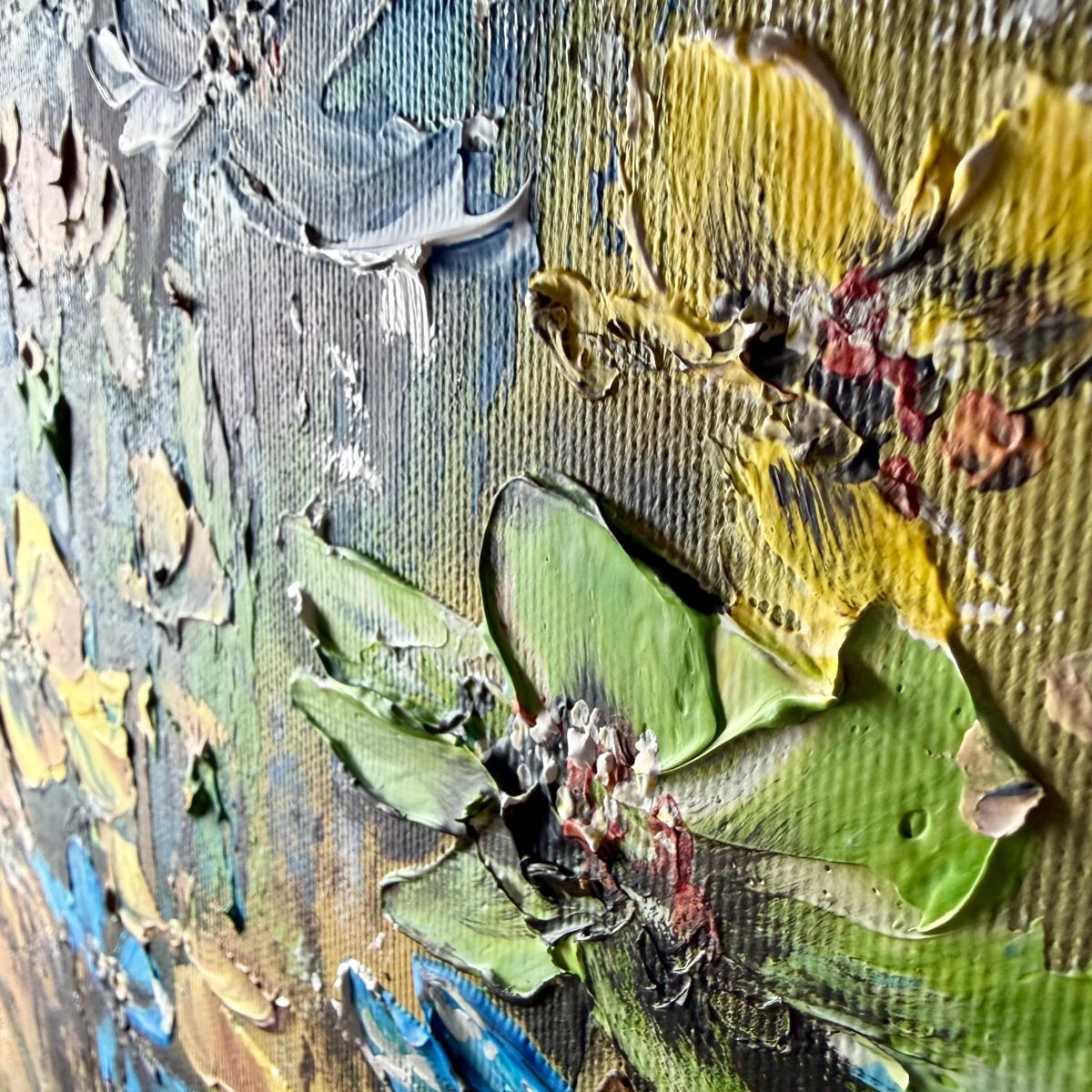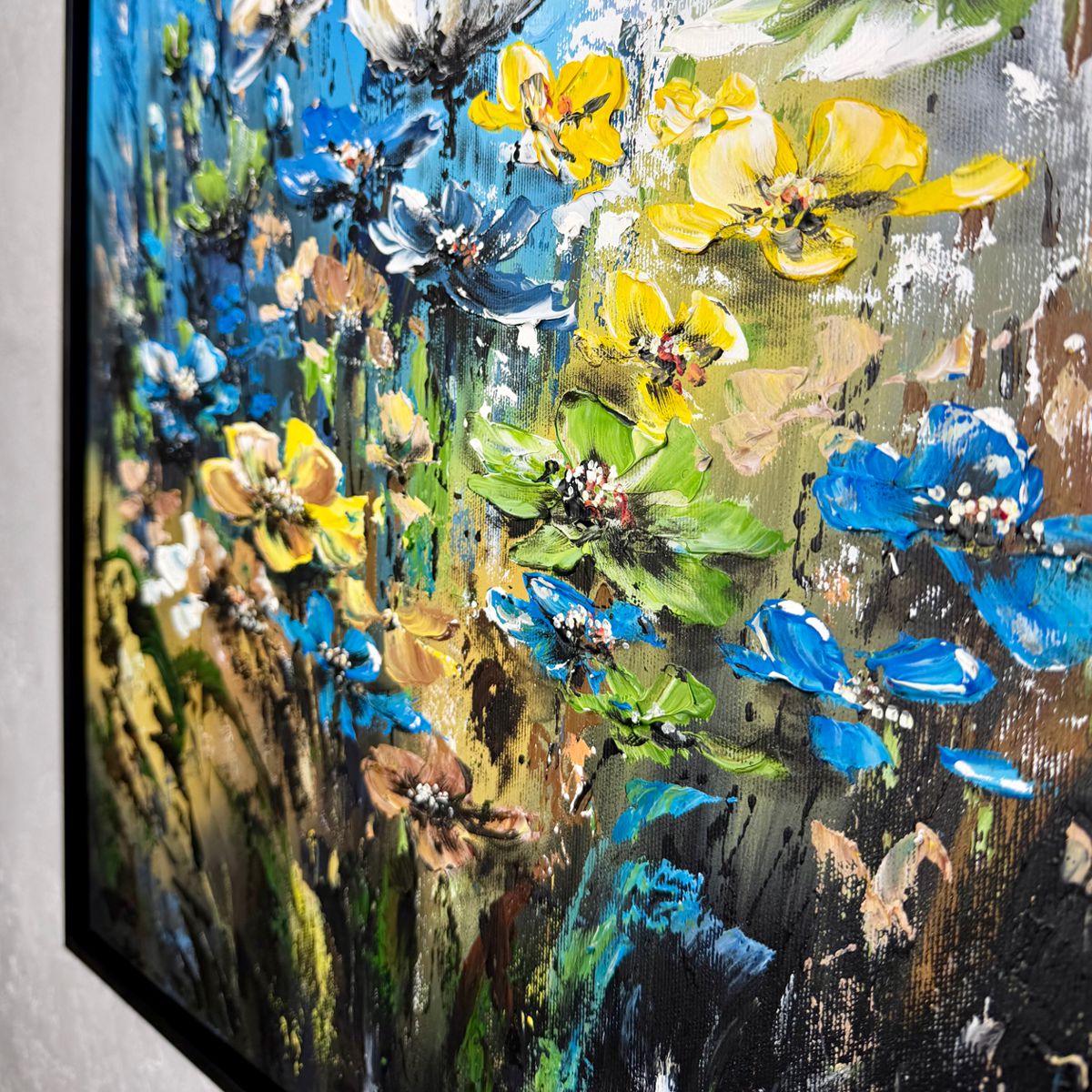Ten ręcznie malowany obraz kwiaty przedstawia abstrakcyjną kompozycję kwiatową utrzymaną w energetycznej kolorystyce błękitów, żółci i zieleni. Artystyczna struktura farby sprawia, że obraz zmienia się w zależności od światła.