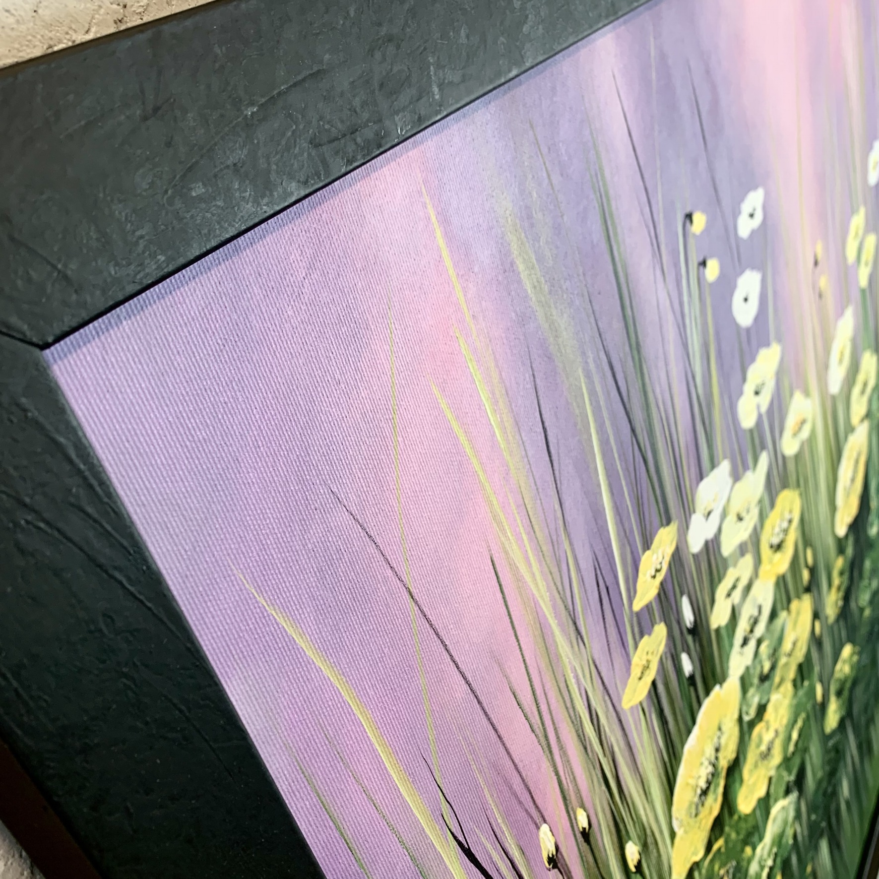 Kolorystyka obrazu: żółty, zielony, różowy, szary, biały, czarny + czarna matowa fakturowa rama (szerokość listwy 4cm)