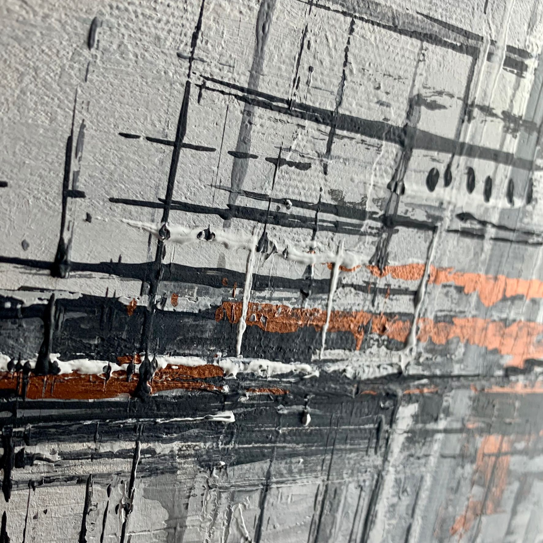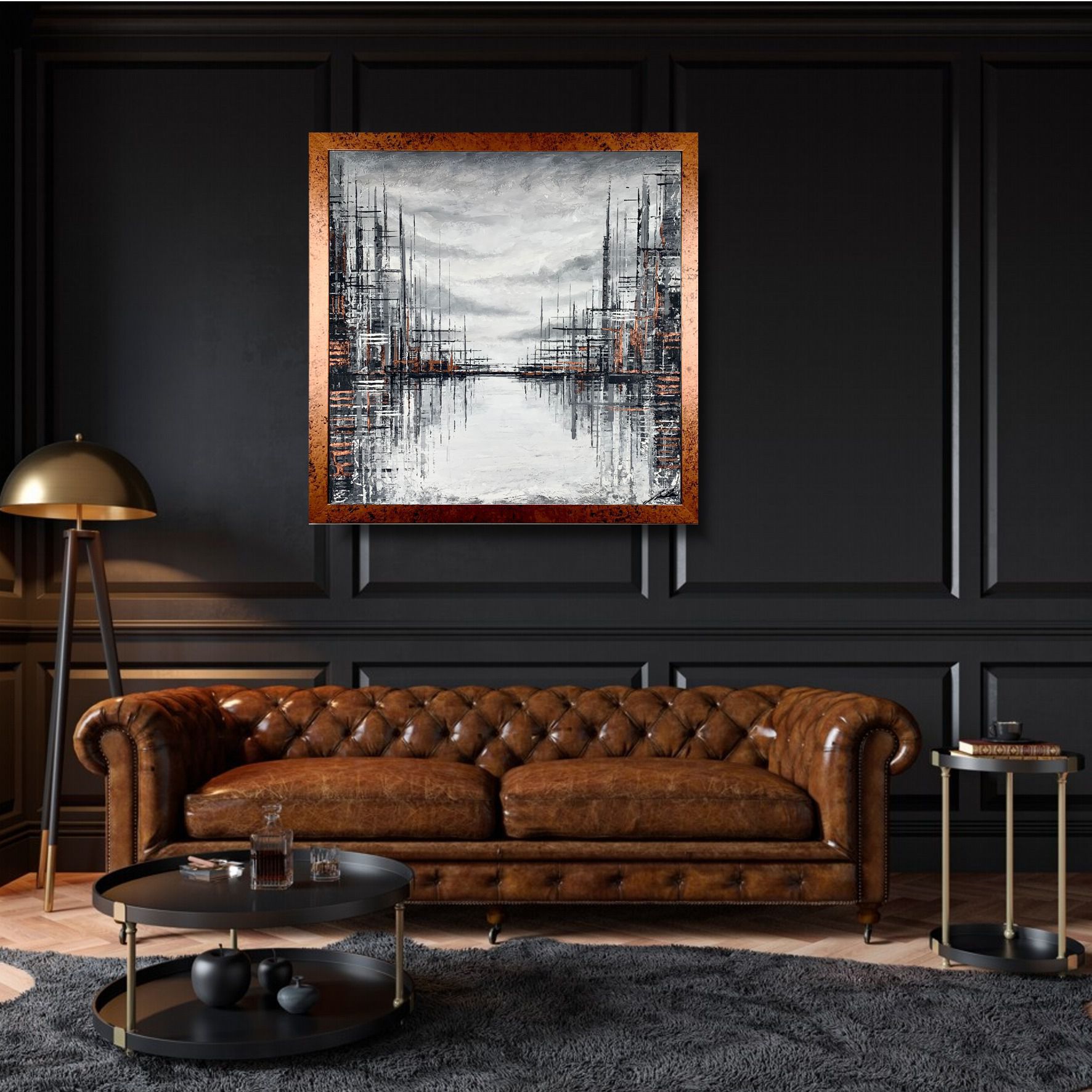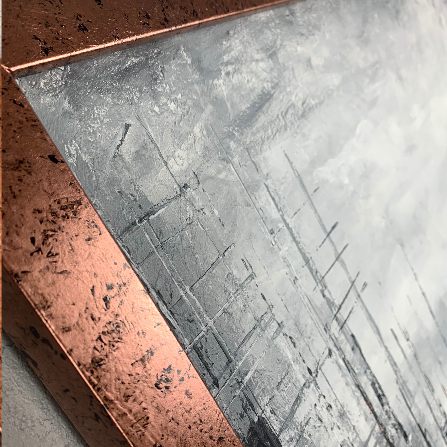 Obraz ręcznie malowany na płótnie „Miedziane miasto” 2242A to widok na miasto z oddali w odcieniach bieli, czerni i szarości z muśnięciami miedzi. Nowoczesny obraz ręcznie malowany w miedzianej przecieranej ramie. Abstrakcja spełniająca najwyższe wymagania.