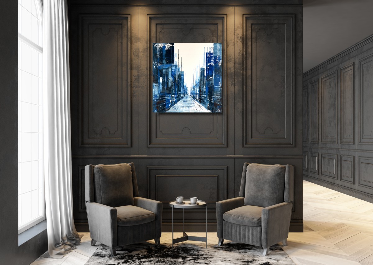 Obraz ręcznie malowany na płótnie „Lodowe miasto” 2211A to obraz, który wizualnie oddaje siłę koloru i faktury. Jest to jakby zapis energii i chwili zamykającej się w warstwach farby. To dzieło sztuki, które mówi zarówno o ruchu, jak i spokoju, jednocześnie zachęcając do refleksji nad pięknem abstrakcyjnej ekspresji. Niebieski obraz miasta przenosi nas w świat ekspresji, gdzie strukturalne warstwy farby tworzą dynamiczną kompozycję. Malowanie szpachelką nadaje dziełu teksturę i trójwymiarowy charakter, tworząc wrażenie ruchu i energii.
