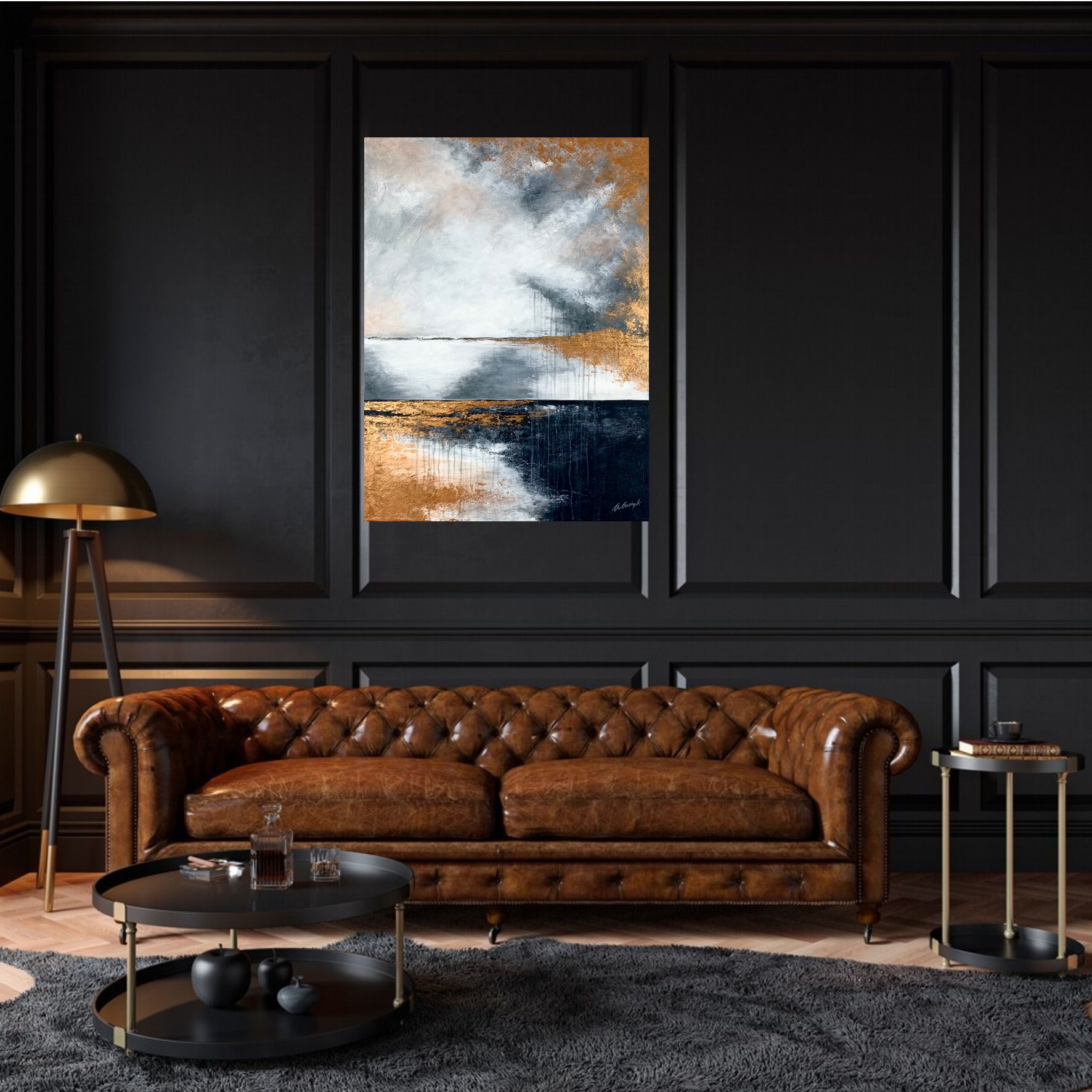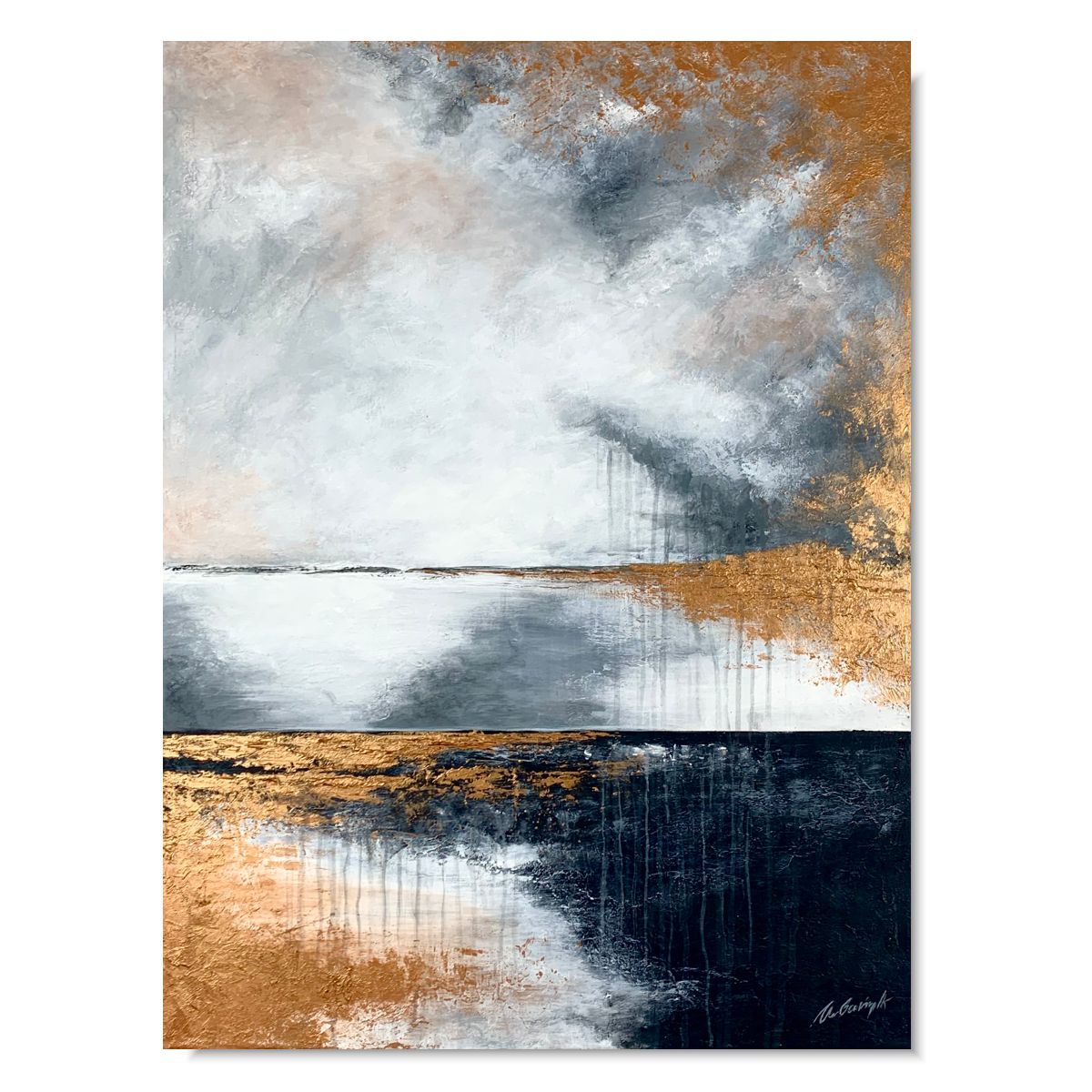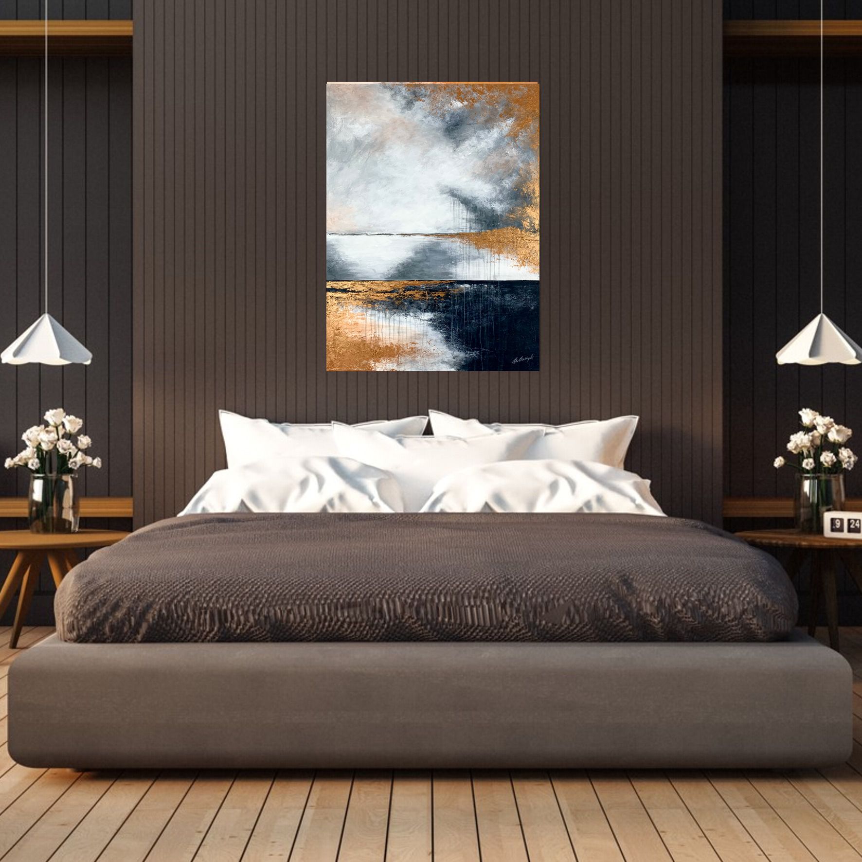Kolorystyka obrazu: miedziany, szary, biały, czarny. Boki wykończone pod kolor dzieła.