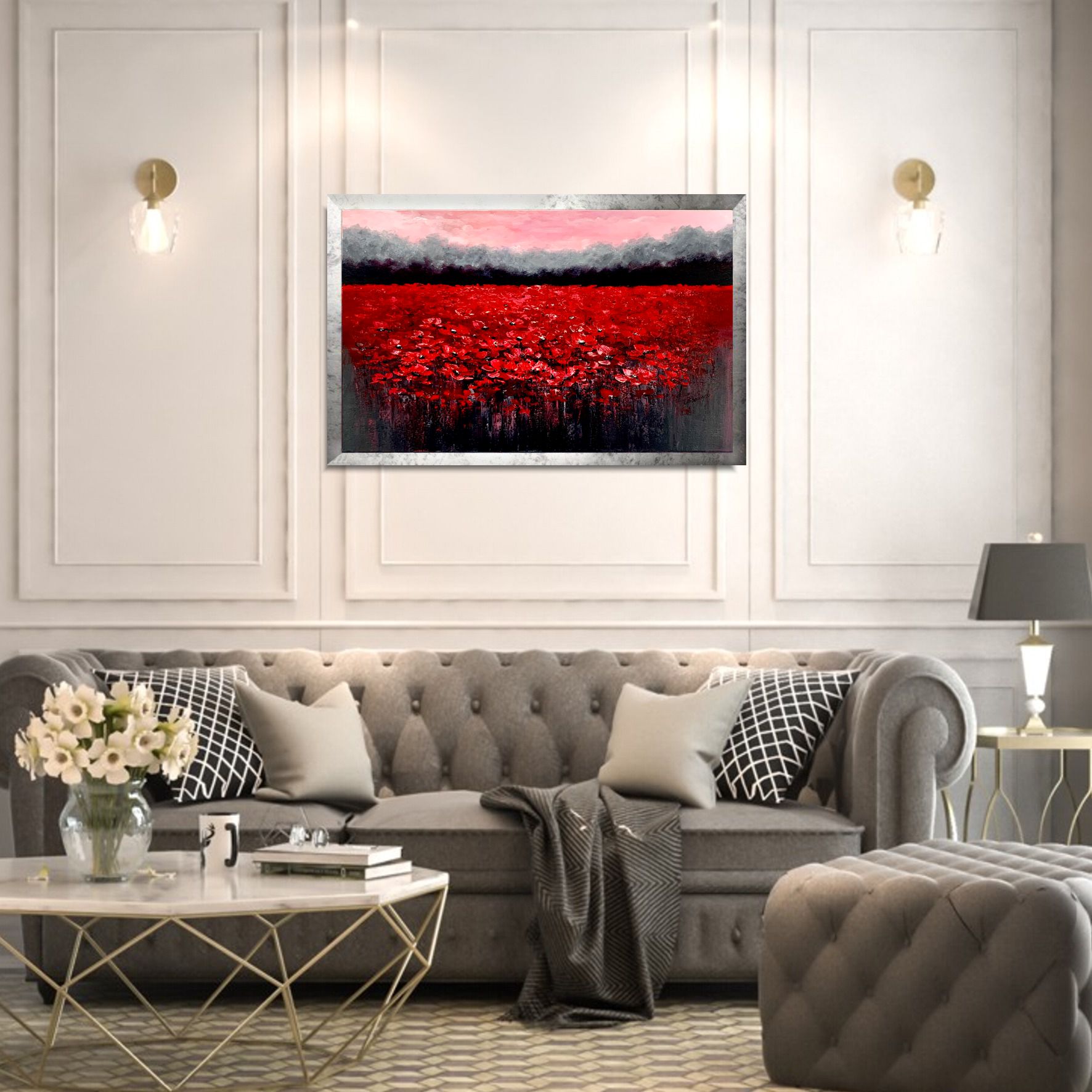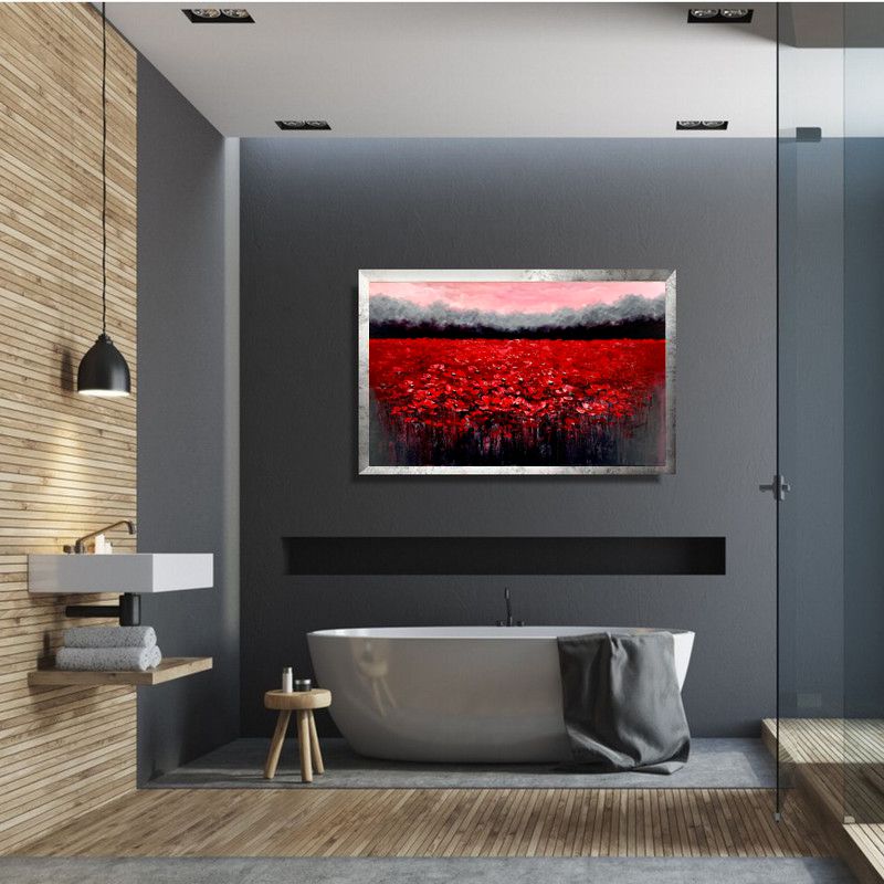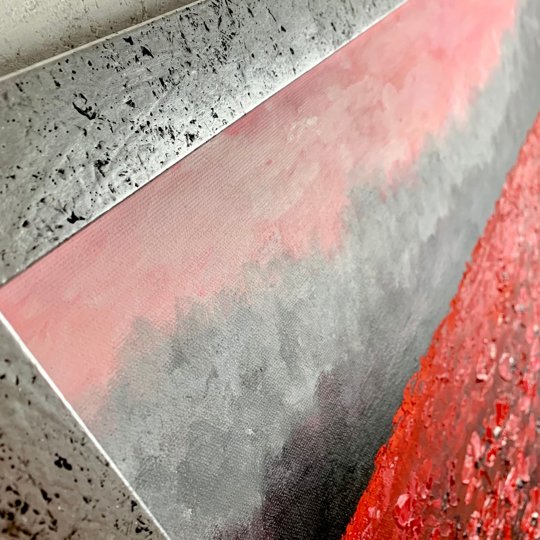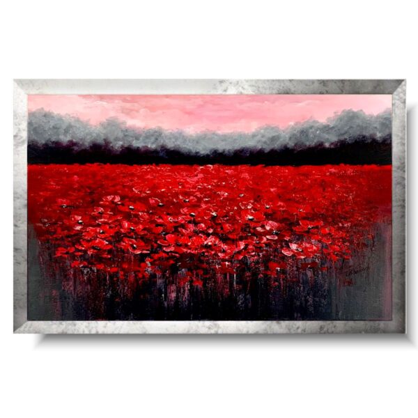 Kolorystyka obrazu: czerwony, różowy, szary, biały, czarny + srebrna przecierana rama (szerokość listwy 4cm)