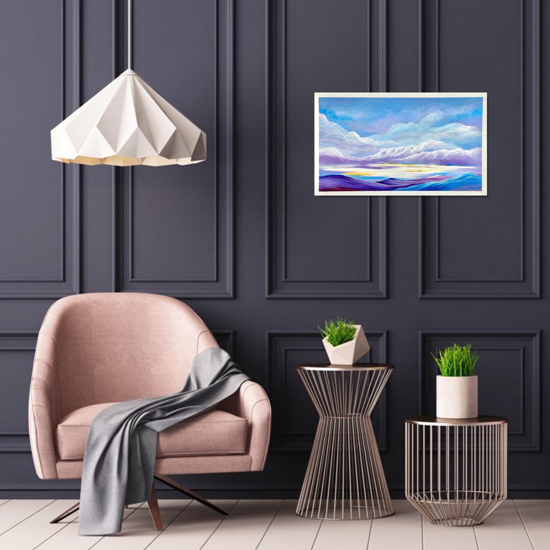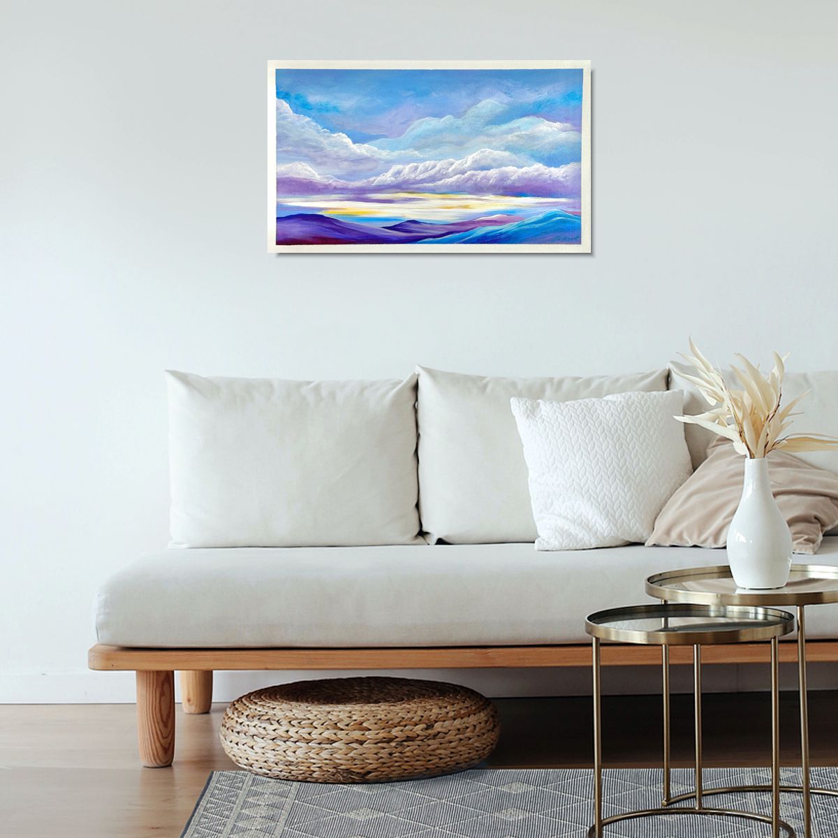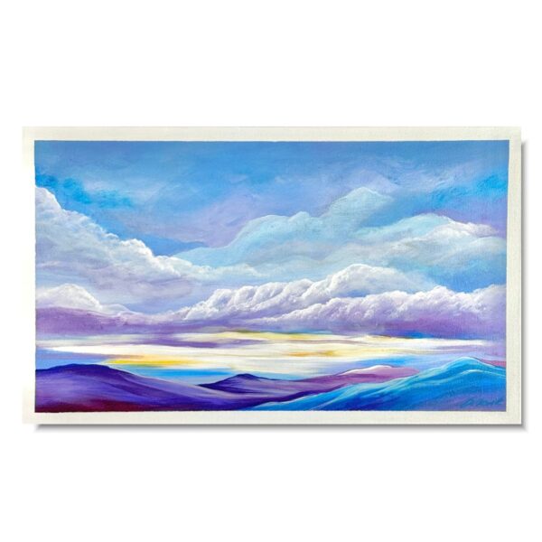 Obraz pejzaż „Wędrówka” obrazy na płótnie 2133A malowany pociągnięciami pędzla naśladującymi realizm francuski, jednak w nowoczesnym wydaniu. Barwy pastelowe, jasne , niekrzykliwe nadają spokoju całej kompozycji, a uwydatnione różnice pomiędzy niebem a górami akcentują horyzont oraz nadają przejrzysty nastrój pracy. Obraz w ramie pejzaż wędrówka naszego autorstwa w błękitnej kolorystyce i z białym malowanym passepartoyt. Użyte farby akrylowe są w optymistycznych kolorach. Idealnie ozdobi nowoczesny salon czy modne biuro. Wykonujemy także obrazy marynistyczne, obrazy kwiaty, obrazy aniołów, obrazy dzielone – dyptyk, tryptyk, fortyk, obrazy jednoczęściowe w dużym formacie. Możemy namalować każdy obraz z naszej oferty w zmienionych wymiarach lub kolorystyce, możemy namalować obraz dzielony na jednej części lub obraz jednoczęściowy podzielić na kolka części.