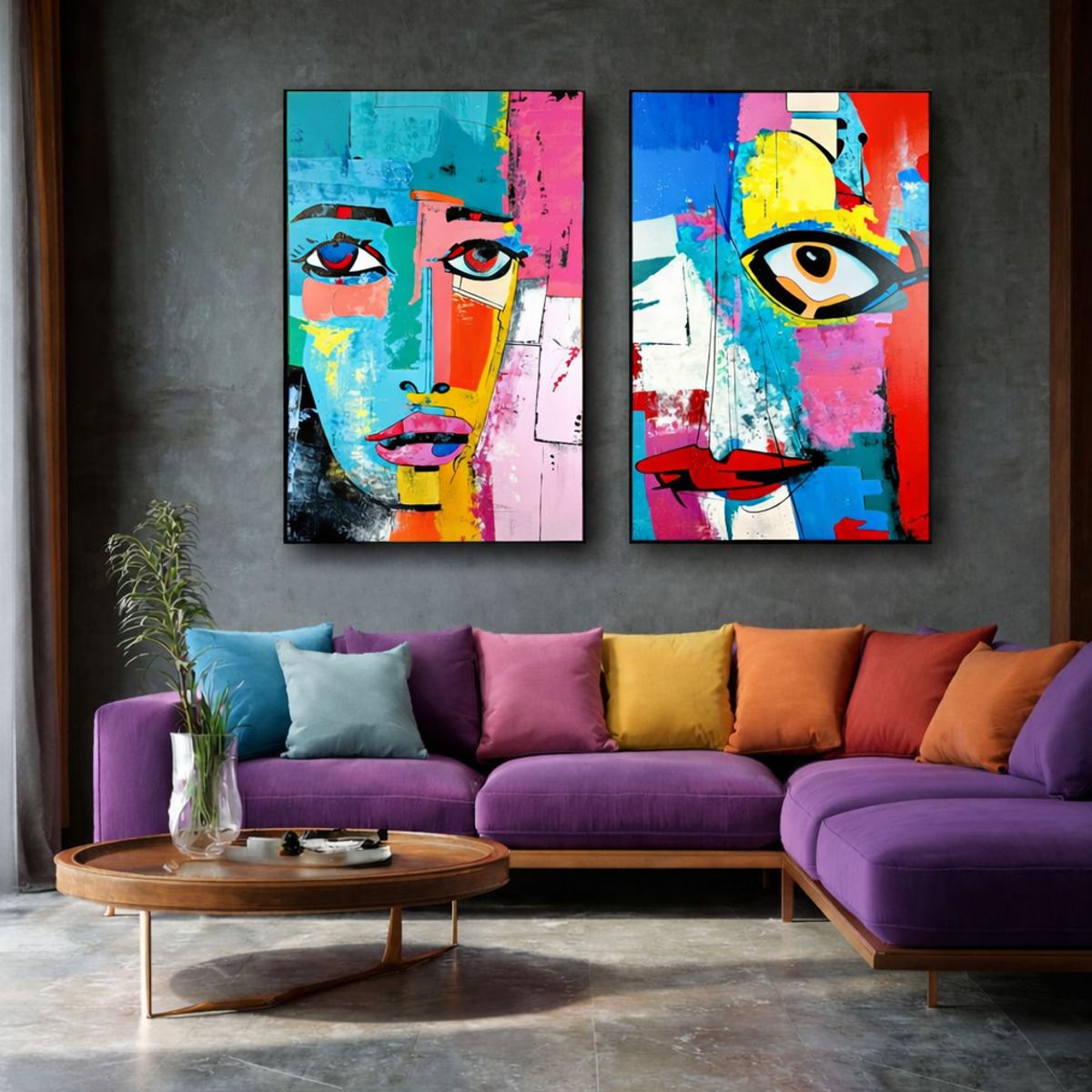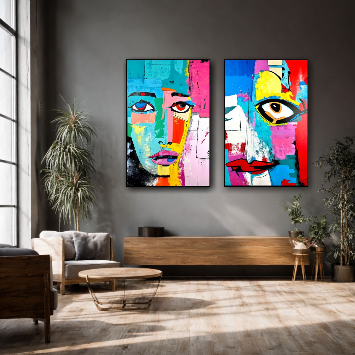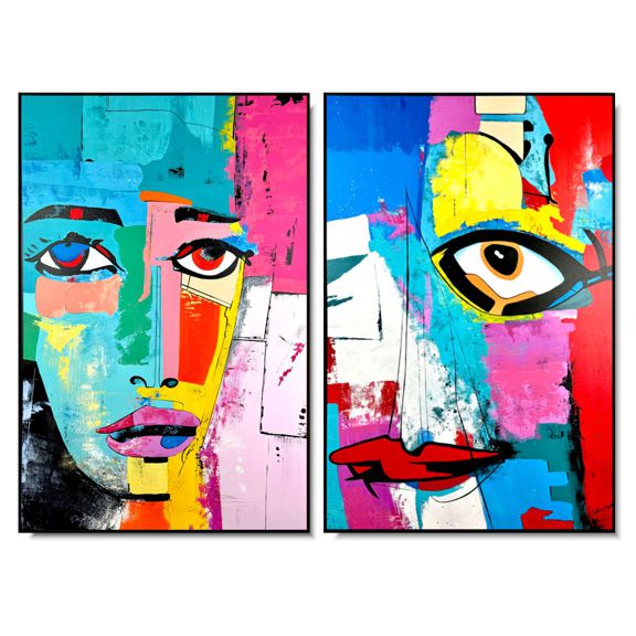 Ten ręcznie malowany obraz portret kobiety nowoczesny składa się z dwóch części tworzących jedną spójną kompozycję. Abstrakcyjna interpretacja twarzy nadaje obrazowi unikalny i artystyczny charakter.