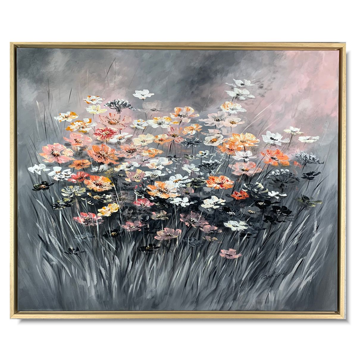Obraz ręcznie malowany na płótnie „Polne kwiaty” 2296A to bardzo delikatny i stonowany obraz z pięknymi kwiatami dopełniony ramą typu american box w naturalnym kolorze drewna.