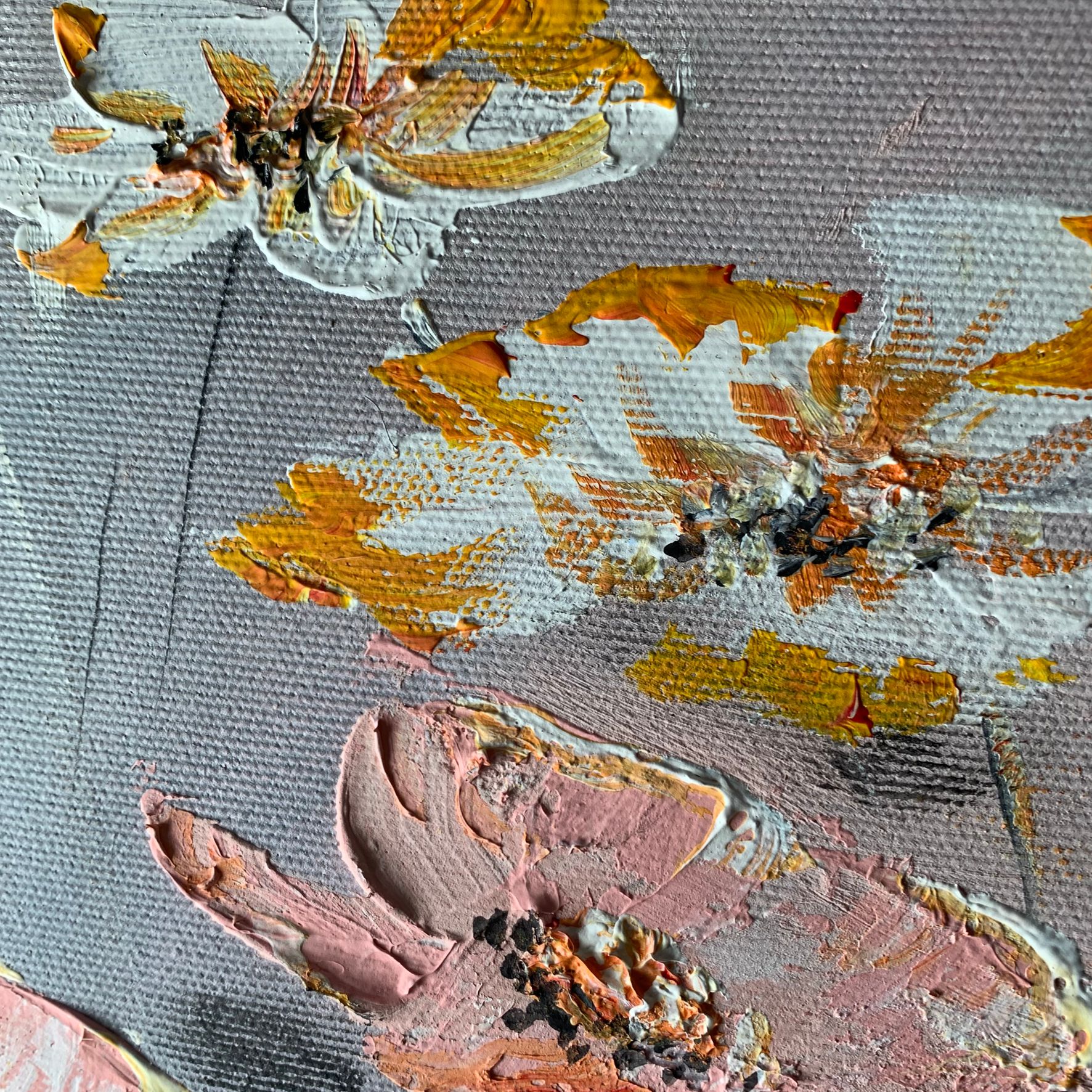 Kolorystyka obrazu: szary, pomarańczowy, łososiowy, żółty, brudny róż + rama