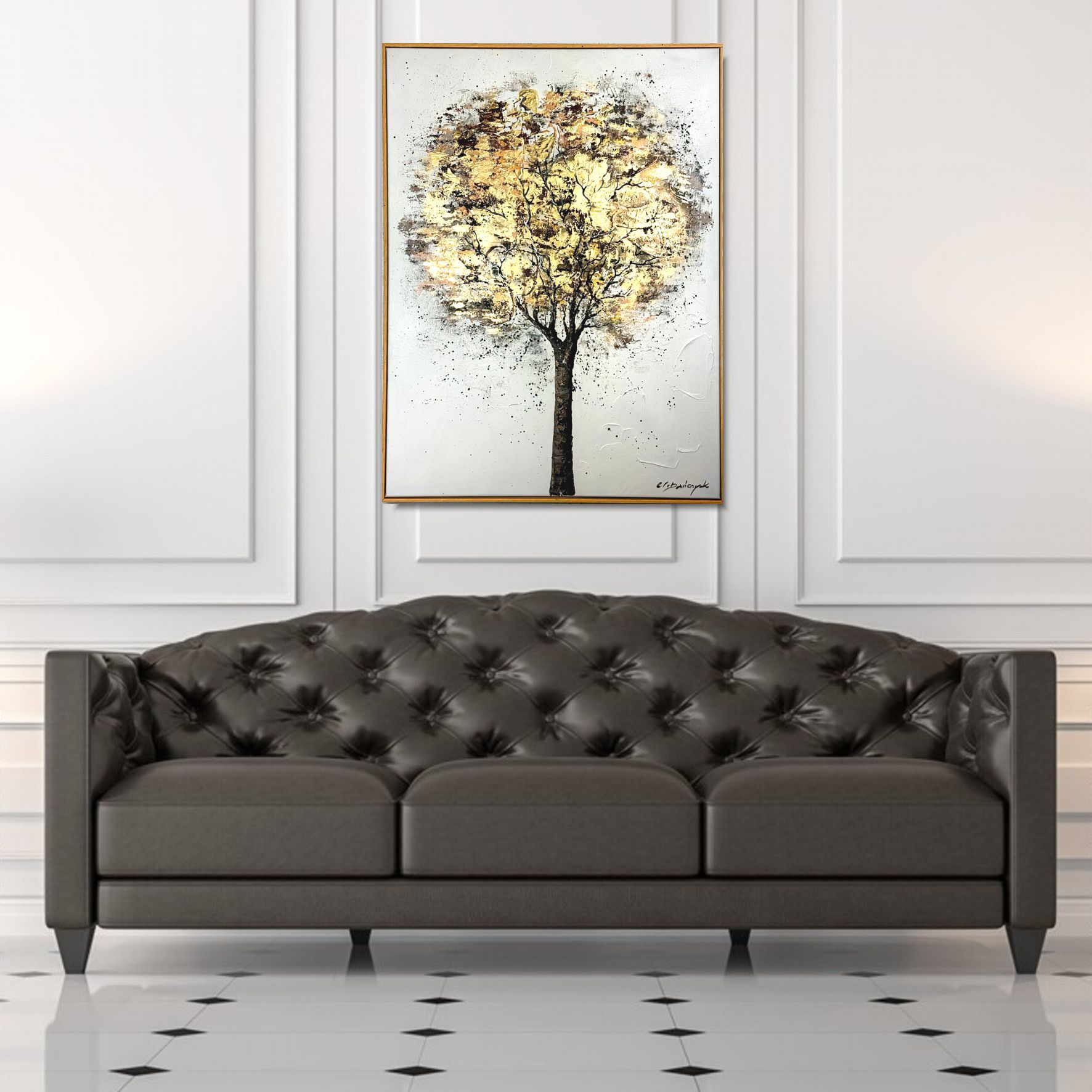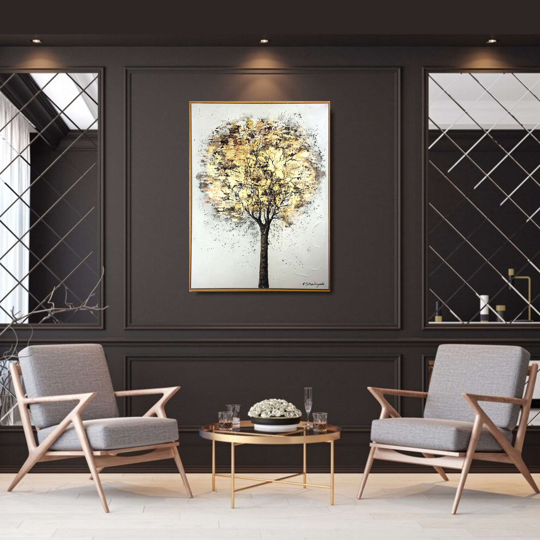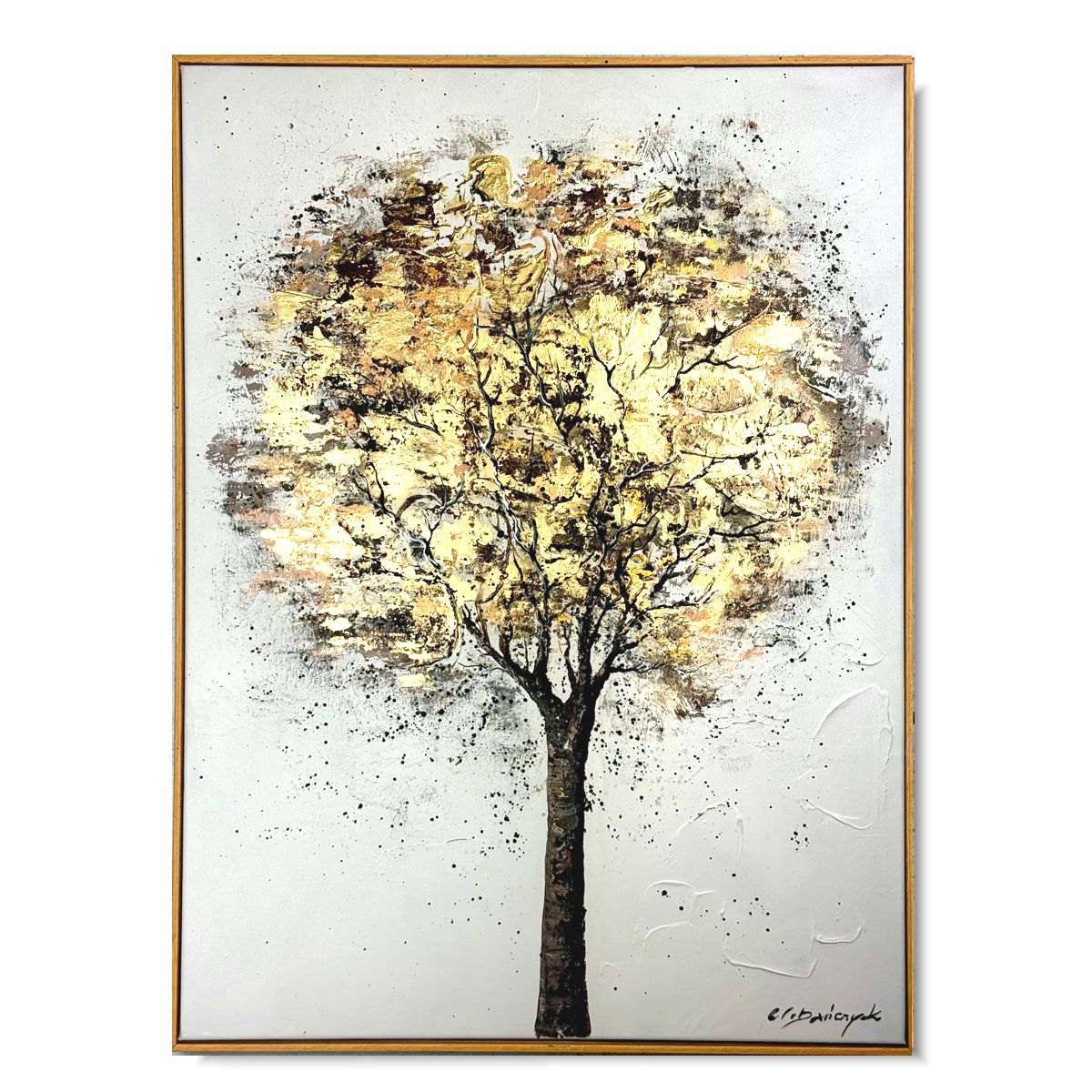 Obraz ręcznie malowany na płótnie “Złote drzewko” 2322A to elegancki obraz w delikatnej pudełkowej ramie. Obraz malowany farbami akrylowymi ze złotymi akcentami i grubą fakturą farby widoczną na zbliżeniu.