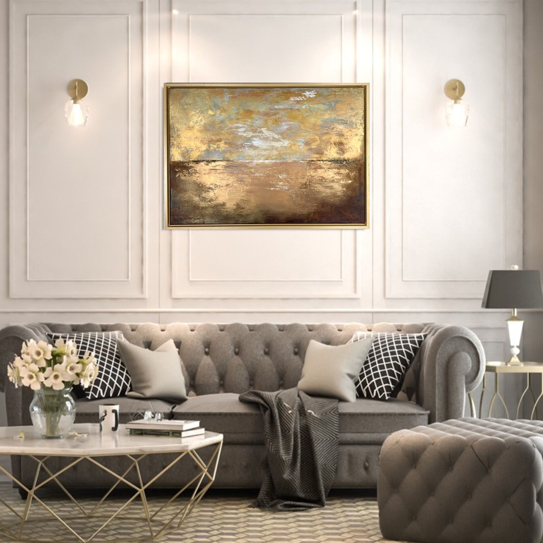 Obraz ręcznie malowany złota abstrakcja składa się z 1 części + rama w komplecie