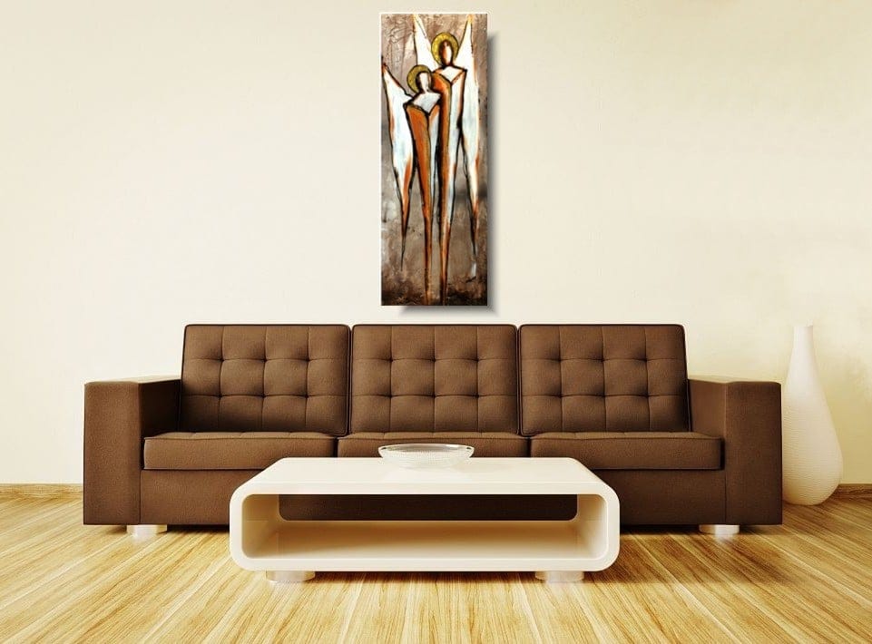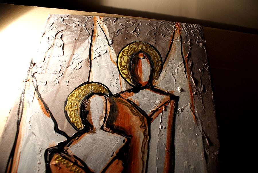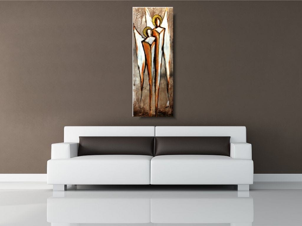 Obrazy rękodzieło anioły szczęścia wykonane z wykorzystaniem zaskakującej techniki to oryginalna propozycja naszego autorstwa. Obraz malowany na płótnie naciągniętym na krosna o grubości 2 cm, wyróżniający się niebanalną strukturą oraz ciekawą kolorystyką w odcieniach beżu, pomarańczu, rudego oraz złotego, a także nutą białego, czarnego i szarego.