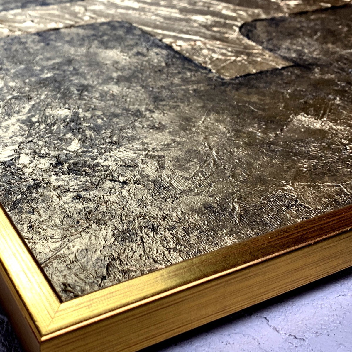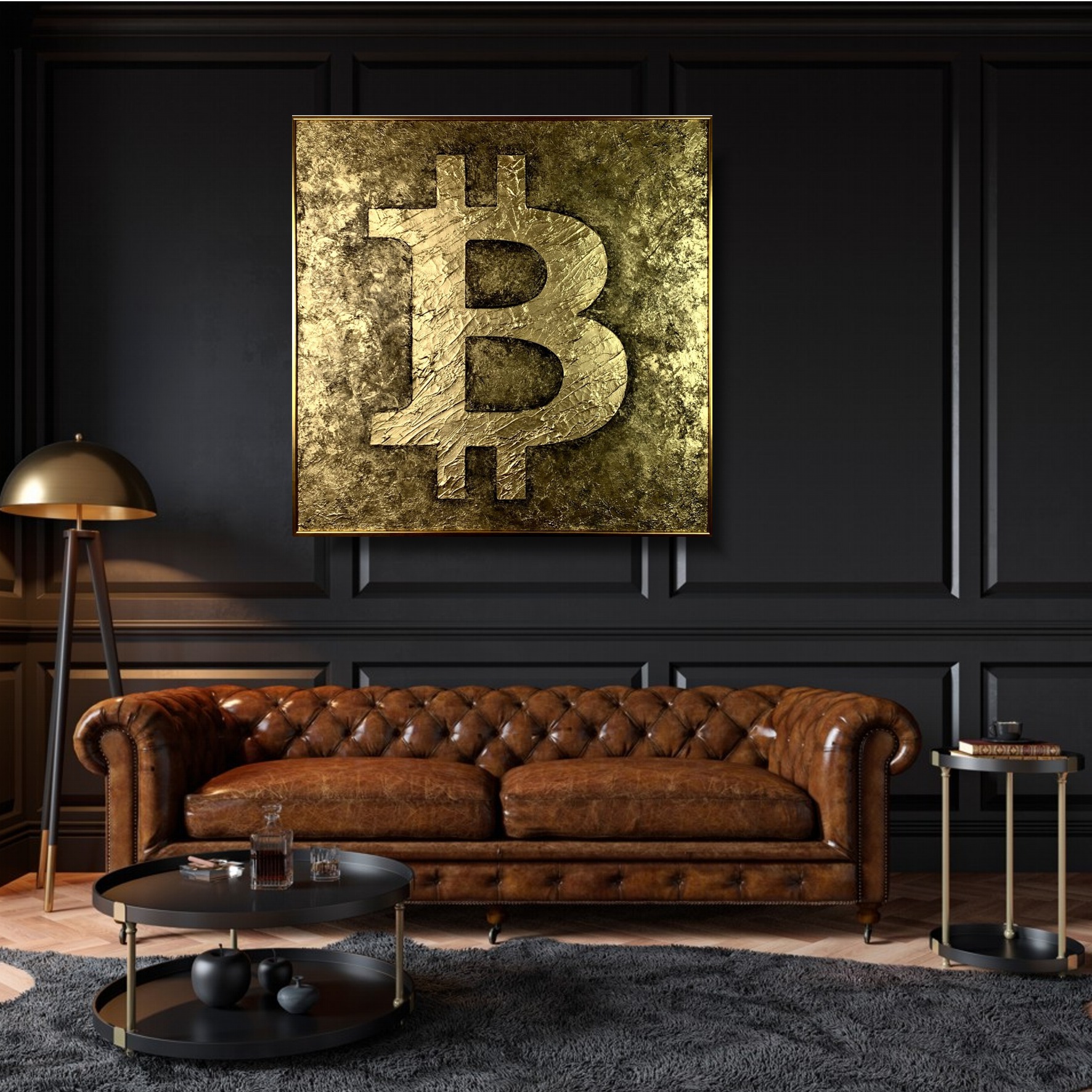 Obraz do salonu golden bitcoin to kwadratowa abstrakcja ręcznie malowana w złotej prostej ramie. Obraz idealny na prezent dla miłośnika kryptowalut. Abstrakcja to nasza specjalność.