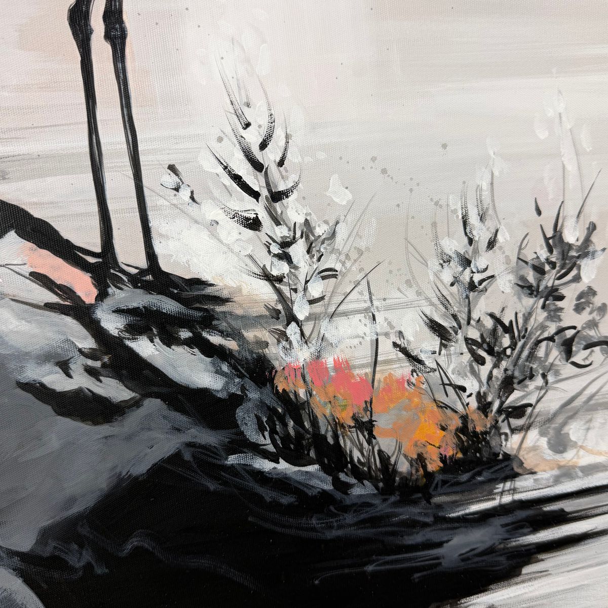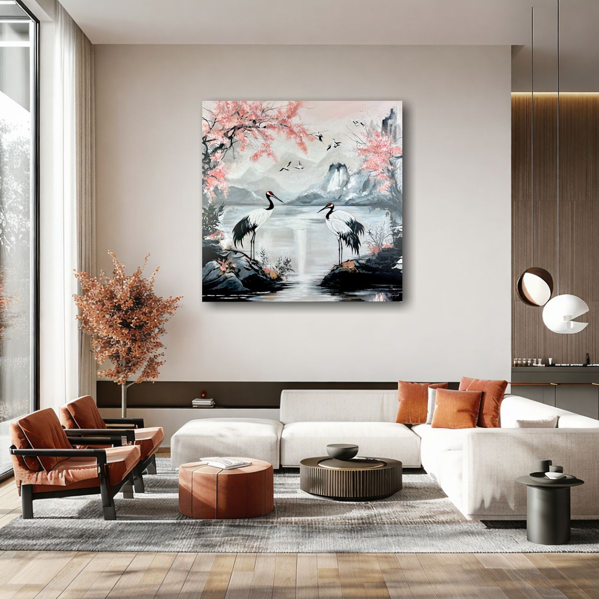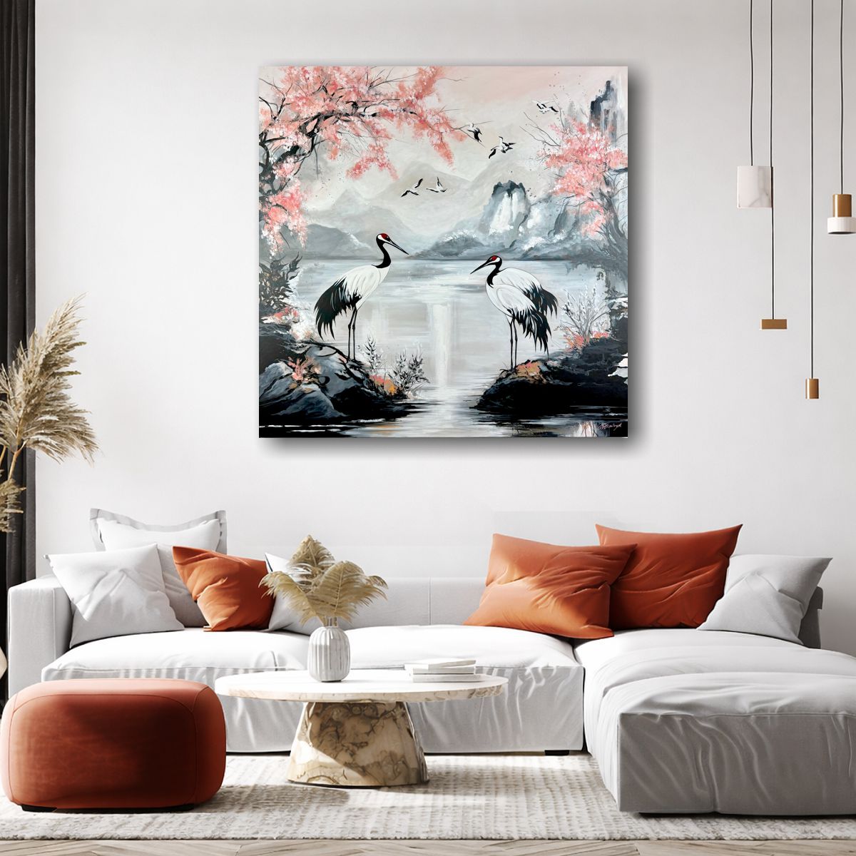 Ten wyjątkowy obraz żurawie przedstawia spokojny krajobraz inspirowany naturą i sztuką Dalekiego Wschodu. Subtelne kolory oraz lekka, malarska forma nadają mu niezwykłej lekkości.