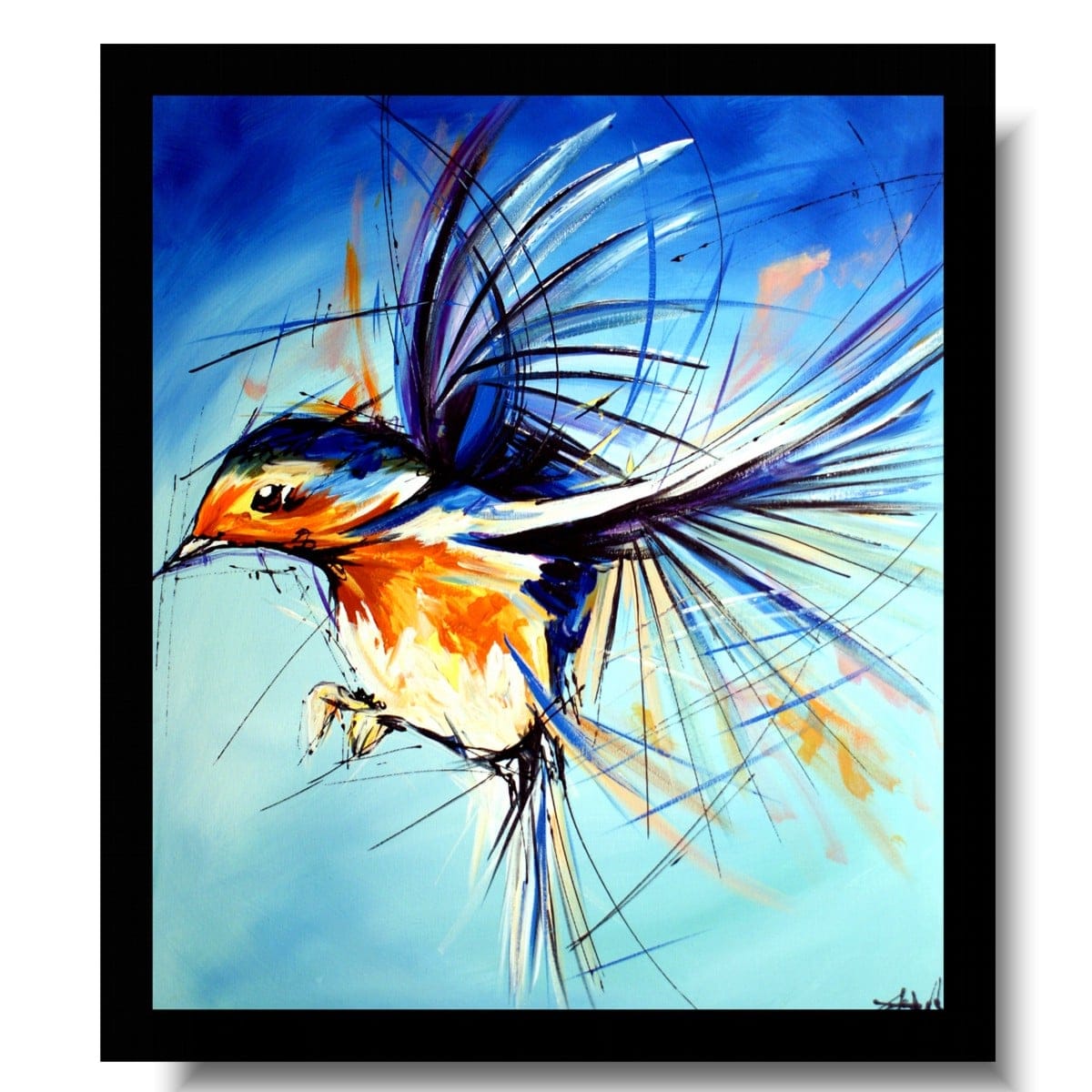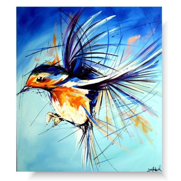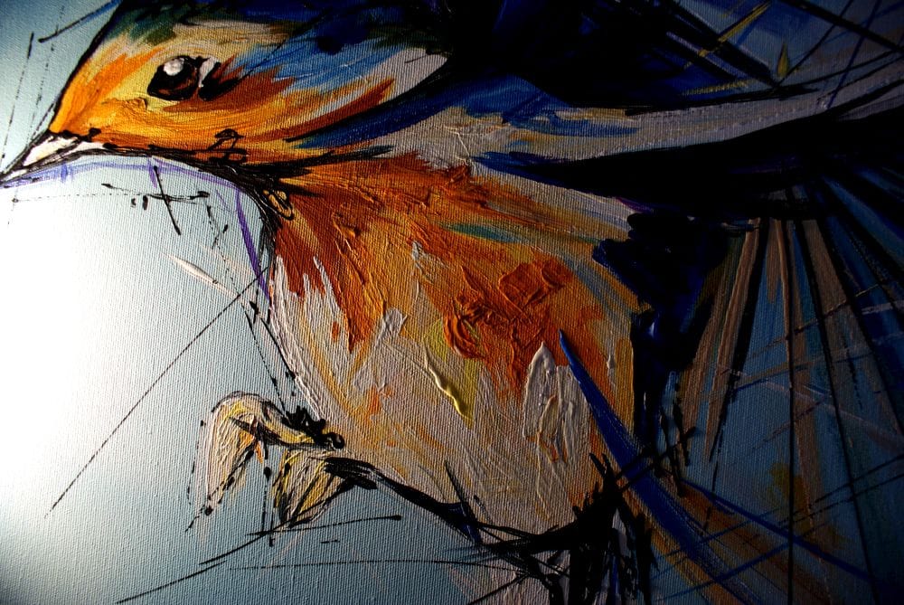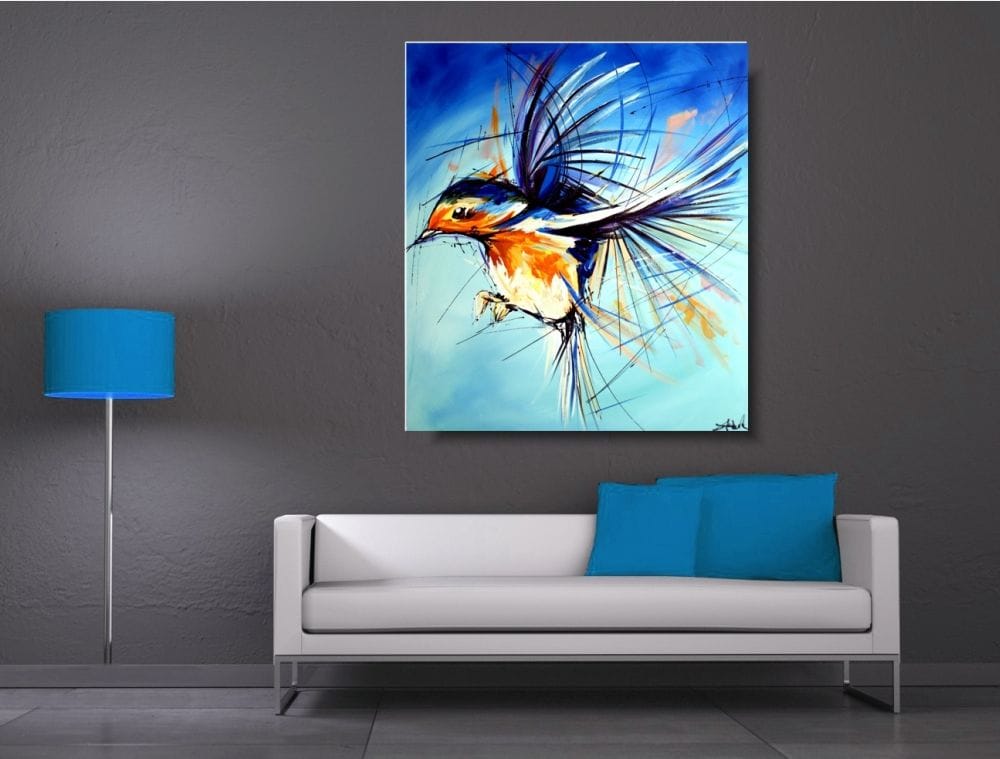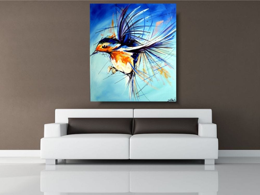 Obraz zwierzęta ptaszek wróbel na wietrze w ciekawej kolorystyce. Modny obraz jest niekonwencjonalny pod względem formalnym jaki i warsztatowym. Do namalowania tego obrazu użyto całej palety barw, co daje efekt nowoczesnego designu. Obraz może ożywić modne jednobarwne wnętrze – salon, biuro, korytarz, restaurację, pub. Możemy namalować – obrazy z motylami, obrazy z końmi, obrazy z zebrami.