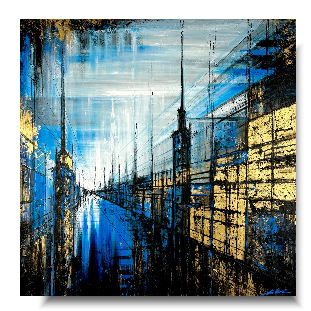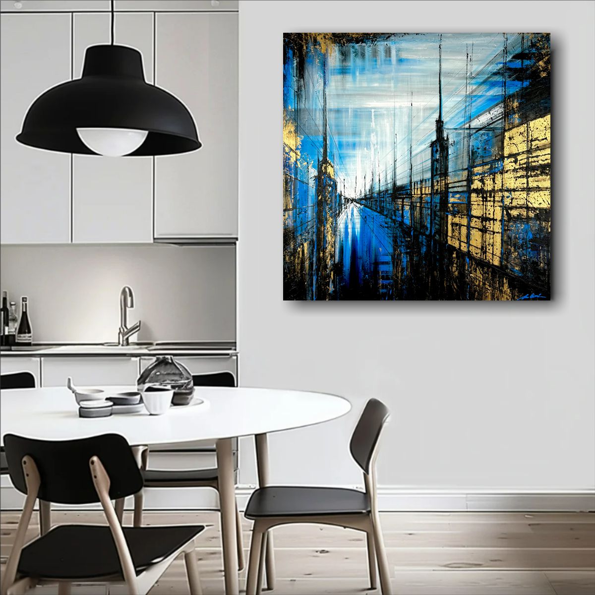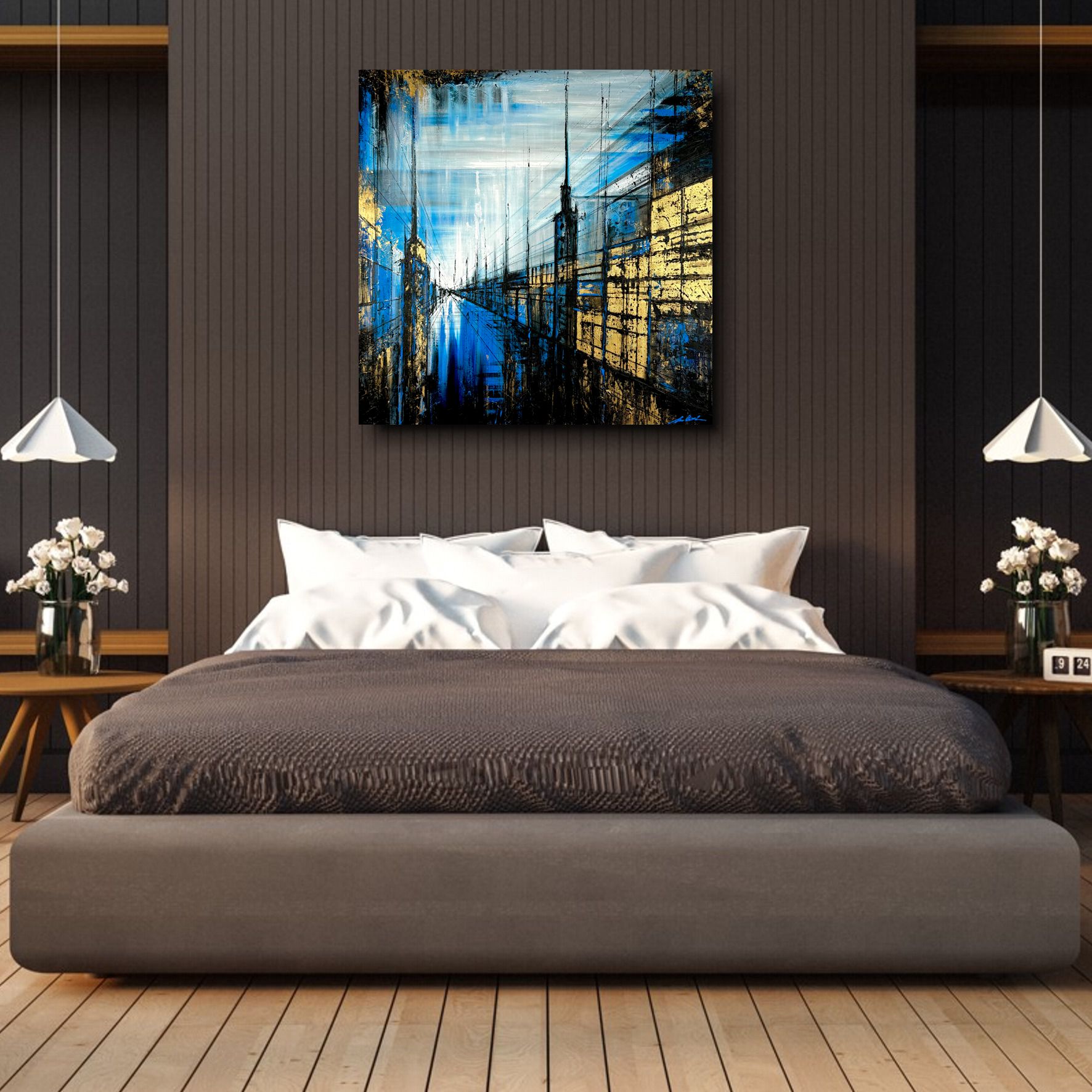 Obrazy ręcznie malowany na płótnie „Nocne miasto” 1899A obraz przestawiony w graficznej formie i bardzo ograniczonej gamie kolorystycznej. Dzięki użyciu różnych narzędzi do nakładania farby obraz zyskuje trójwymiarowości i głębi. Użyte dodatkowo złoto w budowaniu brył budynków tworzy odpowiednio różne kształty i oddziela od siebie poszczególne elementy kompozycji. Obrazy miasta wyróżniają się oryginalnością, nawiązują do klasycznych wzorców i najnowszych trendów – kolory wybieramy z najmodniejszej palety barw, wzory inspirowane są nowościami w designie. Zapraszamy do sprawdzenia innych kategorii: obrazy do biura, obrazy do salonu, obrazy do sypialni, obrazy abstrakcje, obrazy kwiaty. Jeśli nie znajdą Państwo niczego interesującego malujemy także obrazy na zamówienie w pełni dostosowane do Państwa wymagań.