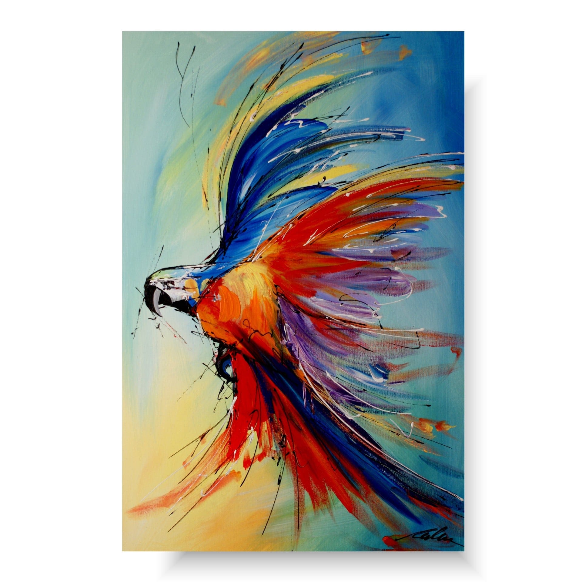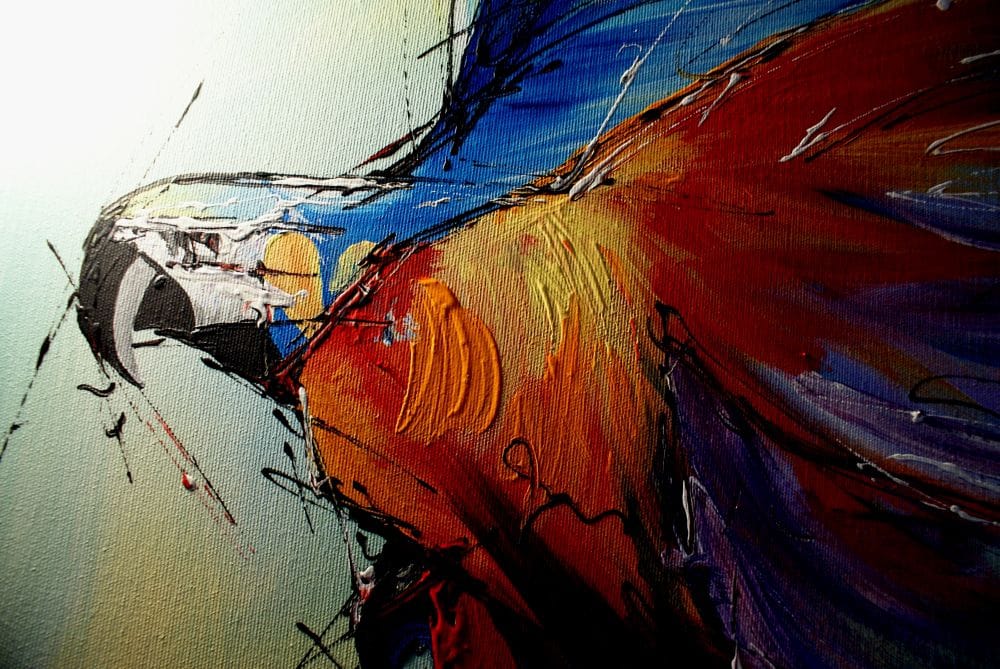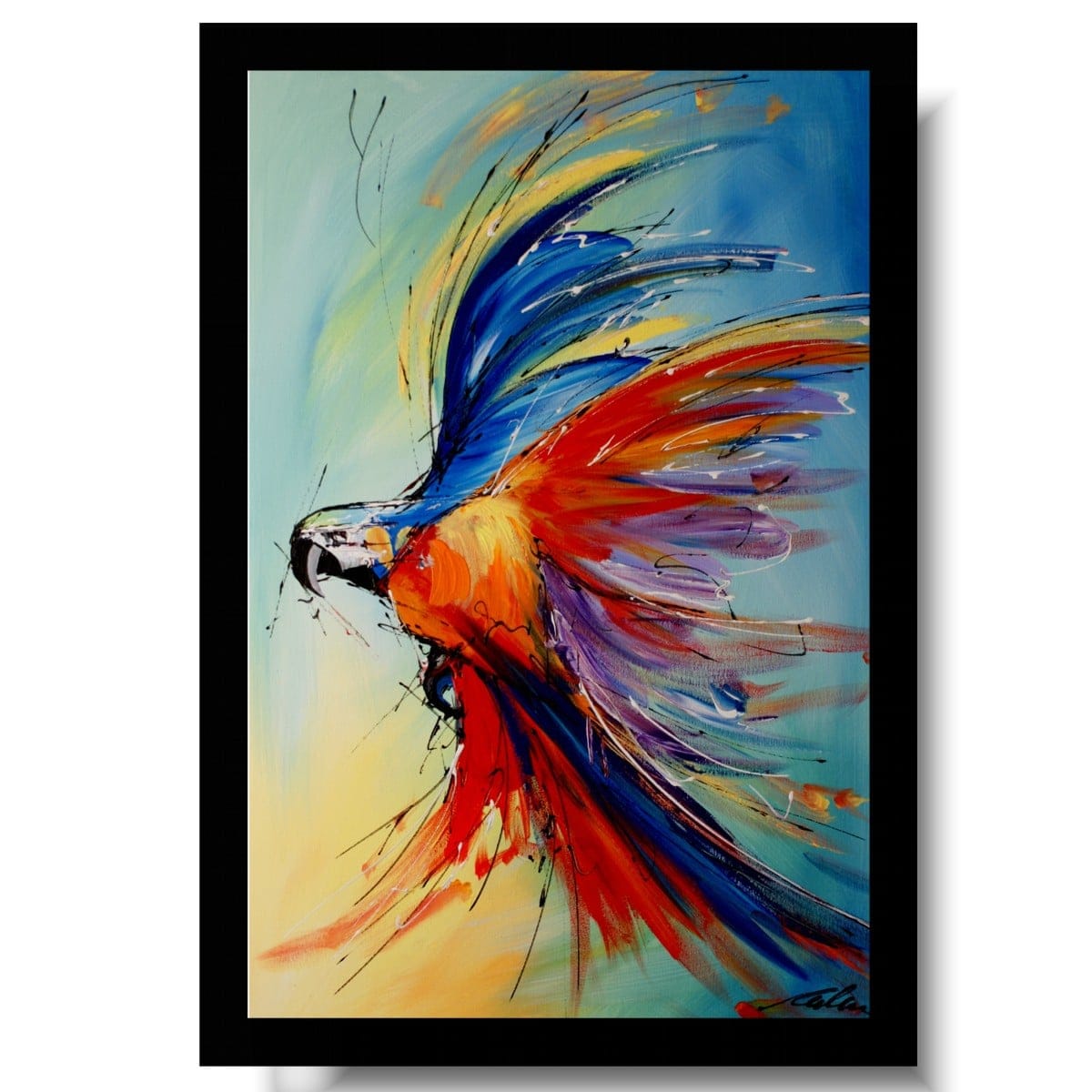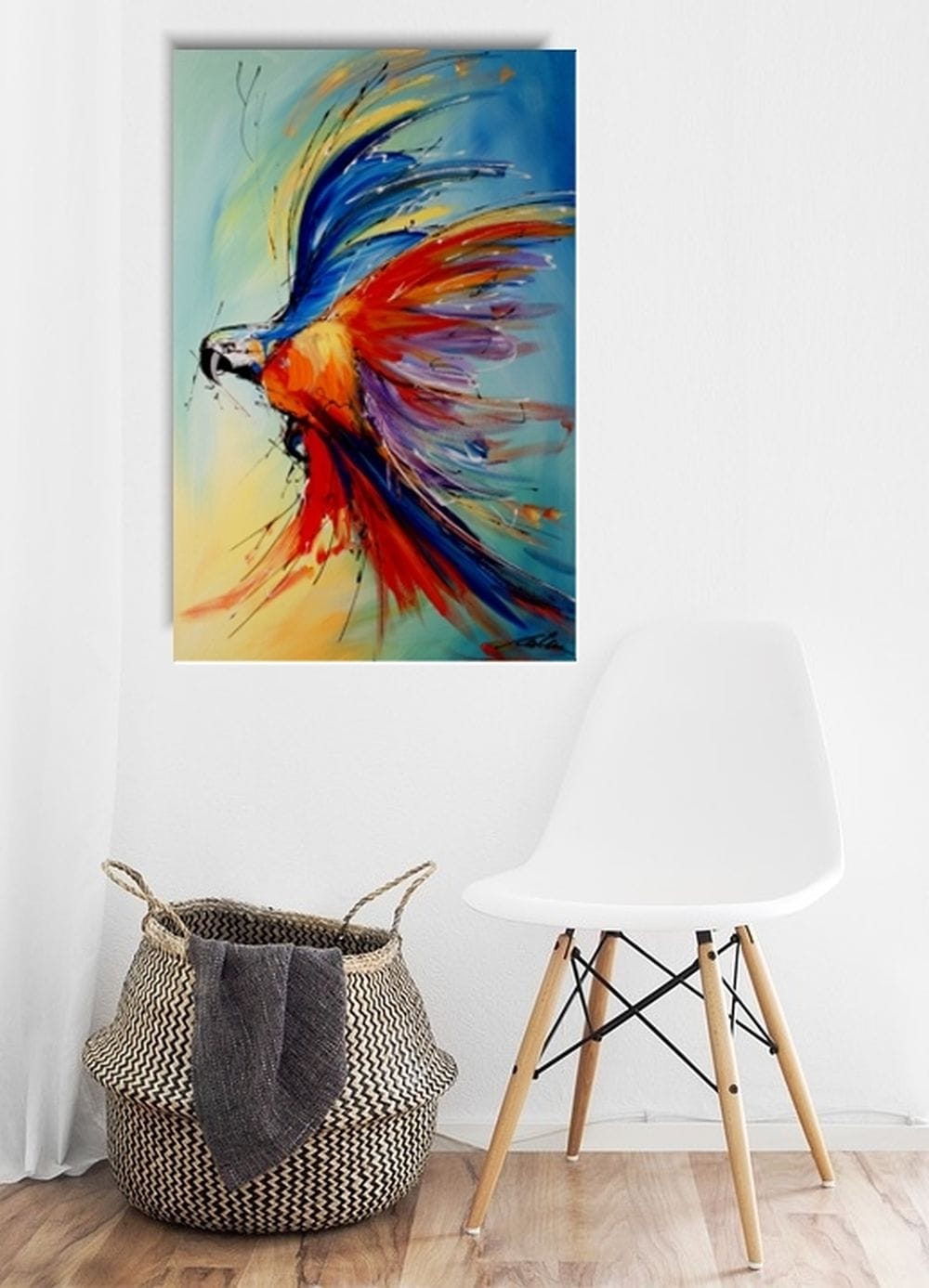 Obraz „Papuga ara” w ciekawej kolorystyce przedstawiający bajecznie kolorową papugę. Kolorowe obrazy to efektowne i bardzo piękne dekoracje wnętrz, które nie tylko potrafią wypełniać puste przestrzenie ścian, ale też nadają wnętrzom szczególny klimat. Nowoczesny obraz jest niekonwencjonalny pod względem formalnym jaki i warsztatowym. Do namalowania tego obrazu użyto całej palety barw, co daje efekt nowoczesnego designu. Obraz może ożywić modne jednobarwne wnętrze – salon, biuro, korytarz, restaurację, pub.