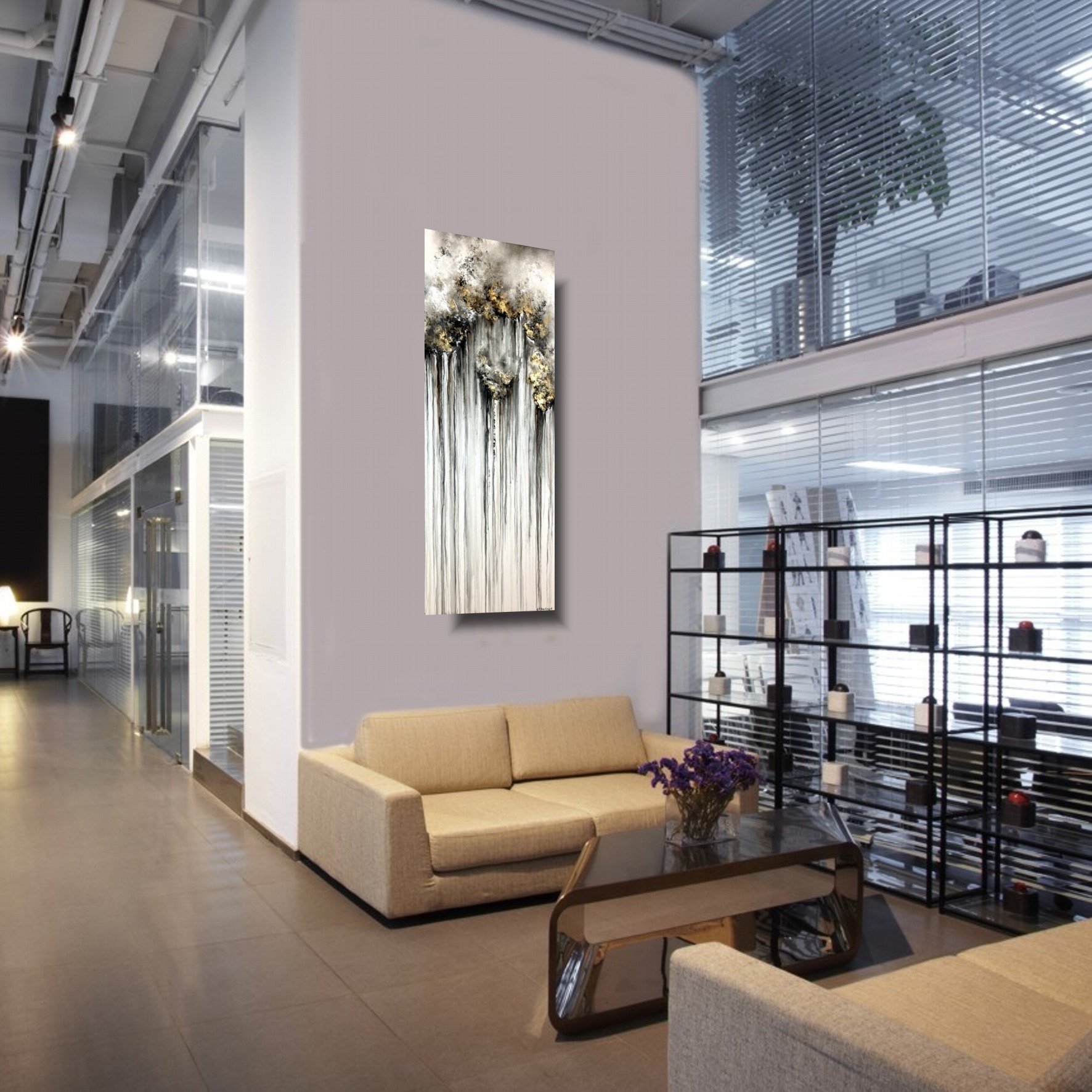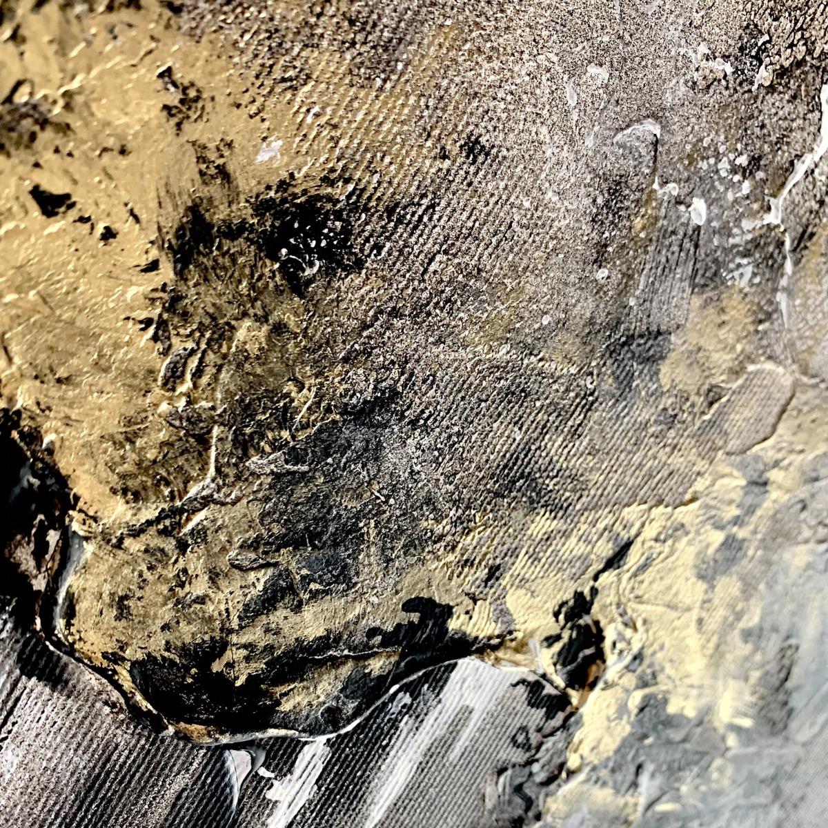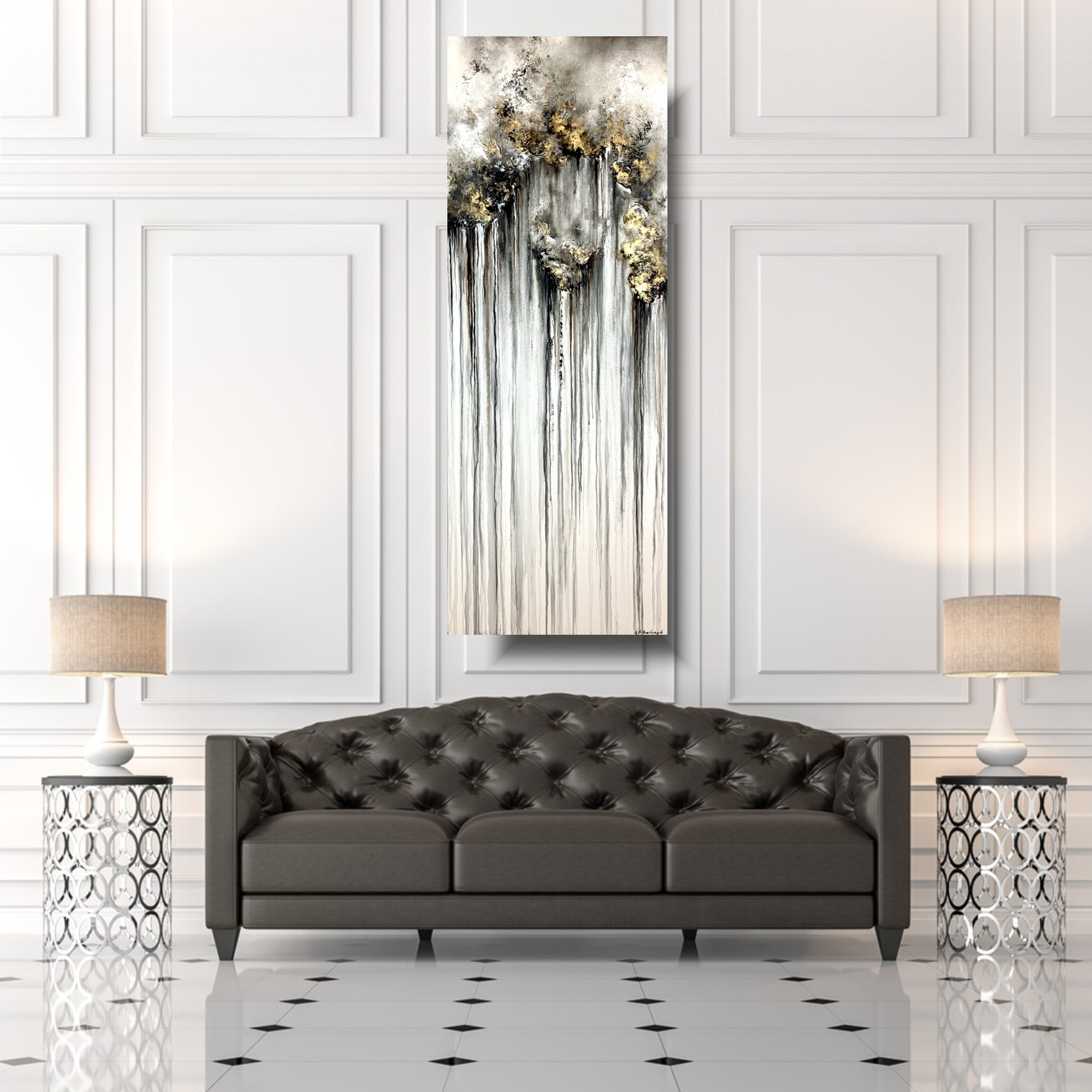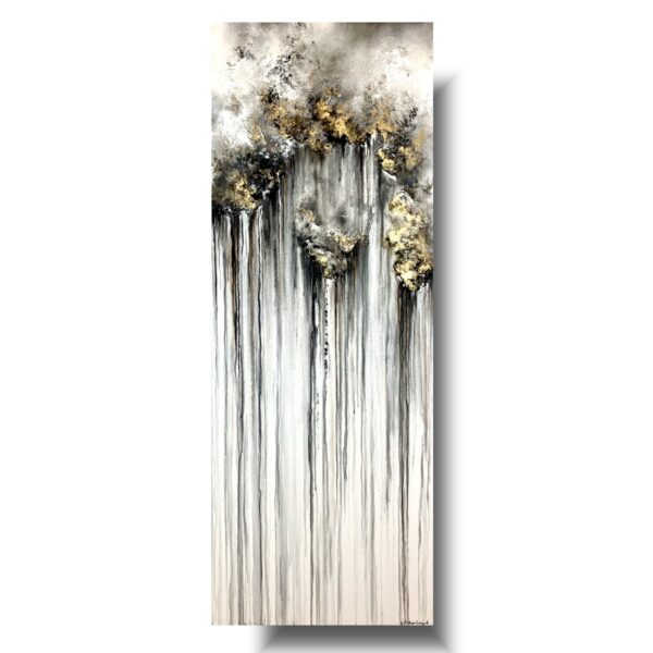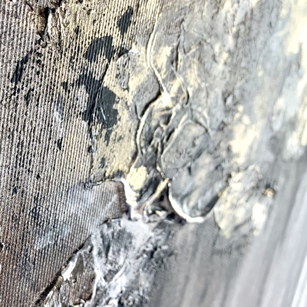 Obraz ręcznie malowany na płótnie „Genialne myśli” 2247A. Pionowy obraz abstrakcyjny przenosi nas w krainę spokoju i delikatności, gdzie beżowo złote chmury wydają się unosić w powietrzu. Kompozycja oddaje subtelność i spokojny ruch, tworząc wizualny spokój. Na płótnie widzimy warstwy odcieni beżu i szarości, które splatają się i unoszą, tworząc efekt chmur w ruchu. Ich lekkość muśnięta złotem uwidacznia niewyraźne granice wprowadzając do przestrzeni obrazu uczucie mgły i niematerialności. Światło, które tworzy się na obrazie poprzez użycie grubej faktury farby dodaje głębi i cienia, tworząc trójwymiarowy efekt, który wprowadza odbiorcę w bezpośredni wręcz namacalny kontakt z dziełem.