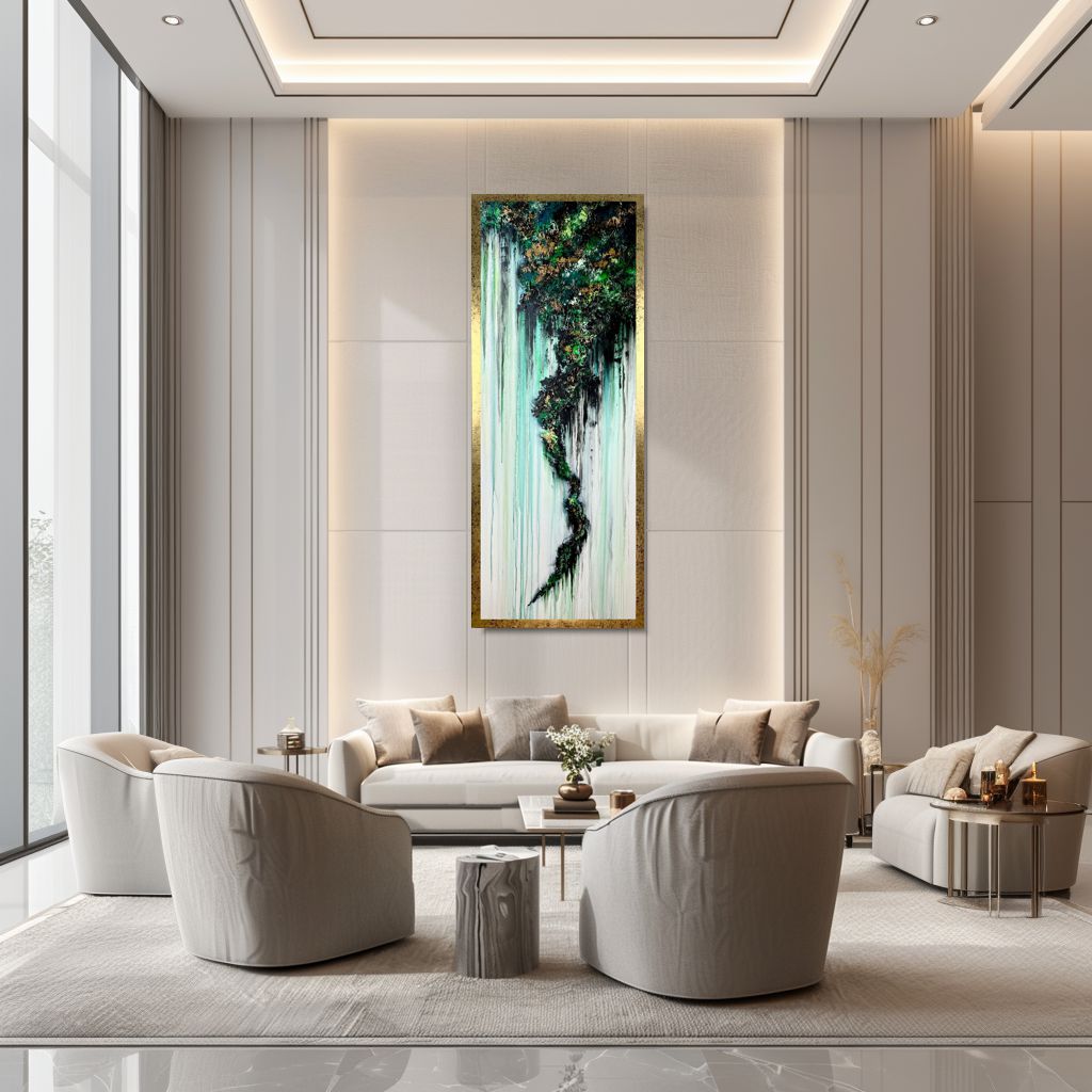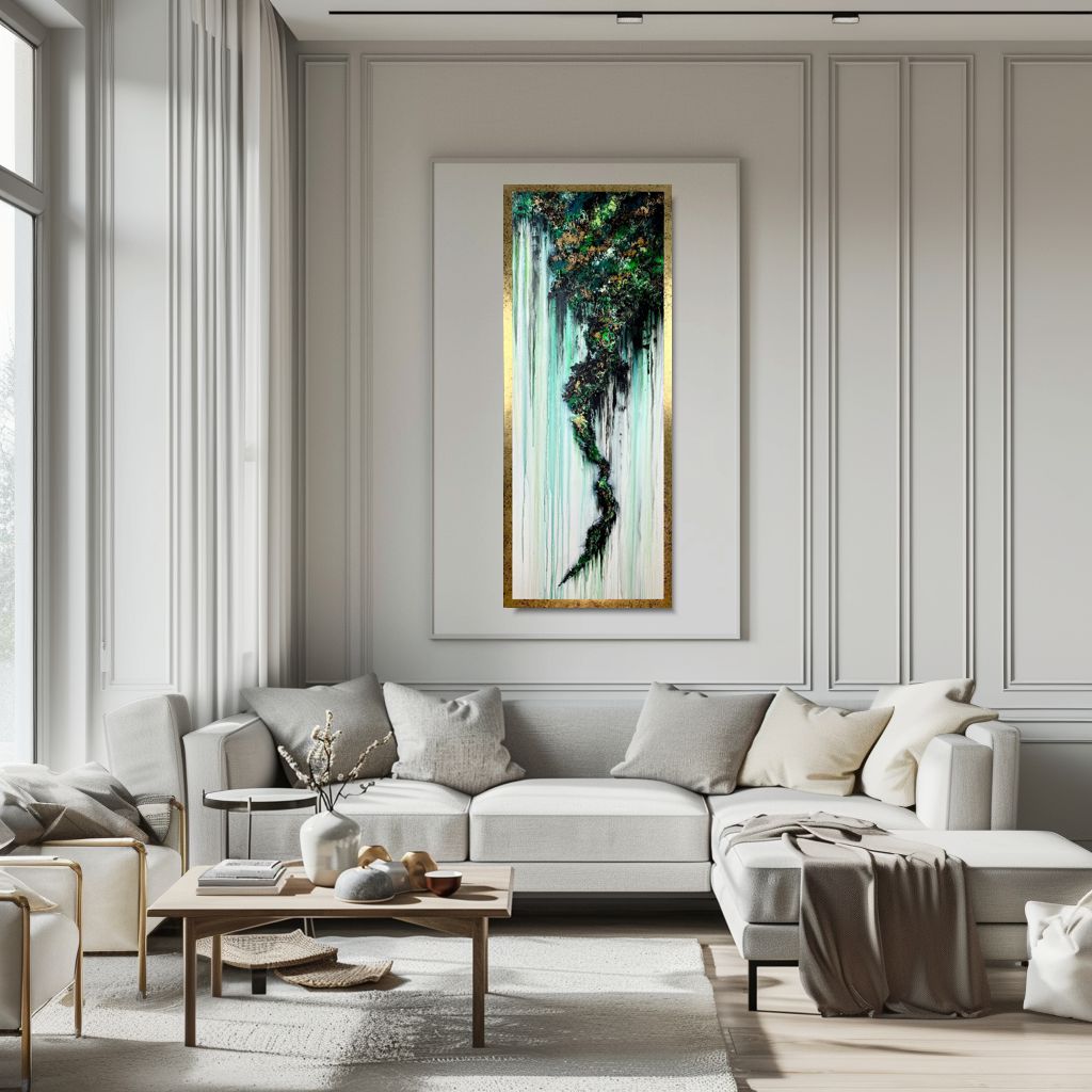 Obraz ręcznie malowany na płótnie „Złote urwisko” – zakrzywiona forma nierealnej abstrakcji obsadzona w malarskiej materii. Jej przekaz ze swoistą wypukłością formy to uproszczenie wizualnego zamysłu artysty w wielkoformatowym wydaniu. Obraz ręcznie malowany na płótnie „Złote urwisko” jest niekonwencjonalny pod względem formalnym jaki i warsztatowym. Duży pionowy obraz w pięknej stonowanej kolorystce z refleksami złota cieszy oczy. Abstrakcja to nasza specjalność dlatego inne klasyczne formy malarstwa staramy się przestawić w abstrakcyjny sposób. Obraz w dużym formacie, nowoczesne obrazy do salonu, modne obrazy do biura, eleganckie obrazy do mieszkania mogą ożywić każde wnętrze – dom, firmę, mieszkanie.