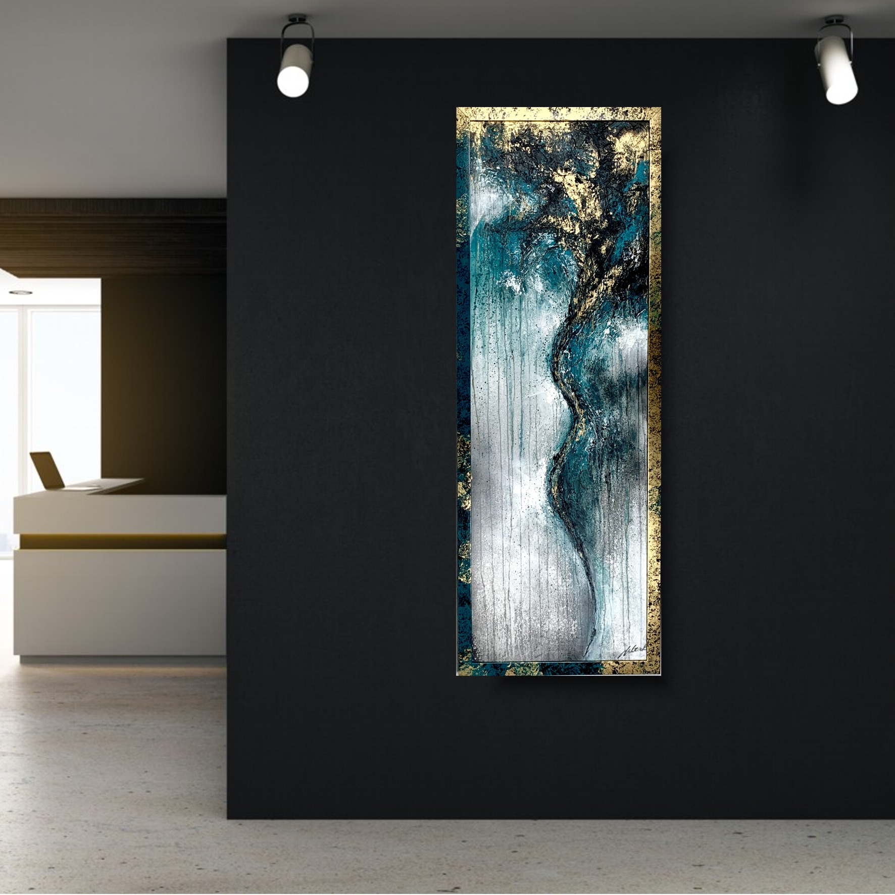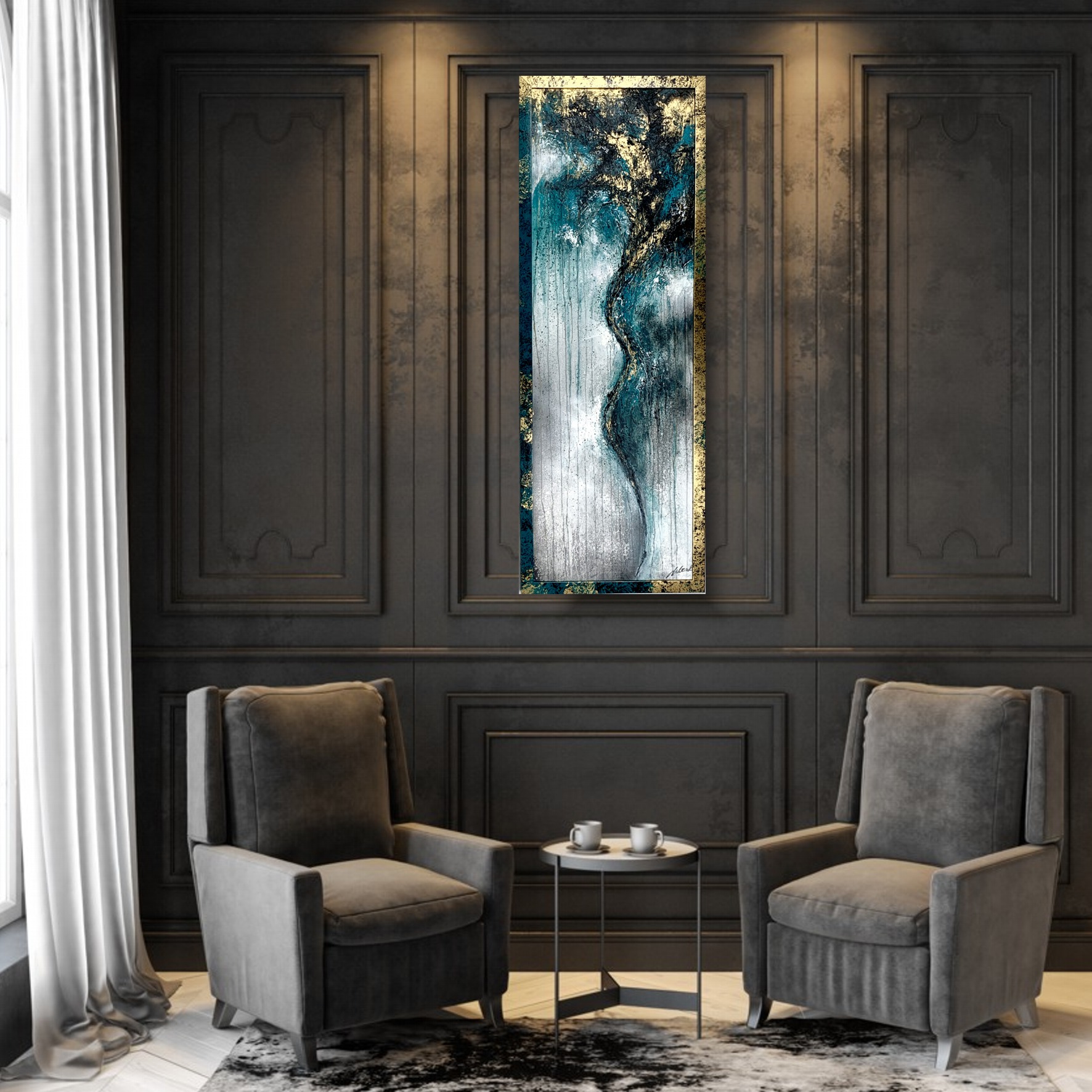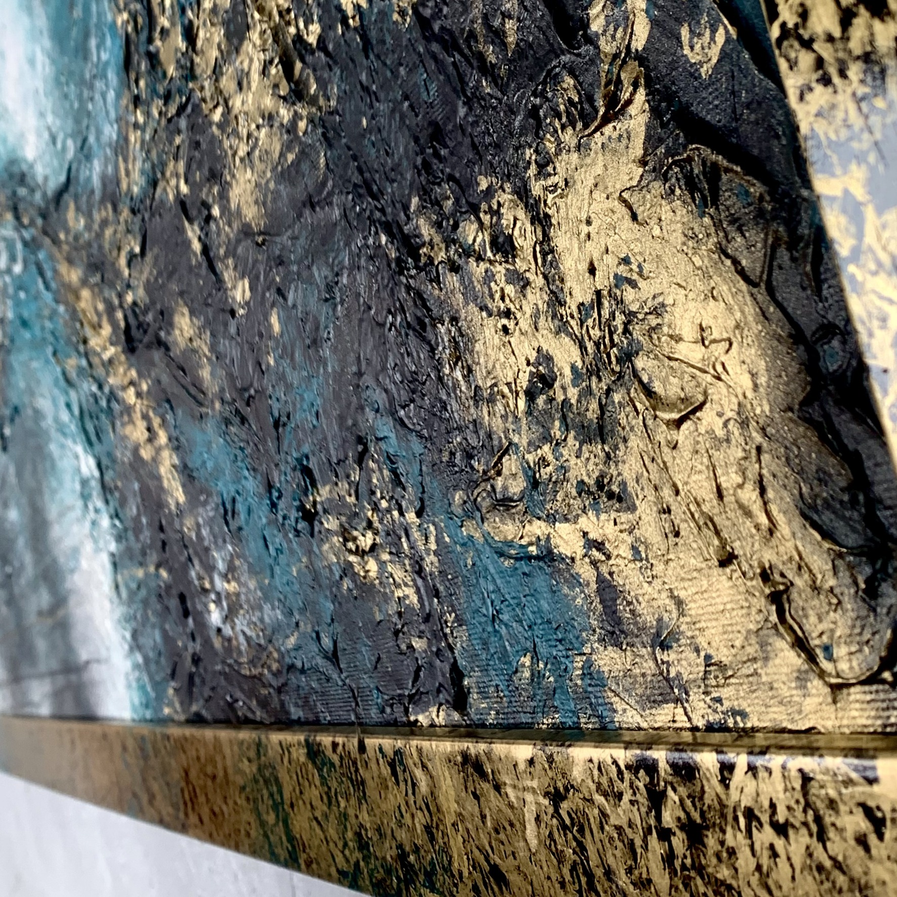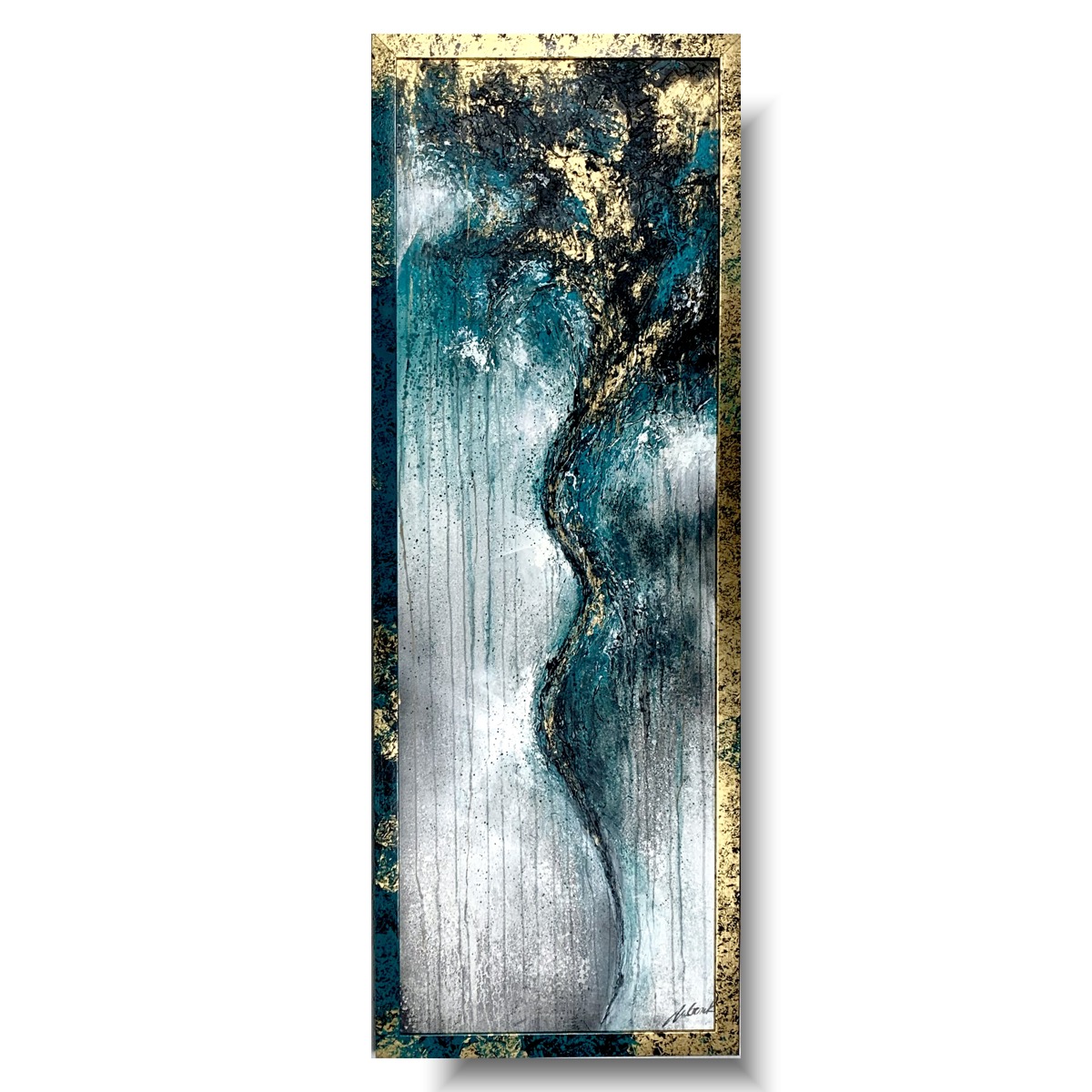 Kolorystyka obrazu: złoty, turkusowy, szary, biały, czarny + złoto-turkusowa przecierana rama (szerokość listwy 4cm)